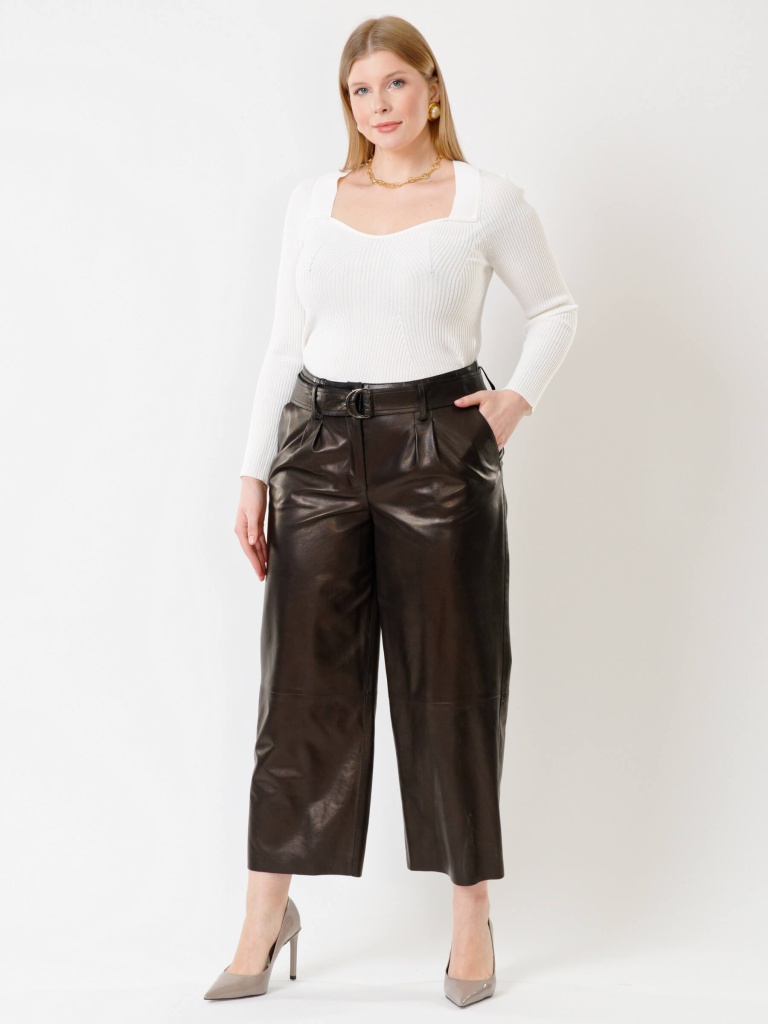 - Для офиса. Если дресс-код позволяет, кожаные или замшевые брюки можно вписать в деловой образ. Выбирайте лаконичные модели — прямого кроя или со стрелками. Сверху — мягкий однотонный свитер, блуза или водолазка, а поверх — структурированный жакет, удлинённый блейзер или жилет. Дополните образ ботильонами на устойчивом каблуке, строгой кожаной сумкой.