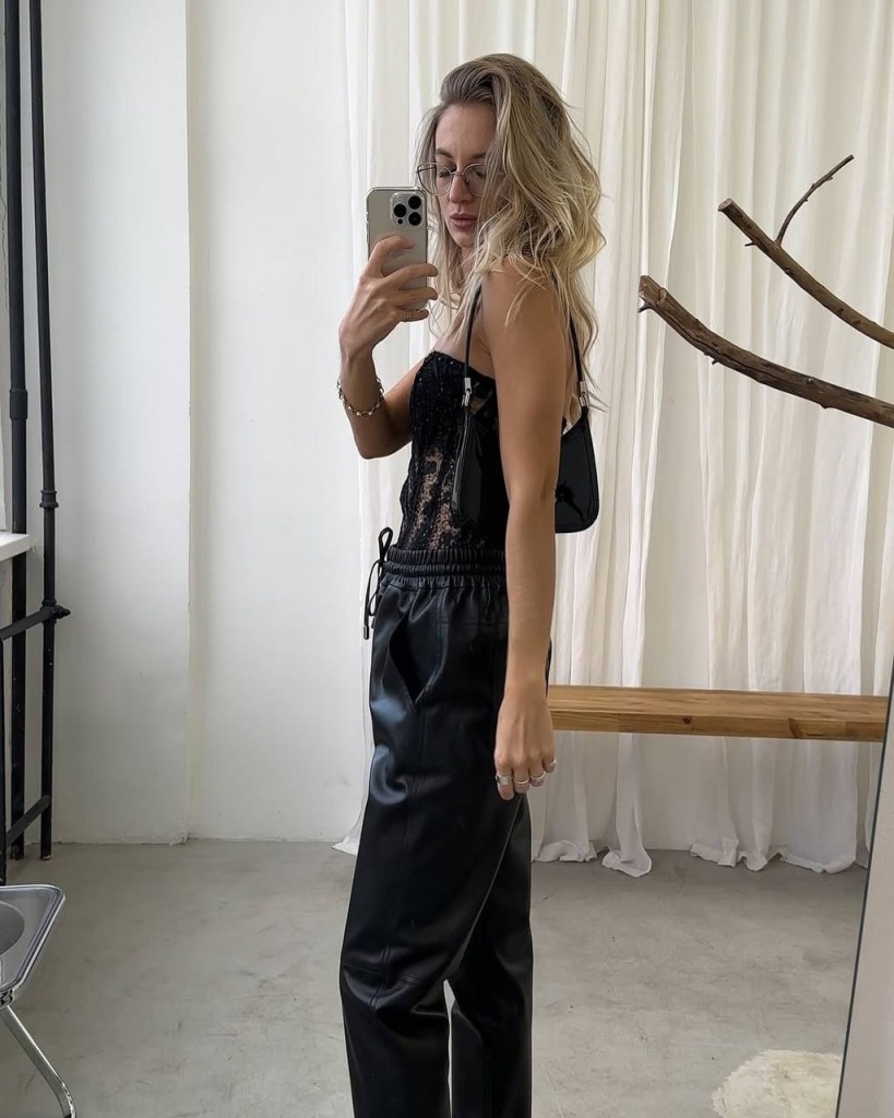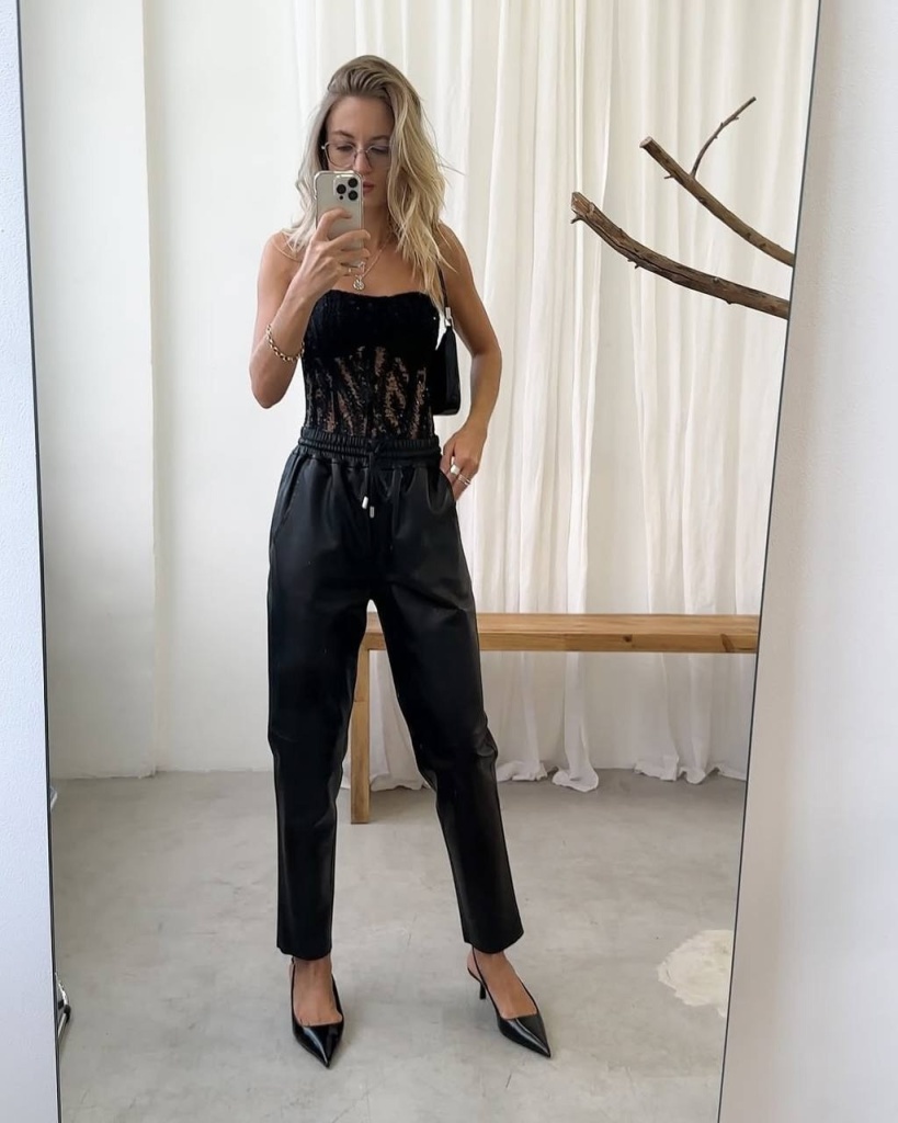 - Для вечера. Кожаные брюки сами по себе эффектны, поэтому для вечернего выхода достаточно добавить немного блеска или акцентов: шёлковый топ на тонких бретелях, облегающая блуза, кожаные пиджак или рубашка. Из обуви подойдут туфли на каблуке, высокие сапоги или босоножки с ремешками. И не забудьте о клатче или миниатюрной сумочке.
