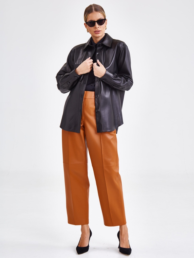 Универсальная и беспроигрышная модель, которая отлично впишется как в офисный, так и в повседневный гардероб. Прямые кожаные или замшевые штаны легко комбинируются с рубашками, водолазками, жакетами, а в качестве обуви подойдут как туфли на каблуке, так и лоферы или сапоги. Такой фасон визуально вытягивает силуэт, придаёт образу сдержанную элегантность.