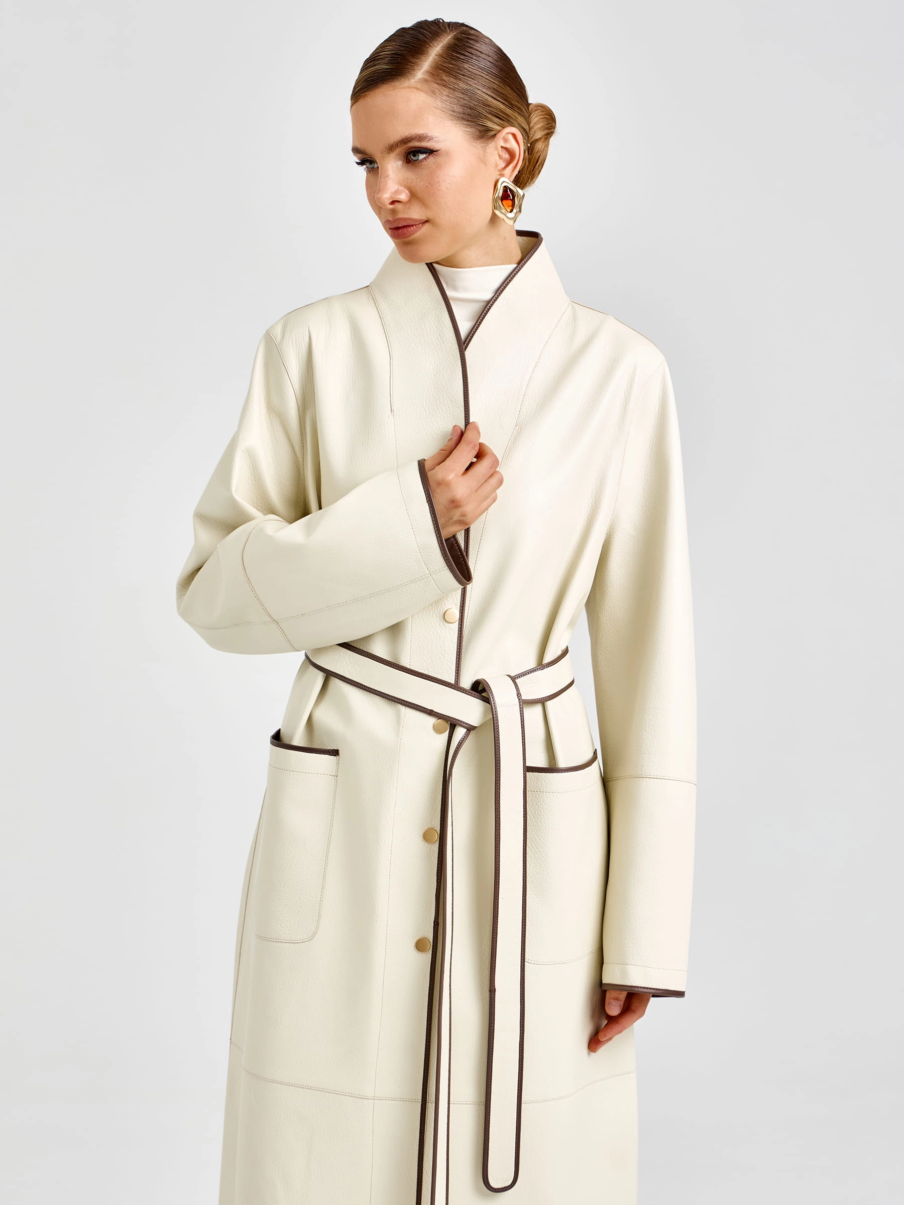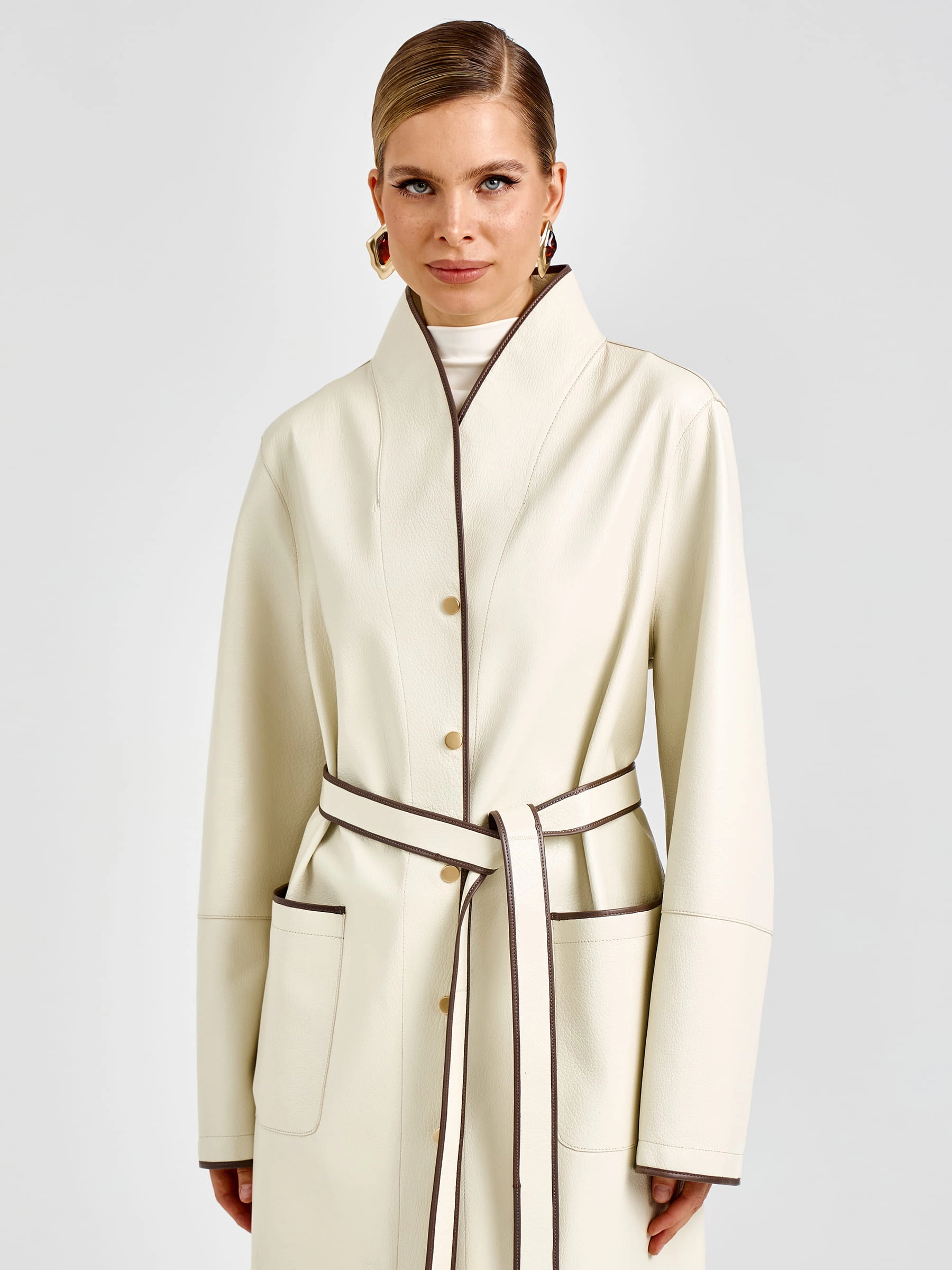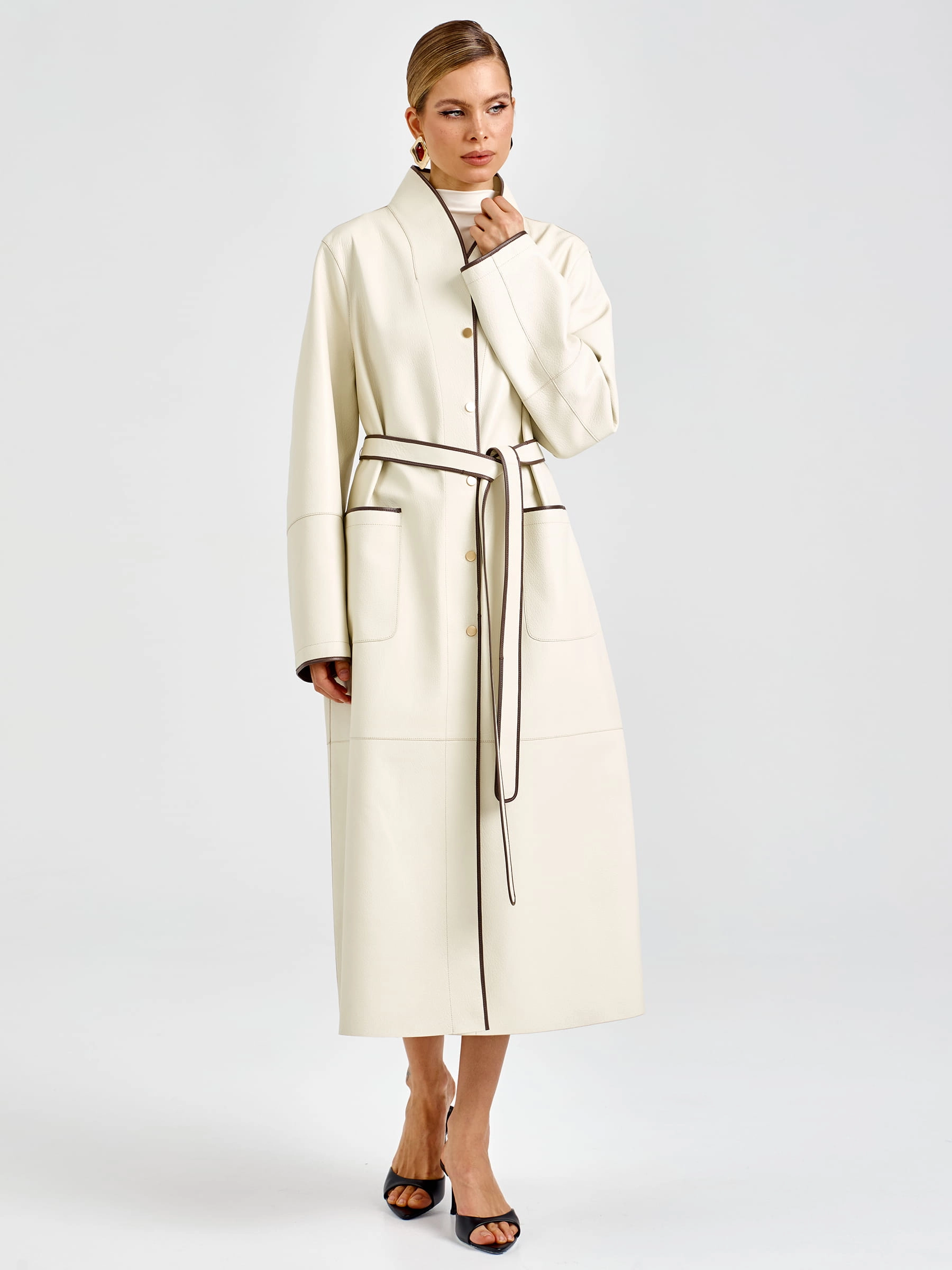 Роскошный белый плащ длиной 125 см из мягкой кожи премиального качества прямого кроя: элегантный шалевидный воротник и боковые накладные карманы создают эффектный силуэт, а длинный пояс-лента позволяет регулировать посадку по фигуре. Застёжка на кнопках добавляет практичности и лаконичности. Совет стилиста: носите с кожаными брюками и сапогами-ботфортами для дерзкого вечернего образа или с платьем-миди и ботильонами для романтичного выхода — этот плащ станет вашей инвестицией в безупречный стиль и подарит ощущение роскоши в любой ситуации.