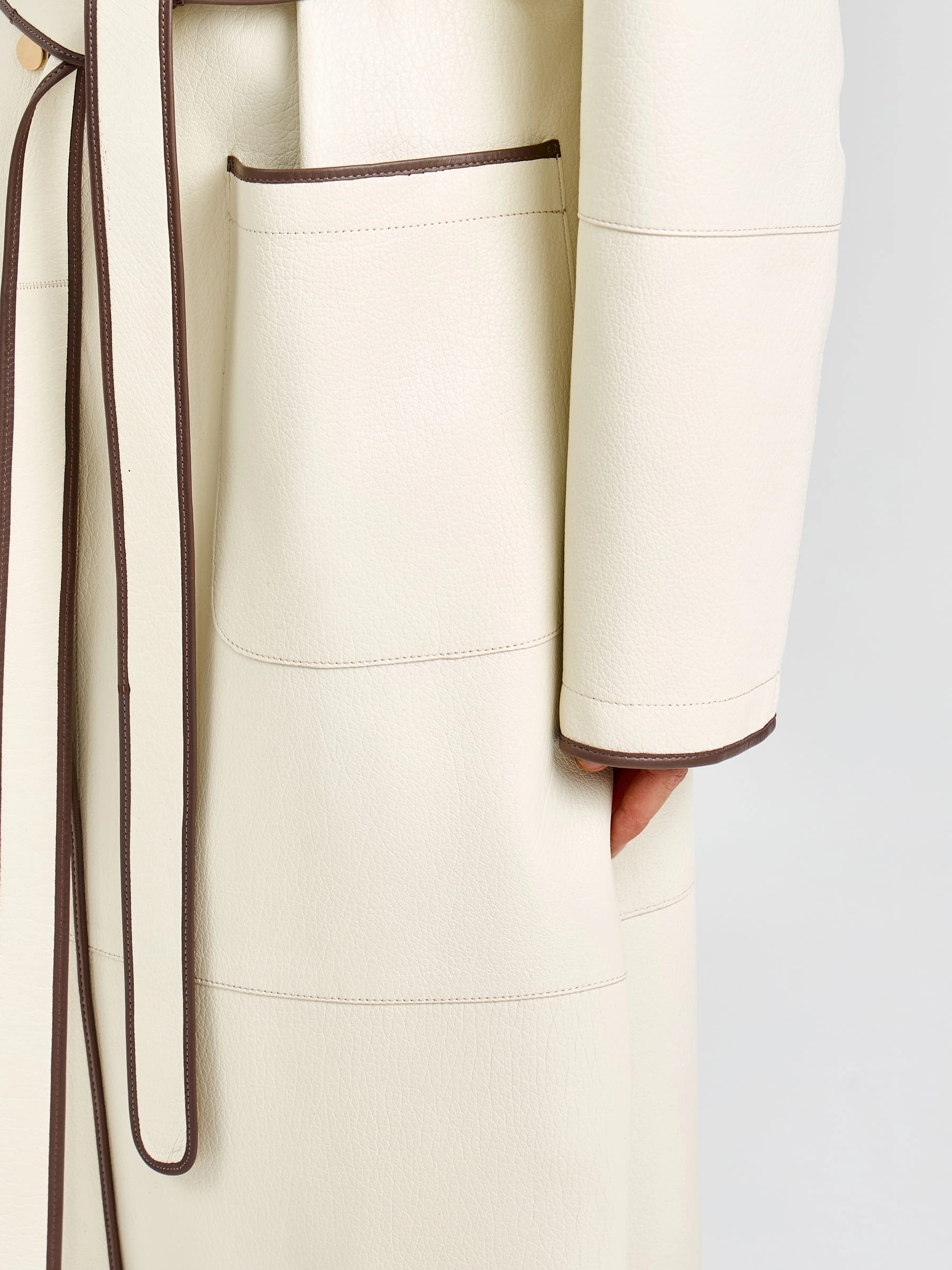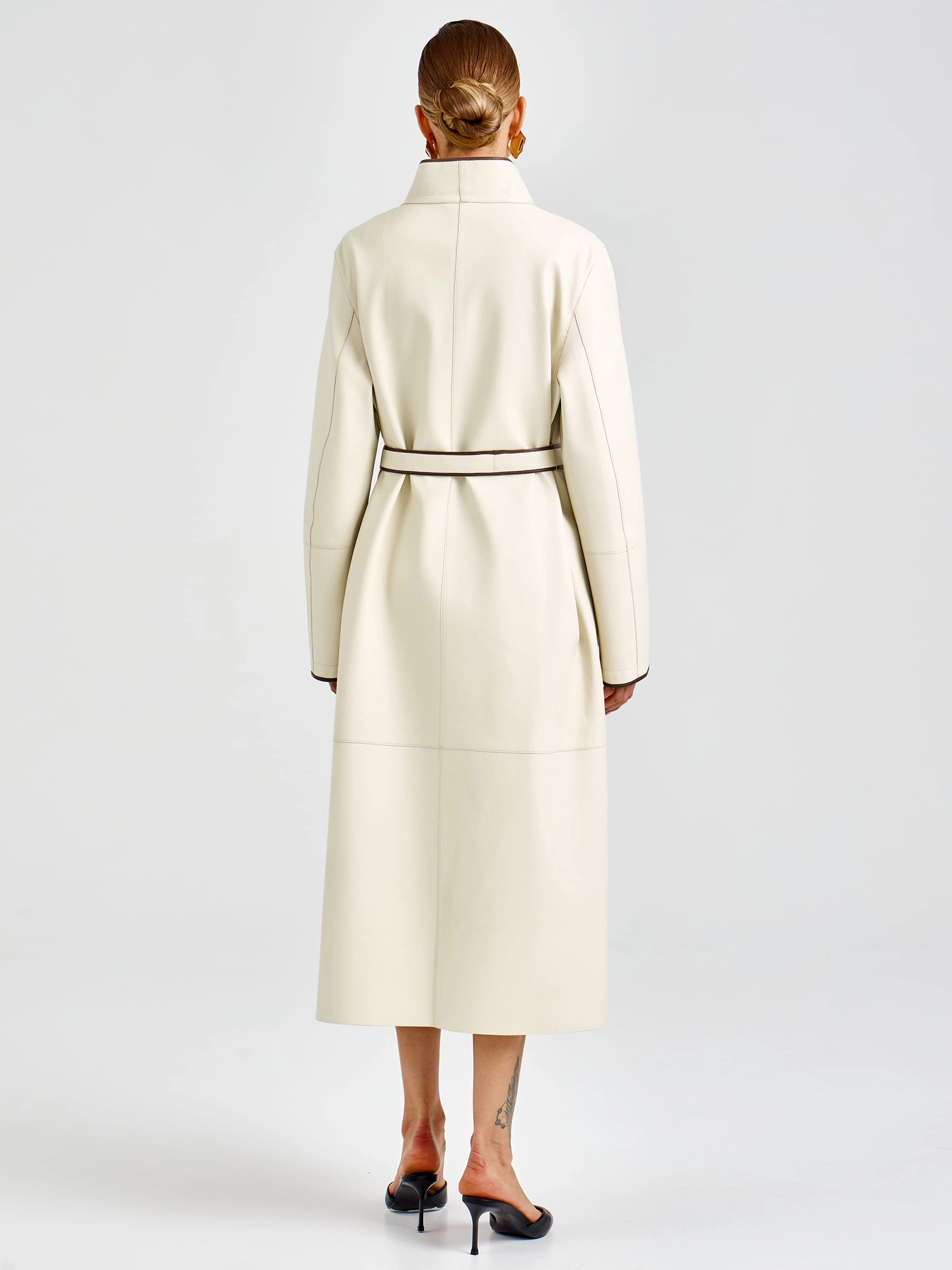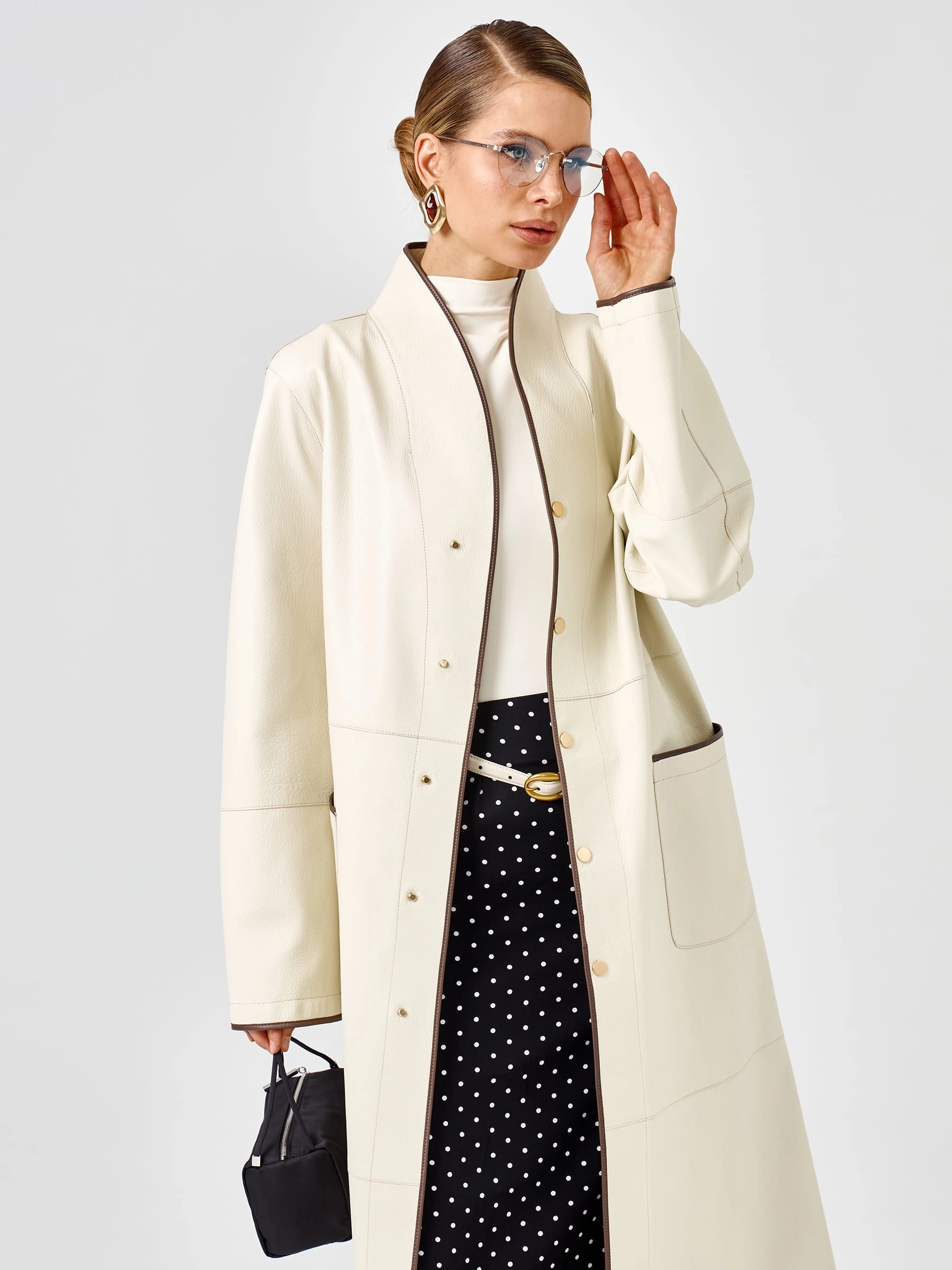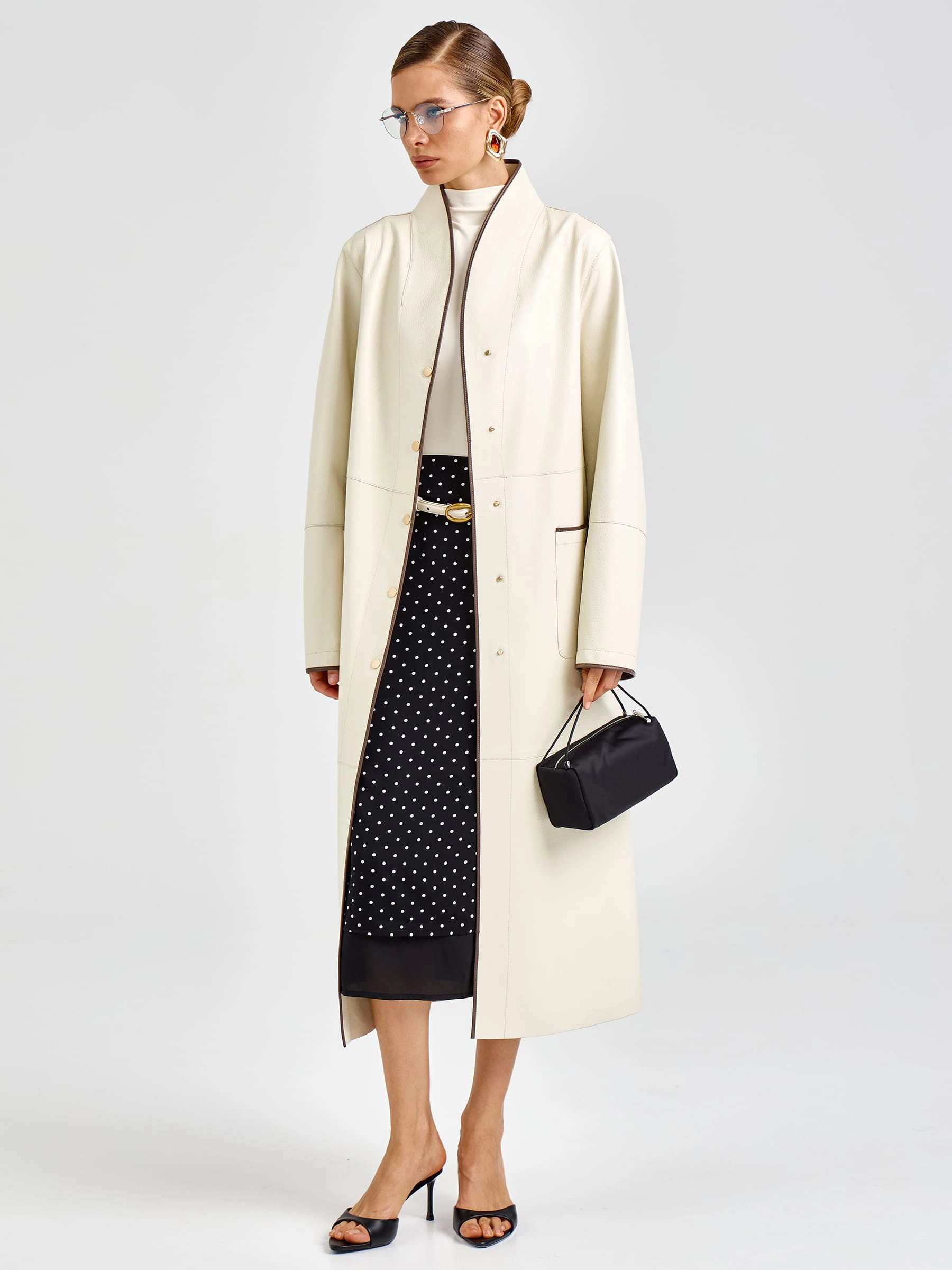 Роскошный белый плащ длиной 125 см из мягкой кожи премиального качества прямого кроя: элегантный шалевидный воротник и боковые накладные карманы создают эффектный силуэт, а длинный пояс-лента позволяет регулировать посадку по фигуре. Застёжка на кнопках добавляет практичности и лаконичности. Совет стилиста: носите с кожаными брюками и сапогами-ботфортами для дерзкого вечернего образа или с платьем-миди и ботильонами для романтичного выхода — этот плащ станет вашей инвестицией в безупречный стиль и подарит ощущение роскоши в любой ситуации.