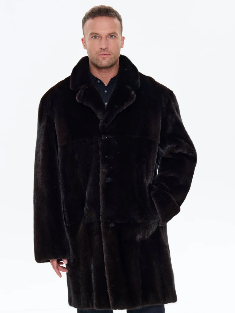 Классическую мужскую шубу пошили из густого меха норки премиум-класса. Строгий английский воротник - подчеркивает аристократизм, совместим с галстуком и шарфами, а прямой крой подчеркивает мужественную строгость».Универсальная длина - закрывает бедра, баланс тепла и мобильности. Полное отсутствие декора акцентирует качество меха. Не высокая шлица сзади улучшает подвижность при ходьбе. Изделие отлично сохраняет тепло в морозную погоду. Модель дополнили двумя внутренними и двумя боковыми карманами. Застежка: пуговицы.