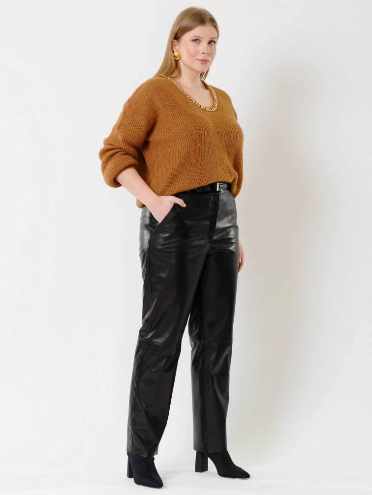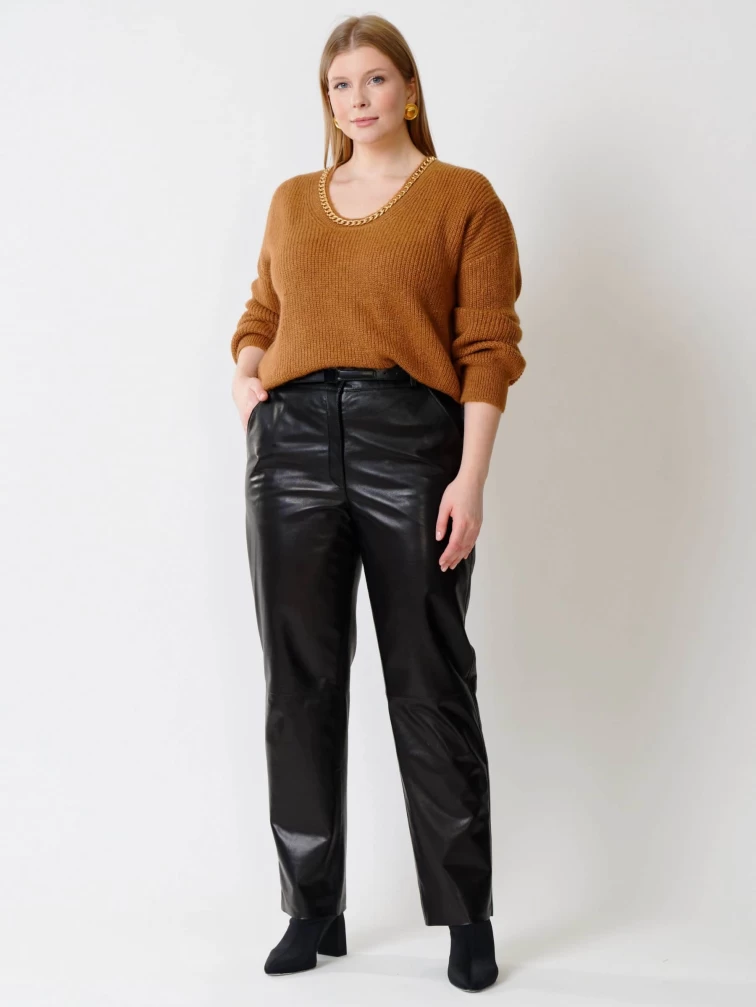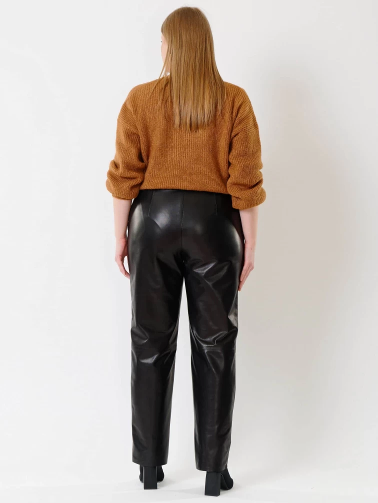 Товар черные прямые женские кожаные брюки 04, размер 52, артикул 85392 выполнен из натуральной кожи с застежкой молния. Рассчитан на сезон: демисезон. Длина изделия 105 см, силуэт свободный.