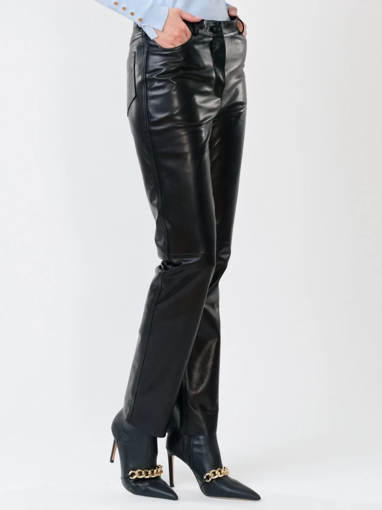 Строгие зауженные брюки из натуральной черной кожи воплощают современную элегантность. Классический прямой силуэт со средней посадкой подчеркивает женственный образ, сохраняя при этом максимальный комфорт. Идеальная длина 105 см создает визуальную стройность. Четыре продуманных кармана - два накладных спереди и два скрытых сзади - сочетают функциональность с чистотой линий. Глубокий черный цвет открывает безграничные возможности для создания образов: от офисных ансамблей с классическими блузами до дерзких вечерних луков с атласными топами или кожаными косухами. Эти брюки - образец вневременной стильности, где каждая деталь продумана для тех, кто ценит лаконичность и безупречный вкус.