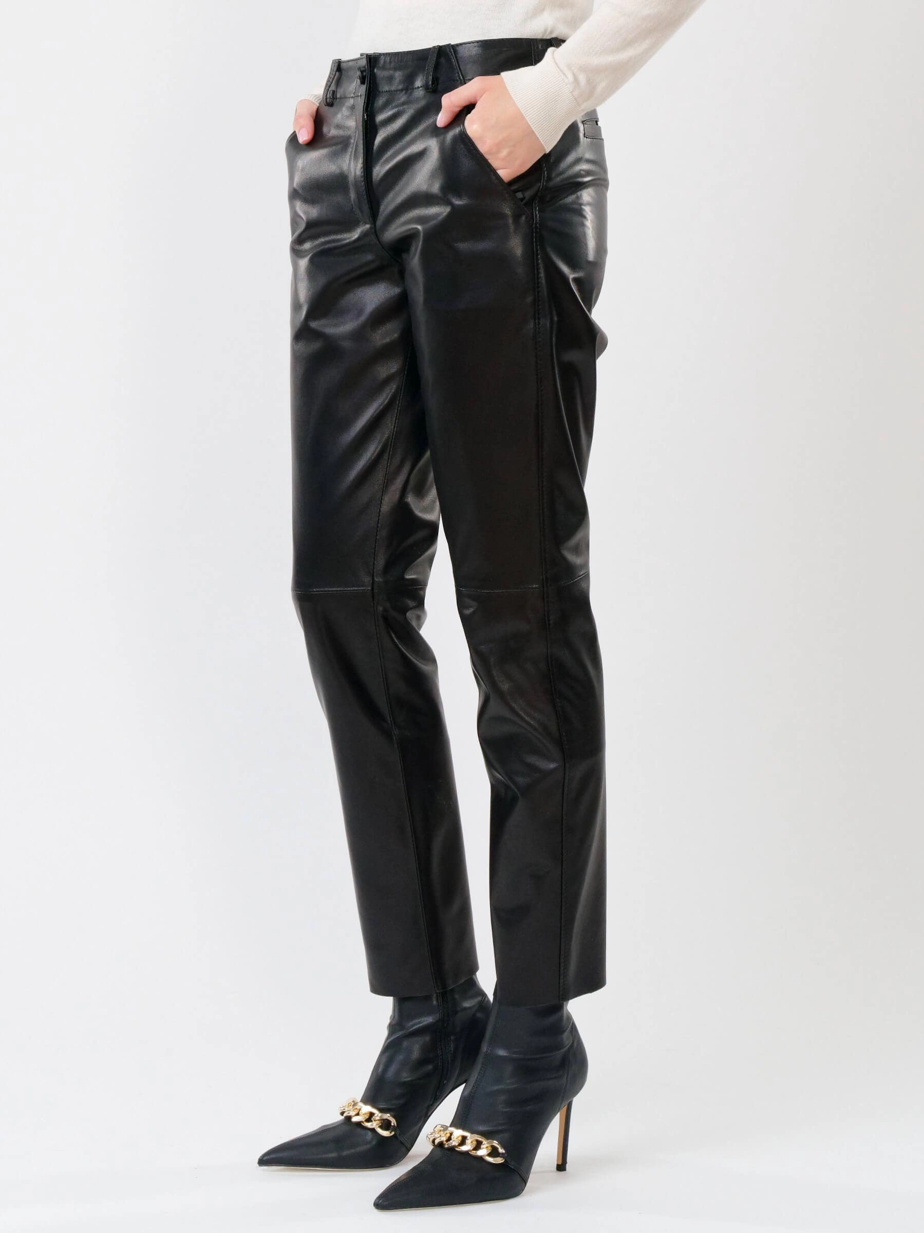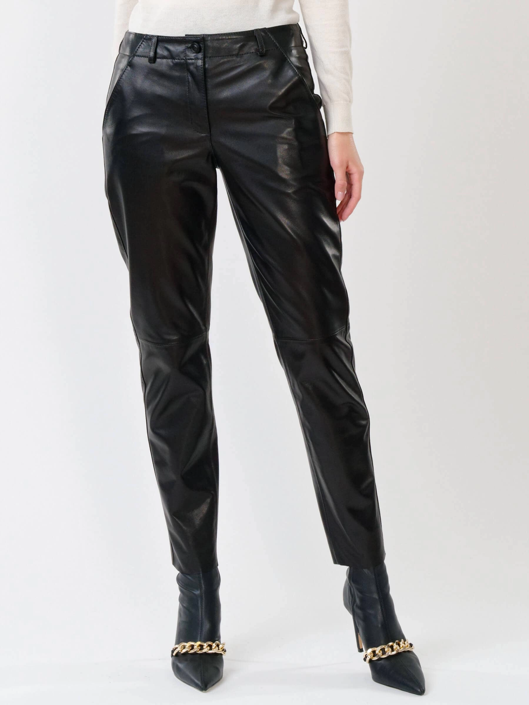 Элегантные женские зауженные брюки из натуральной кожи: модная длина 98 см, удобные врезные карманы, комфортная вискозная подкладка и аккуратная потайная молния с планкой. Идеальный крой дополнит и деловой образ с блузой, и повседневный look с кроссовками!