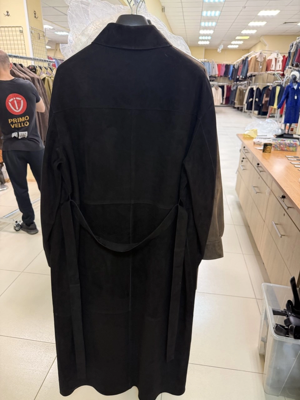 Два образа в одном и никаких компромиссов! Этот роскошный длинный плащ из черной натуральной замши премиум-класса — настоящая инвестиция в ваш стиль. Прямой крой длиной 133 см с модным спущенным рукавом и классическим отложным воротником выглядит безупречно лаконично. Продуманная система карманов — два нагрудных и два боковых врезных — добавляет функциональности, не нарушая чистоты линий. Застежка на кнопках (как на изделии, так и на манжетах) поддерживает минималистичную эстетику. Особый шик модели — полное отсутствие подкладки, благодаря чему плащ удивительно легкий, а мягкая замша прилегает к одежде с комфортом, создавая тактильно приятный и визуально дорогой образ. Но главный секрет — в трансформации: стоит завязать пояс, как струящийся прямой силуэт превращается в изящный, женственный, идеально подчеркивающий талию.