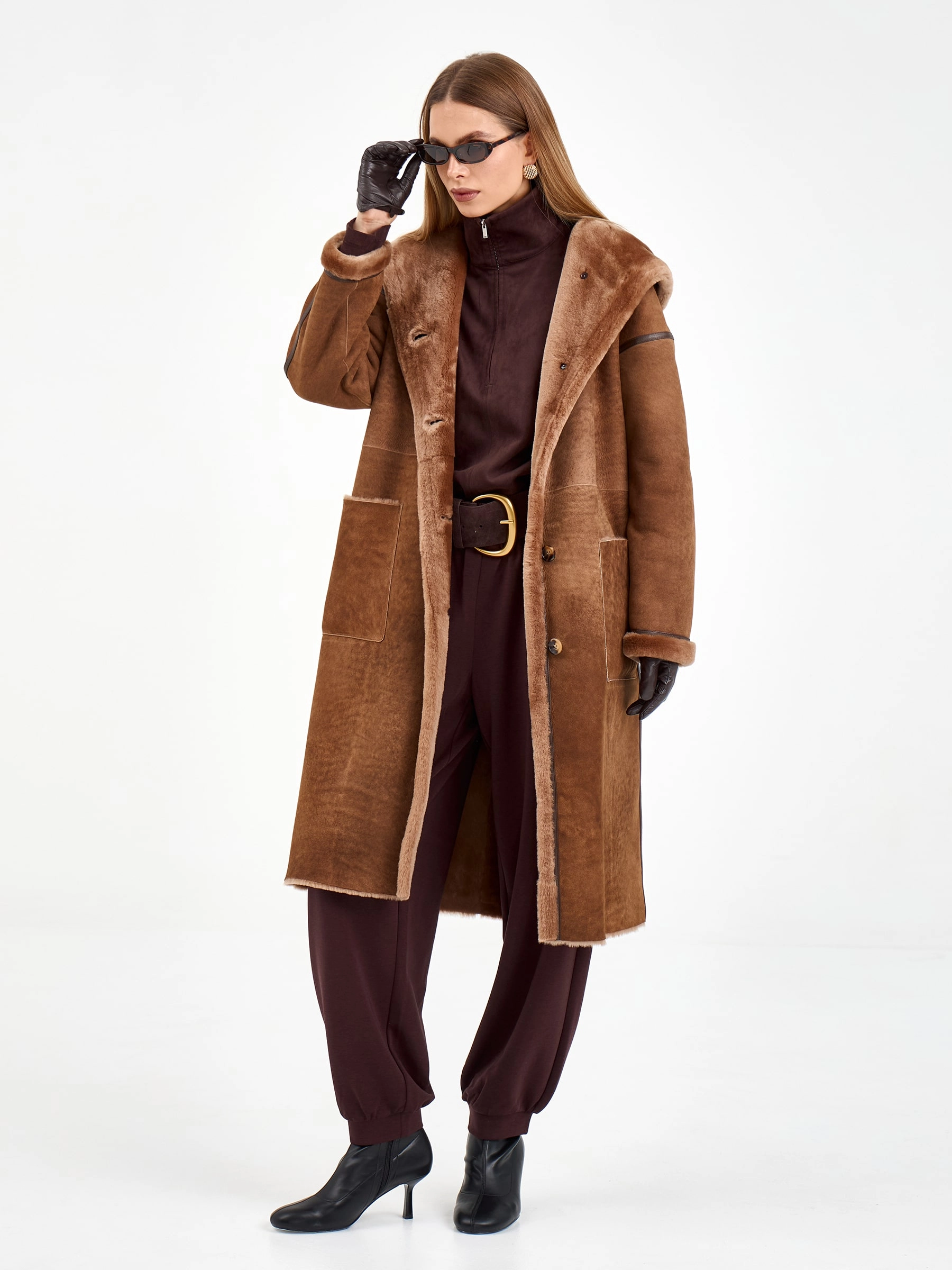 Длинная женская дубленка с капюшоном 2079, коричневая, размер 46, артикул 65120