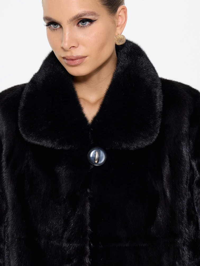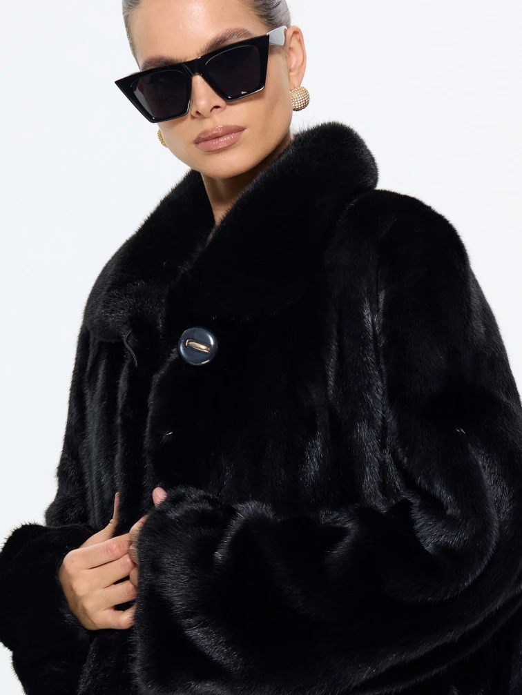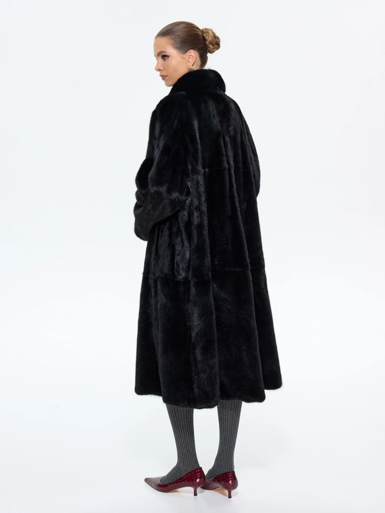 Черная норка. Силуэт «трапеция». Длина 110 см. Эта шуба — олицетворение чистой элегантности. Ее плавные, расширяющиеся книзу линии дарят фигуре изящество и скрывают все, что нужно, а глубокий черный цвет заставляет мех сиять по-особенному. Мягкий воротник «апаш» и удобные клипсы делают ее не только роскошной, но и невероятно комфортной для повседневной носки. Главный аксессуар: пусть это будет ваша шуба. Дополните образ минималистичными украшениями и качественной кожаной сумкой, чтобы не перегружать лук. Позвольте черной норке говорить за вас. Шепотом, который слышен издалека.