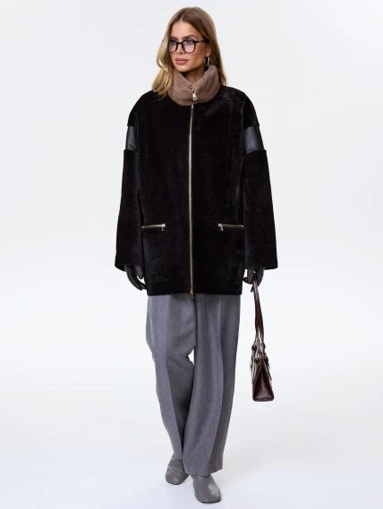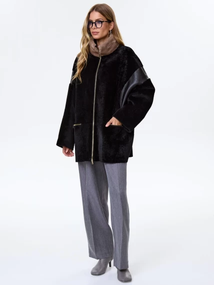 Для пошива короткой дубленки использовали нежную овчину в классическом черном цвете сочетании с гладкой стороной. Комфортный свободный крой не ограничивает движения. Боковые карманы как и само изделие застегиваются молниями. Объемный воротник - стойку дополнили густой норкой.