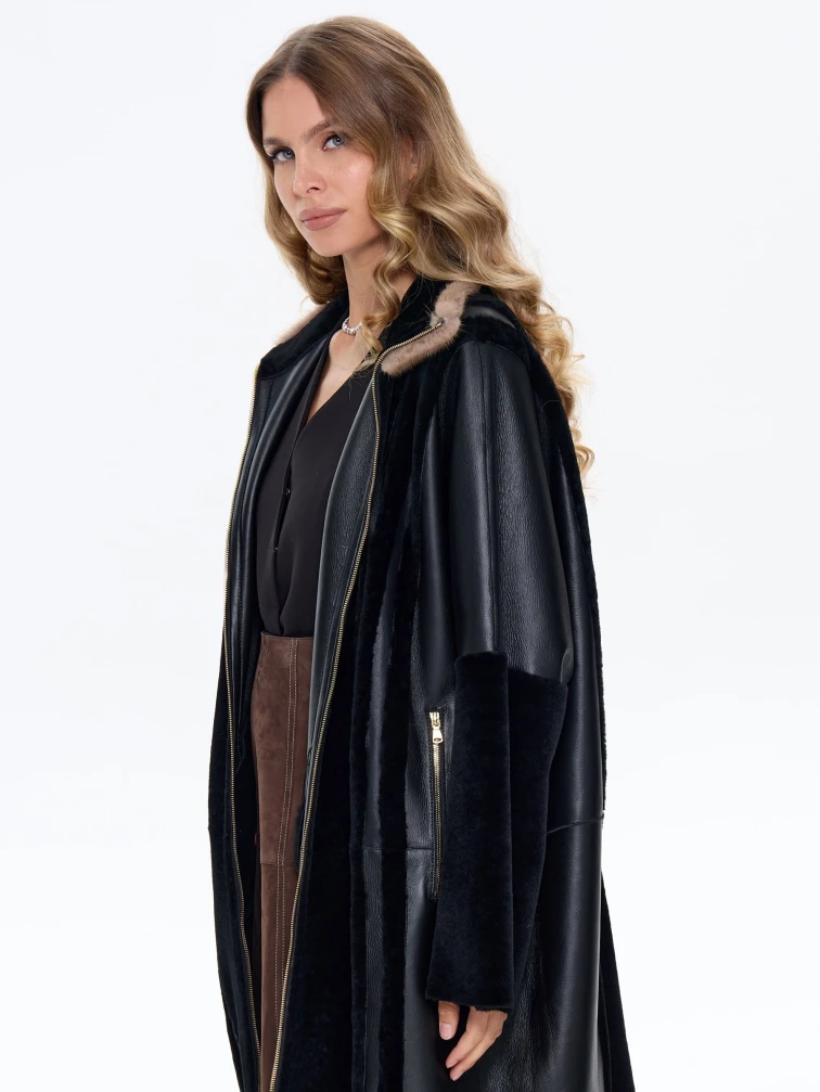 Очень лаконичная длинная дубленка в классическом черном цвете - прямое доказательство, что элегантной можно оставаться даже в холодные морозные дни. Модель свободного кроя выполнили из стриженной овчины с гладкой фактурой, для отделки использовали изнаночные бархатистые полосы. Дополнительной защитой от ветра послужил воротник-стойка из нежной пушистой норки. Два боковых кармана, как и само изделие застегиваются крупными молниями в цвете-золото.
