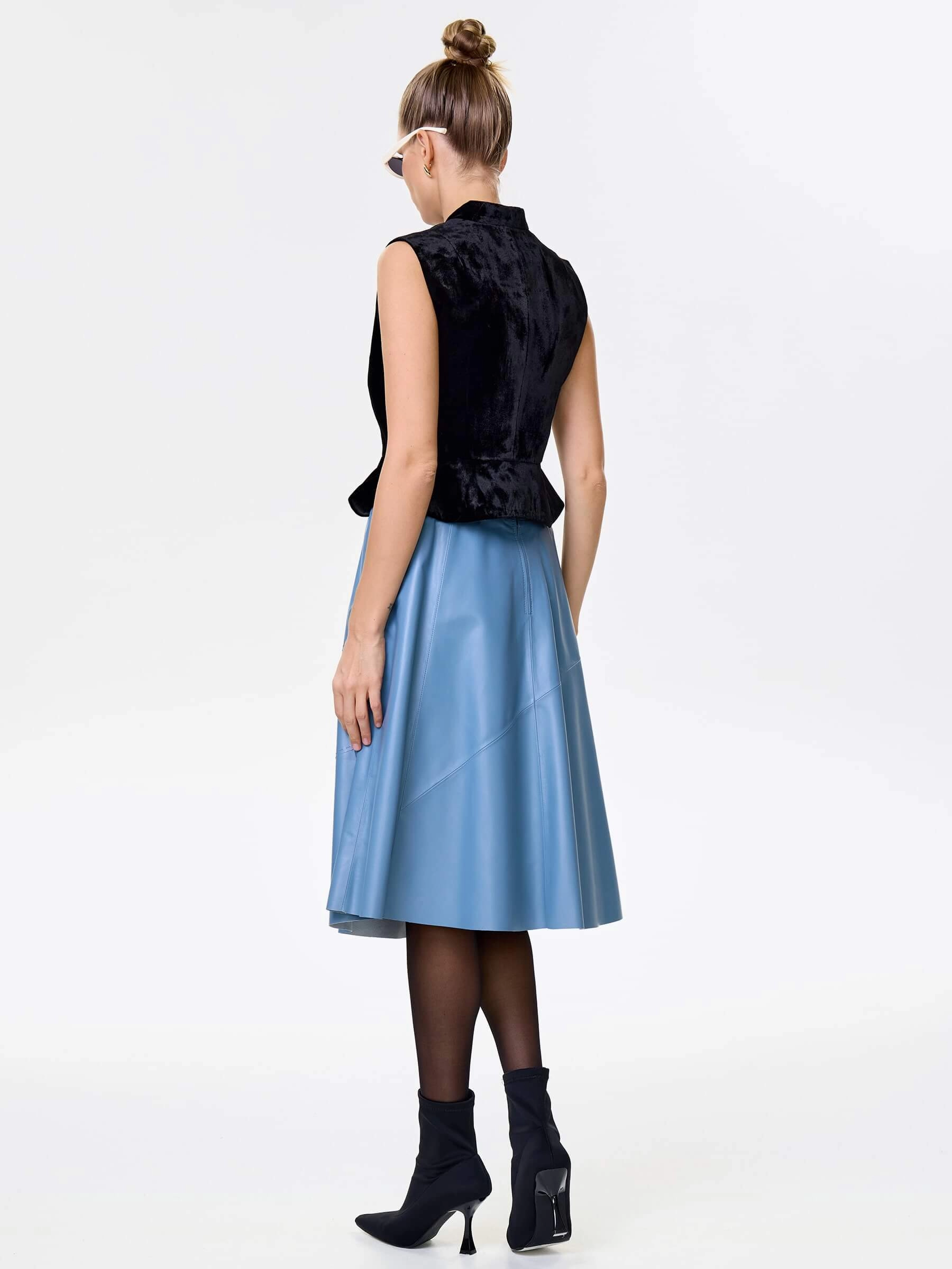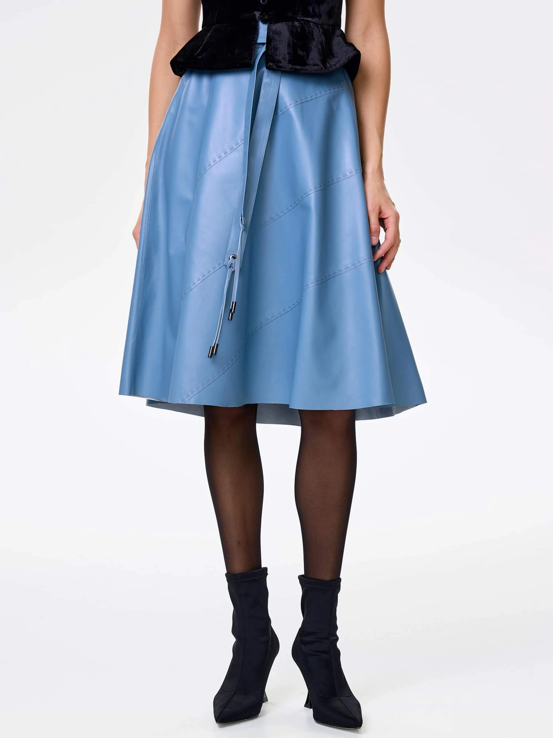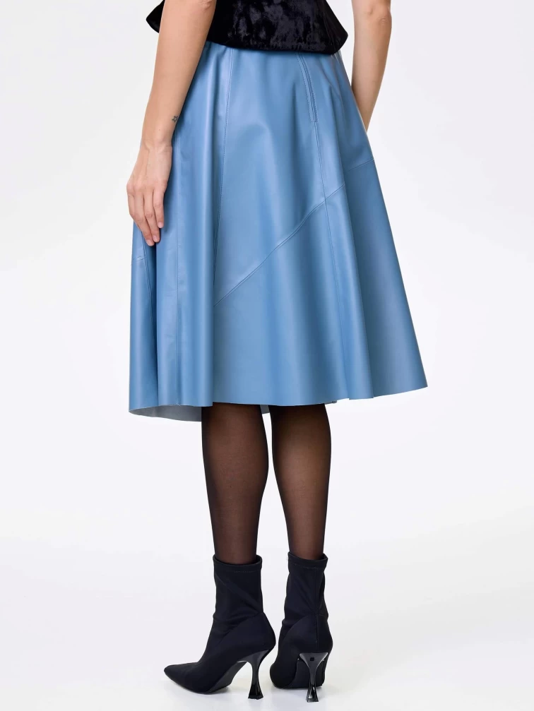 Товар голубая кожаная юбка 01рс, размер 46, артикул 85452 выполнен из натуральной кожи с застежкой молния. Рассчитан на сезон: демисезон. Длина изделия 70 см, силуэт расклешенный.