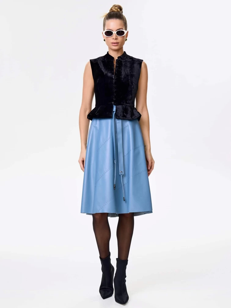 Элегантная расклешённая юбка из натуральной мягкой кожи нежного голубого оттенка с перламутровым переливом — это воплощение утончённости и свежести. Её облегающий крой подчёркивает женственные изгибы, а лёгкий клёш добавляет образу воздушности и динамики. Эксклюзивная ручная строчка, подчёркивает роскошь материала, а удлинённый пояс с декоративной пряжкой в виде волны придаёт модели неповторимый шарм. Потайная молния сзади сохраняет безупречные линии, делая эту юбку идеальным выбором для тех, кто ценит изысканность и индивидуальность.