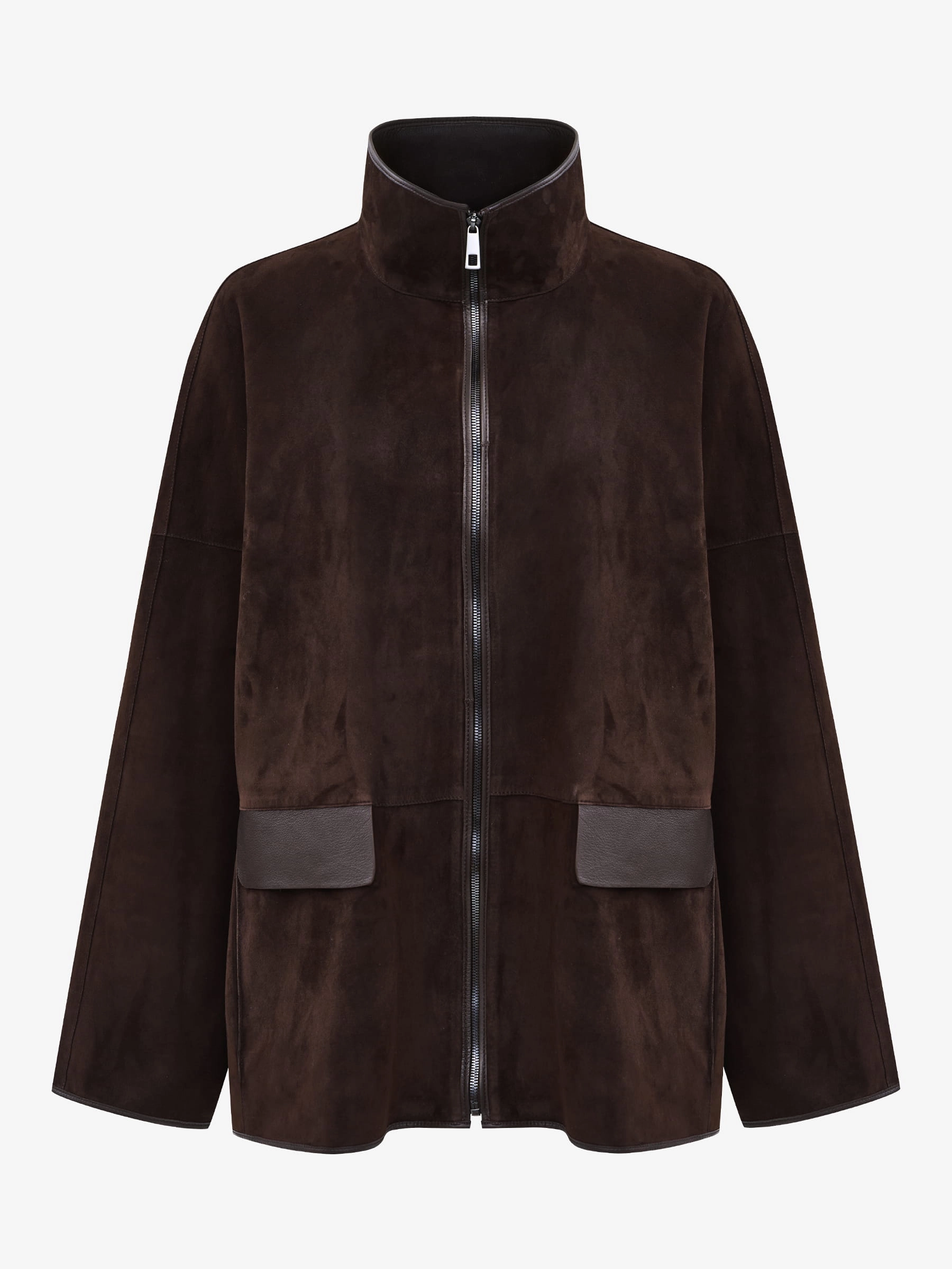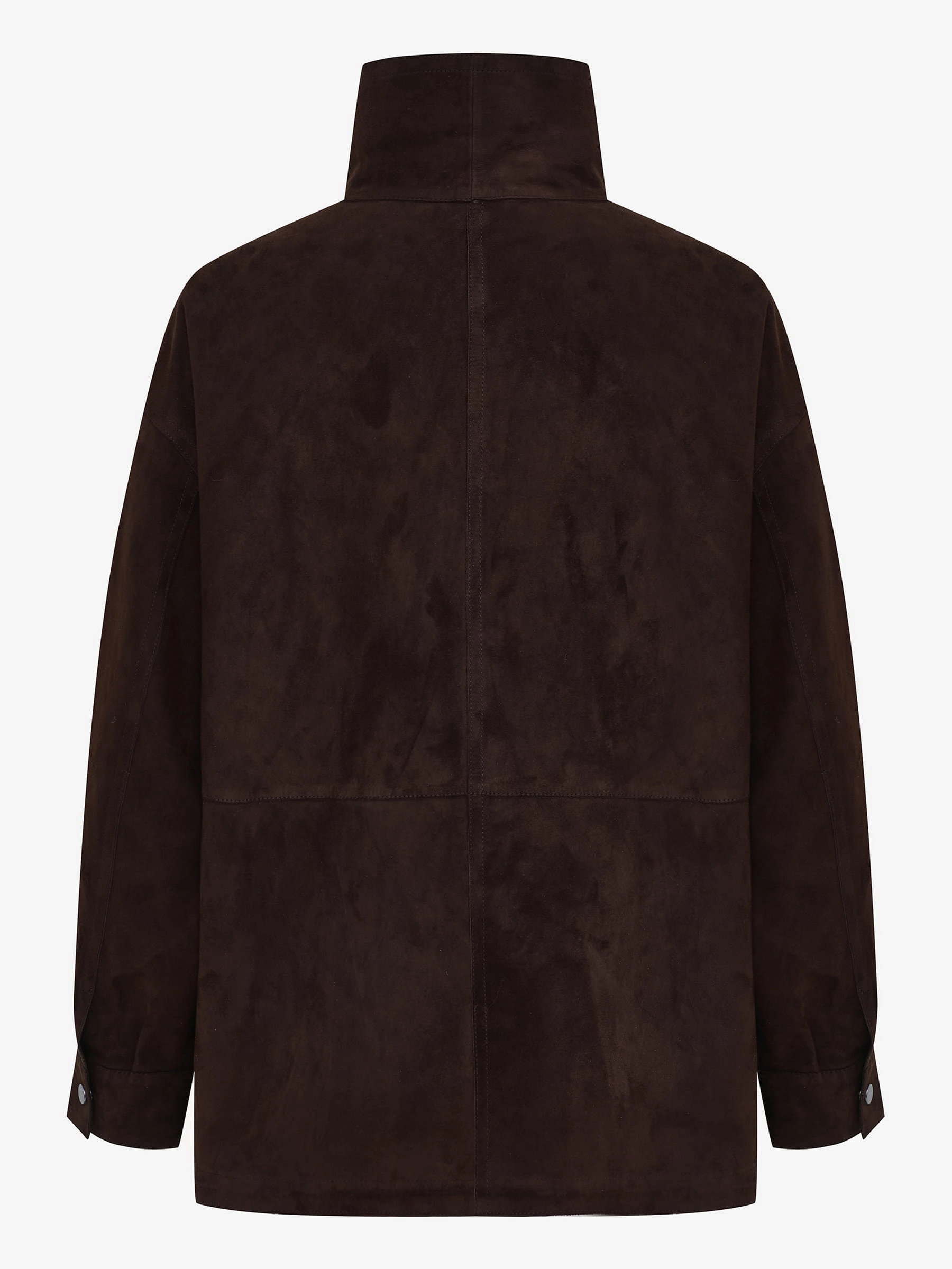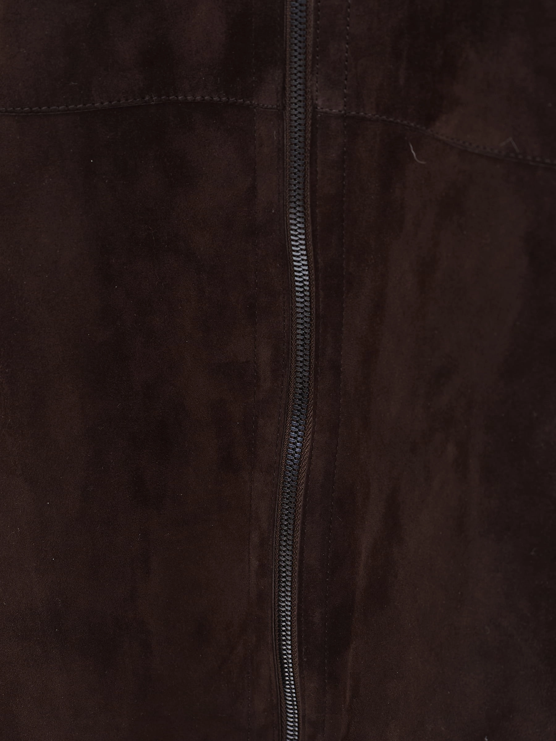 Коричневая замша в обрамлении благородных деталей — эта куртка создана для тех, кто ценит безупречное качество и лаконичную эстетику. Модель прямого силуэта длиной 72 см выполнена из мягчайшей натуральной замши премиального класса, которая дарит тактильную нежность, благородную фактуру и ощущение абсолютной свободы. Воротник-стойка придает образу стройность и собранность, а спущенный рукав обеспечивает современную расслабленную посадку. Два врезных боковых кармана дополнены аккуратными кожаными клапанами — функциональная деталь, которая одновременно служит стилистическим акцентом. Изысканный узкий кожаный кант проходит по воротнику, рукавам и низу куртки, мягко выделяя геометрию кроя и добавляя графичности. Крупная молния становится не только надежной застежкой, но и выразительным элементом дизайна. Полное отсутствие подкладки — особая гордость модели: оно демонстрирует тончайшую выделку замши, что является истинным признаком люксового материала. Куртка удивительно легкая, позволяет коже дышать и мягко облега