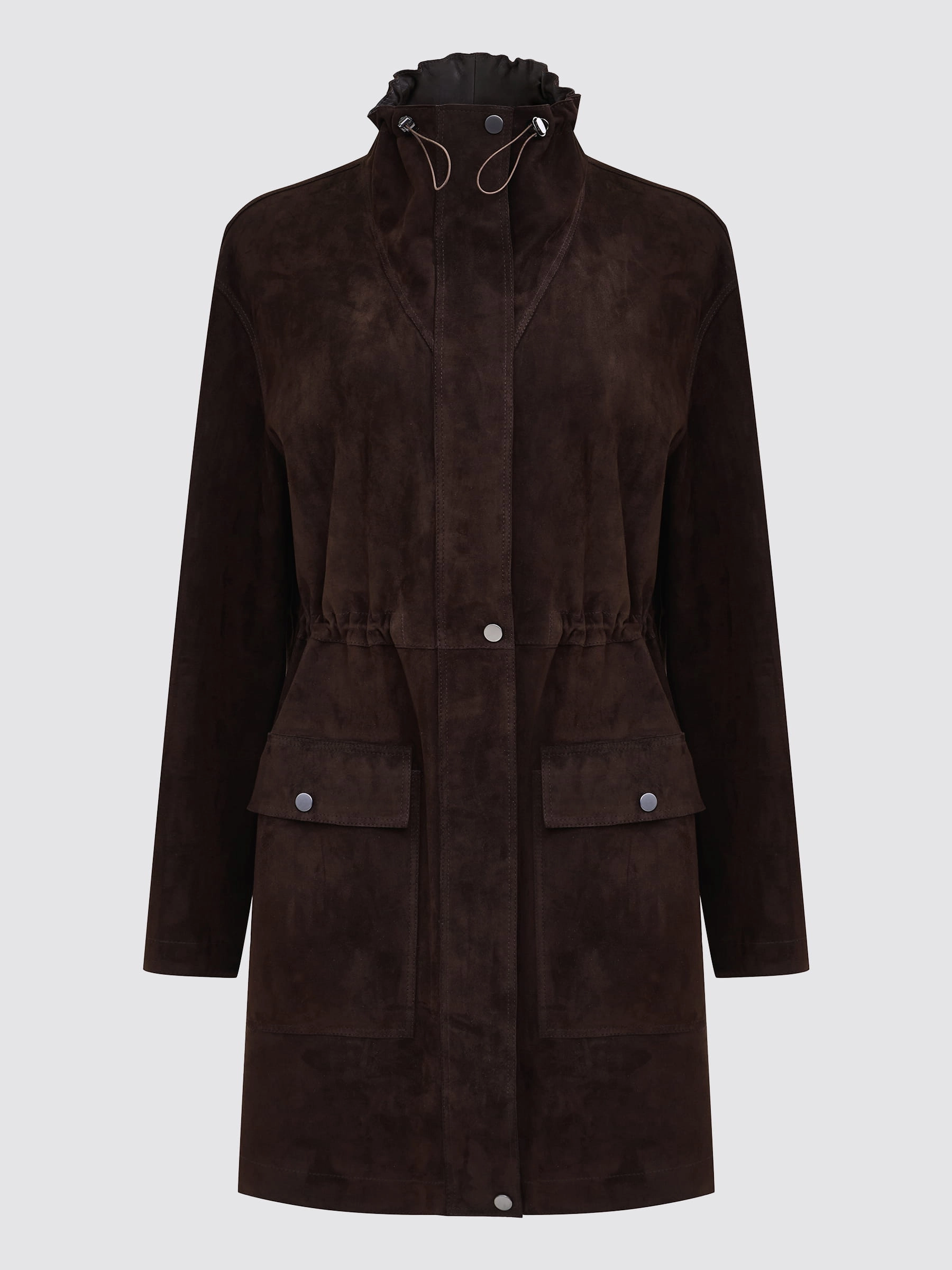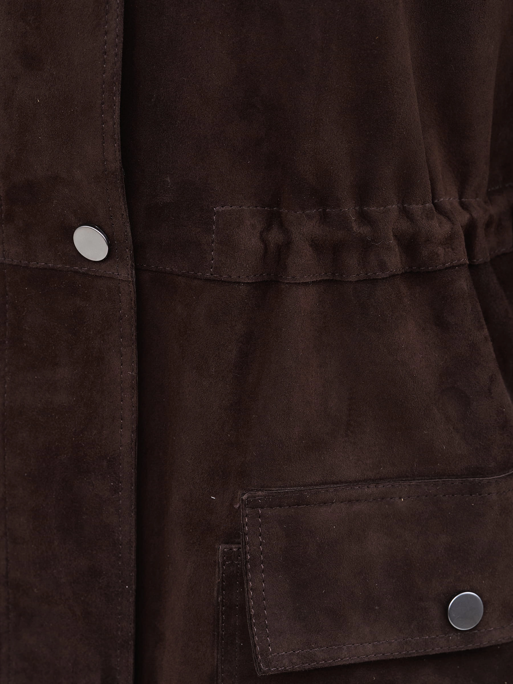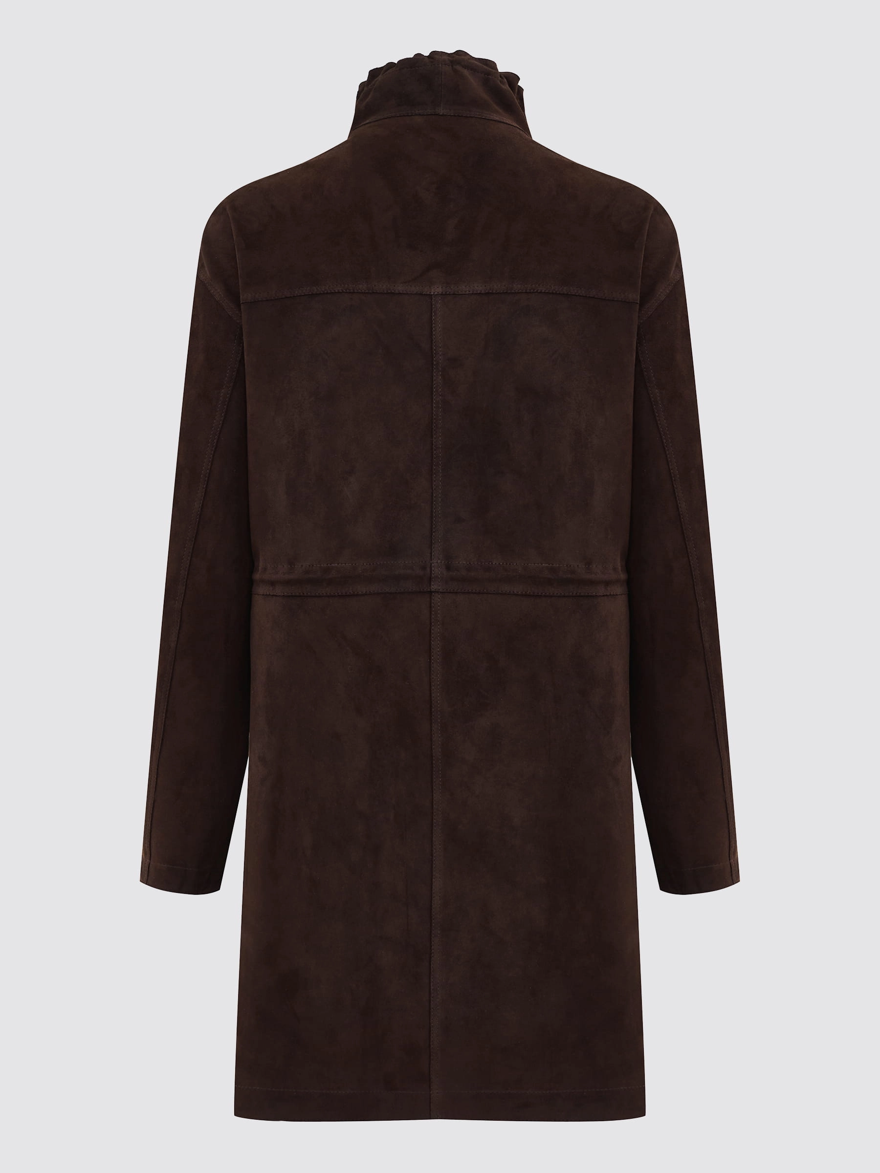 Эффектный удлиненный женский плащ из натуральной замши премиум-класса свободного силуэта длиной 90 см в благородном коричневом оттенке: воротник-стойка, спущенный рукав, накладные боковые карманы с клапанами на кнопках, невысокие боковые разрезы, регулируемые кулиски по воротнику и талии для идеальной посадки, застежка-молния с ветрозащитным клапаном на кнопках, а полное отсутствие подкладки демонстрирует безупречную тонкую выделку замши — истинный признак люксового материала и невесомого комфорта!