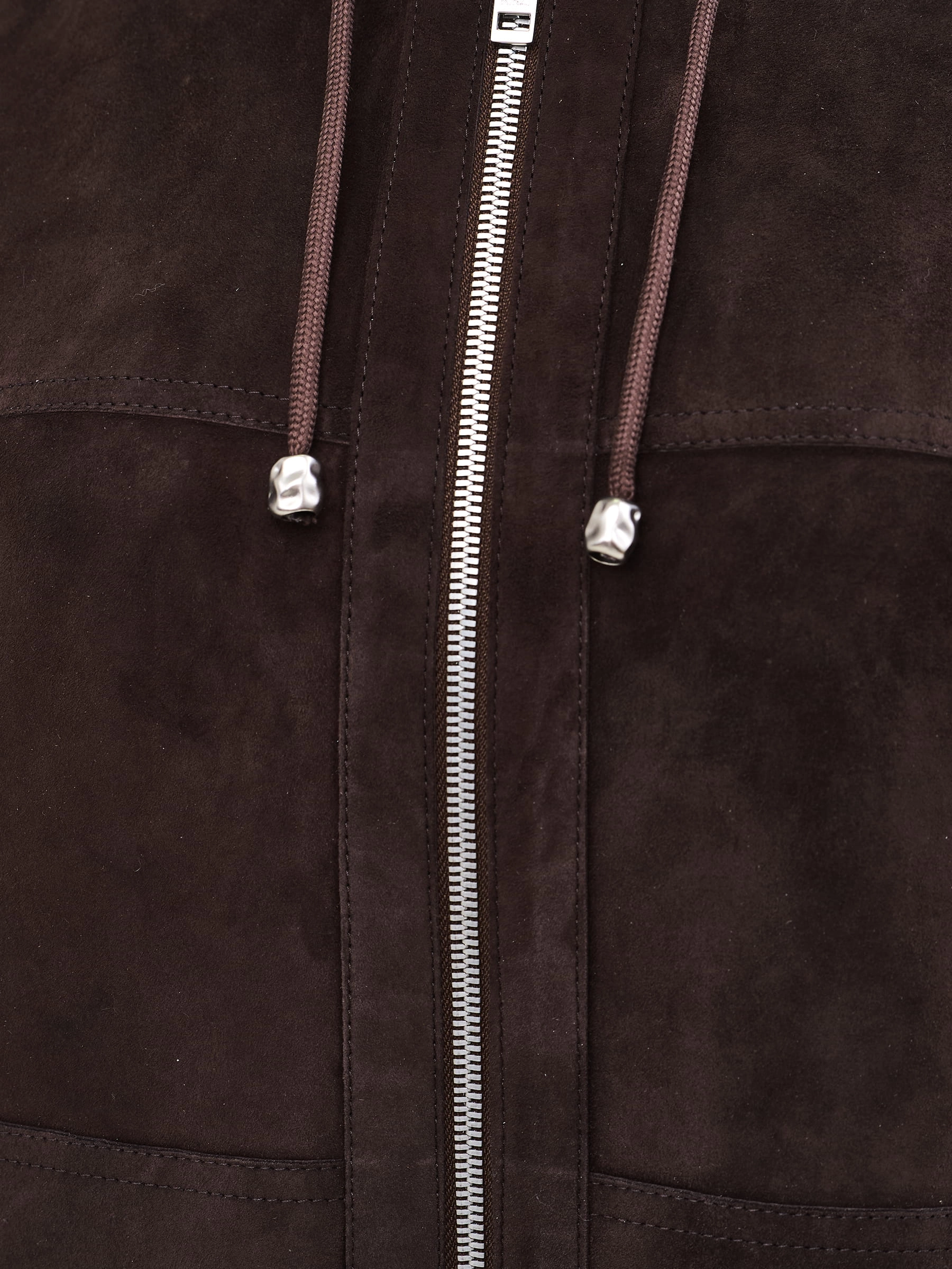 Мягкая, дышащая, с характером. Эта куртка-бомбер сшита из тонкой натуральной замши премиум-класса — бархатистой, пластичной и невероятно приятной на ощупь. Коричневый оттенок напоминает благородную древесную кору или тёмный шоколад: он универсален, статусен и легко сочетается с джинсами, чиносами и даже классическими брюками. вободный силуэт со спущенной линией плеча создаёт современный расслабленный образ, не сковывая движений. Несъёмный капюшон регулируется кулисками — подстроите его под любую погоду. Два боковых кармана удобны и функциональны. Отсутствие подкладки позволяет коже «дышать», а манжеты и пояс из плотной трикотажной резинки надёжно фиксируют куртку на теле, сохраняя тепло и форму. Застёжка-молния — лаконично и надёжно.