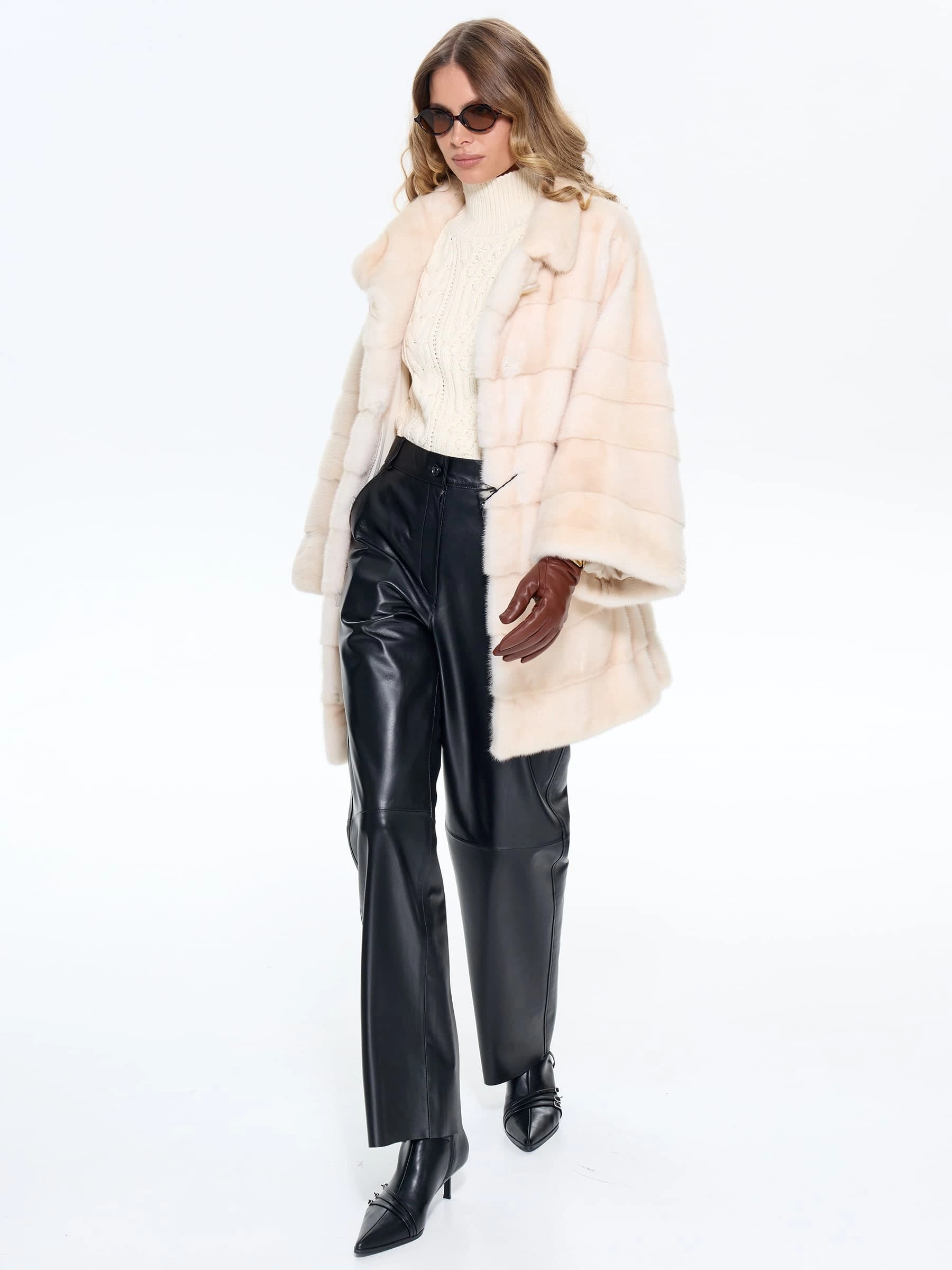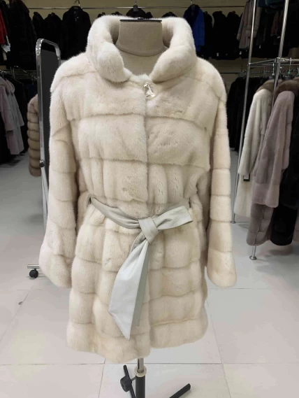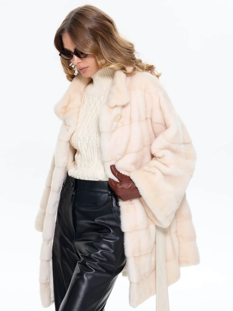 Короткую шубу прямого покроя выполнили из элитной натуральной норки с густым глянцевым ворсом и равномерным окрасом в диагональной раскладке. Тщательная ручная отборка шкурок гарантирует идеальную мягкость. Спущенный крой рукавов создает модный силуэт, который визуально смягчает линию плеч, добавляет образу лёгкости и не стесняет движения, что делает модель идеальной для вождения и активных прогулок. Воротник-стойка подчёркивает шею, создаёт лаконичный контур и прекрасно сочетается с шарфами и объемными аксессуарами. Скрытые клипсы надёжно фиксируют изделие, не повреждая мех и сохраняя чистоту линий. Модель дополнена двумя боковыми карманами и широким кожаным поясом