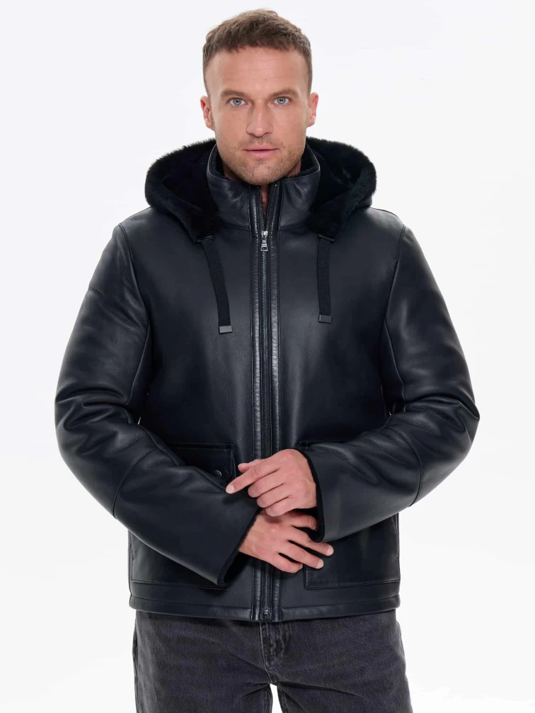 Товар короткая мужская дубленка с капюшоном премиум класса 441, черная, размер 48, артикул 41230 выполнен из овчина "мерино" с застежкой молния. Рассчитан на сезон: зима. Длина изделия 68 см, силуэт прямой.