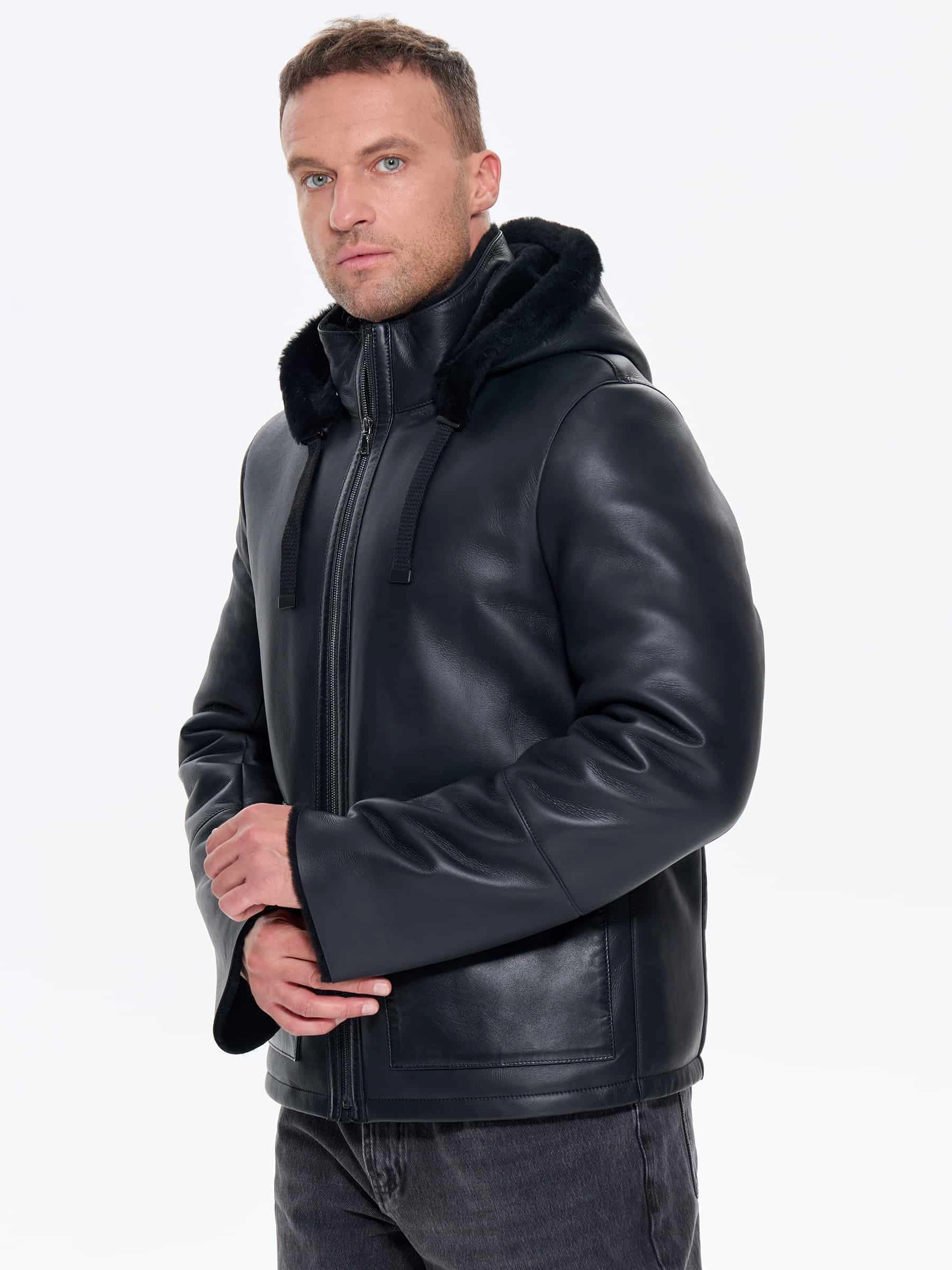 Короткая мужская дубленка с капюшоном премиум класса 441, черная, размер 48, артикул 41230
