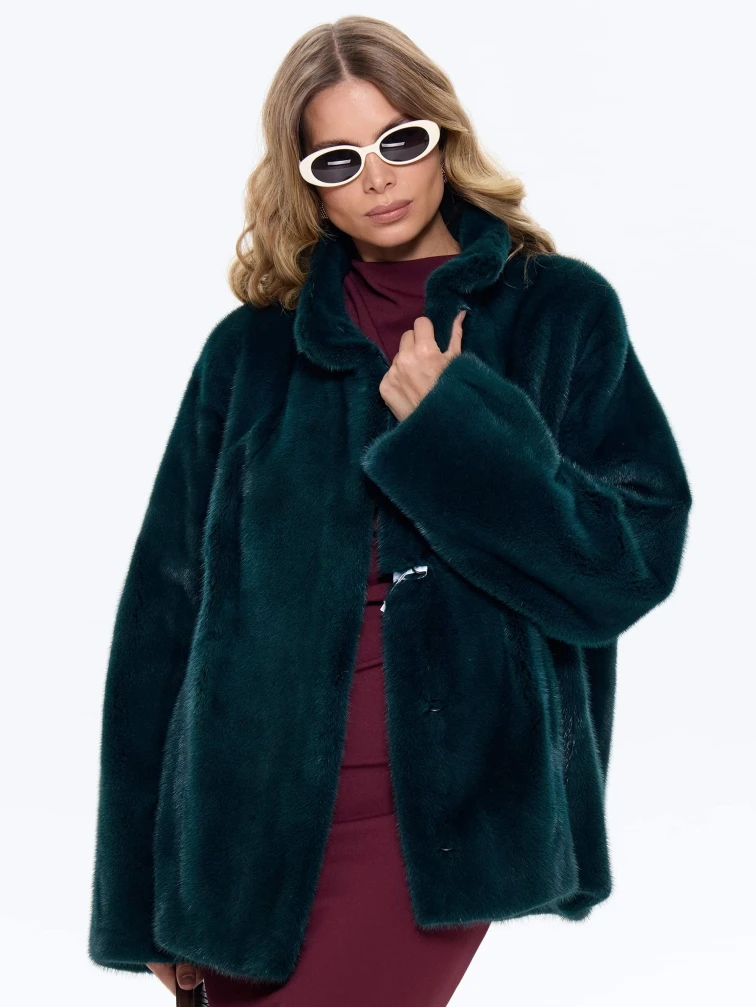 Стильная короткая куртка из меха норки премиум-класса насыщенного зеленого оттенка с элегантным воротником-стойкой. Свободный крой длиной 80 см со спущенной линией плеча создает современный силуэт, сочетающий непринужденную элегантность и уют. Стилисты рекомендуют носить эту куртку с кожаными брюками и уггами для повседневного образа или с юбкой-миди и сапогами на каблуке для вечернего выхода. Идеальный баланс классического шарма и современного дизайна для модниц, ценящих комфорт и роскошь.