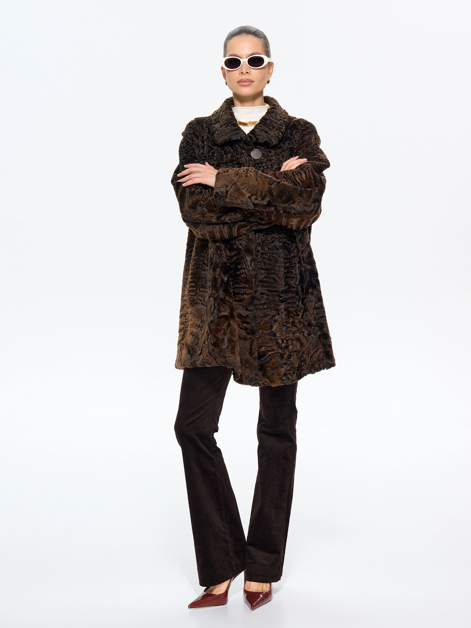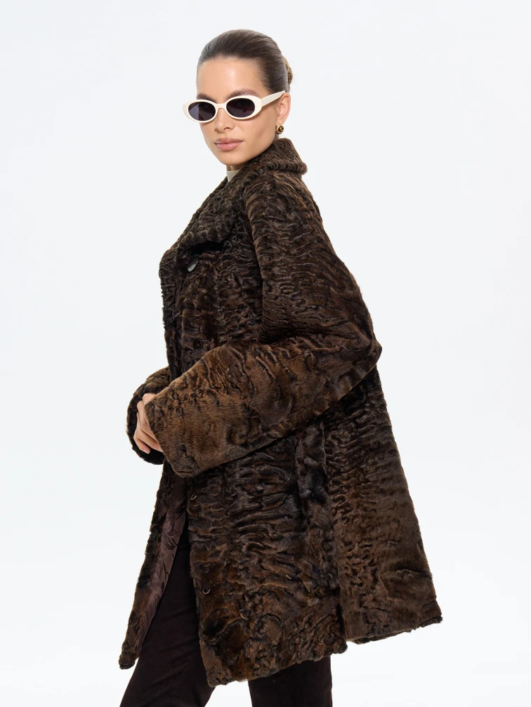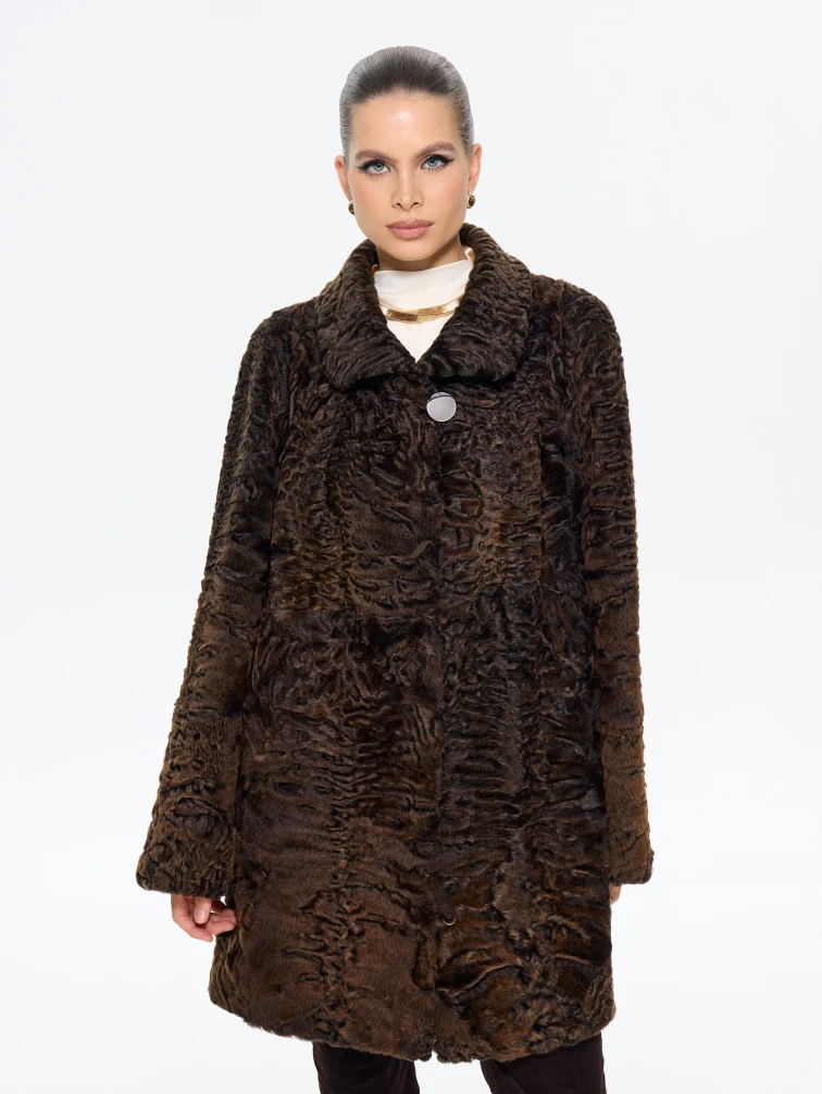 Коричневая шуба из меха каракульчи премиум-класса с элегантным воротником апаш. Модель в форме легкой трапеции длиной 80 см с втачными рукавами и застежкой-клипсами создает утонченный силуэт. Стилисты рекомендуют носить с кожаными сапогами и объемной сумкой для повседневного образа или с плиссированной юбкой и шелковым платком для элегантного выхода. Идеальное сочетание классики, комфорта и неповторимого шарма в каждой детали.
