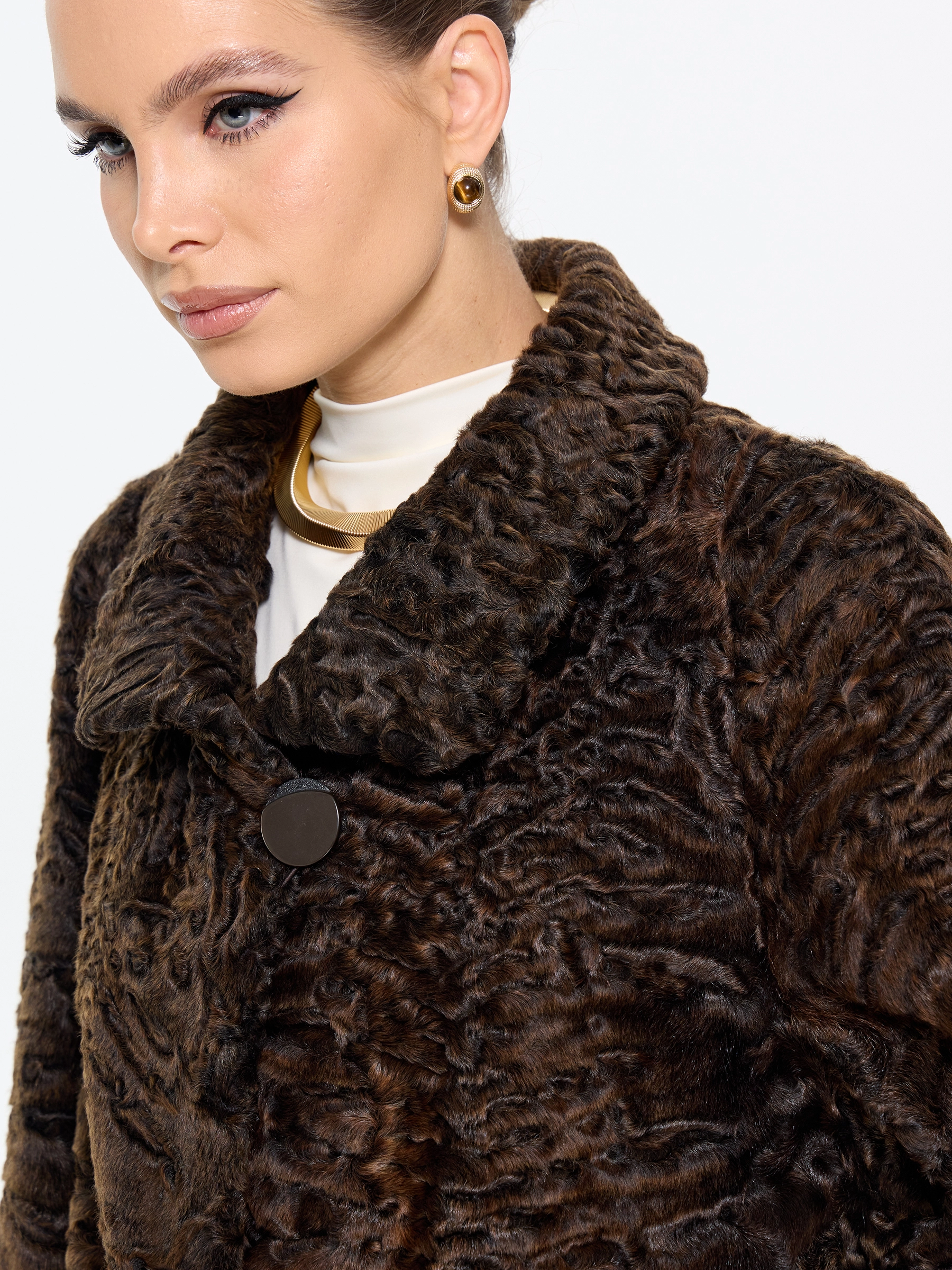 Короткая женская шуба из меха каракульчи Лиза, коричневая, размер 60, артикул 65570