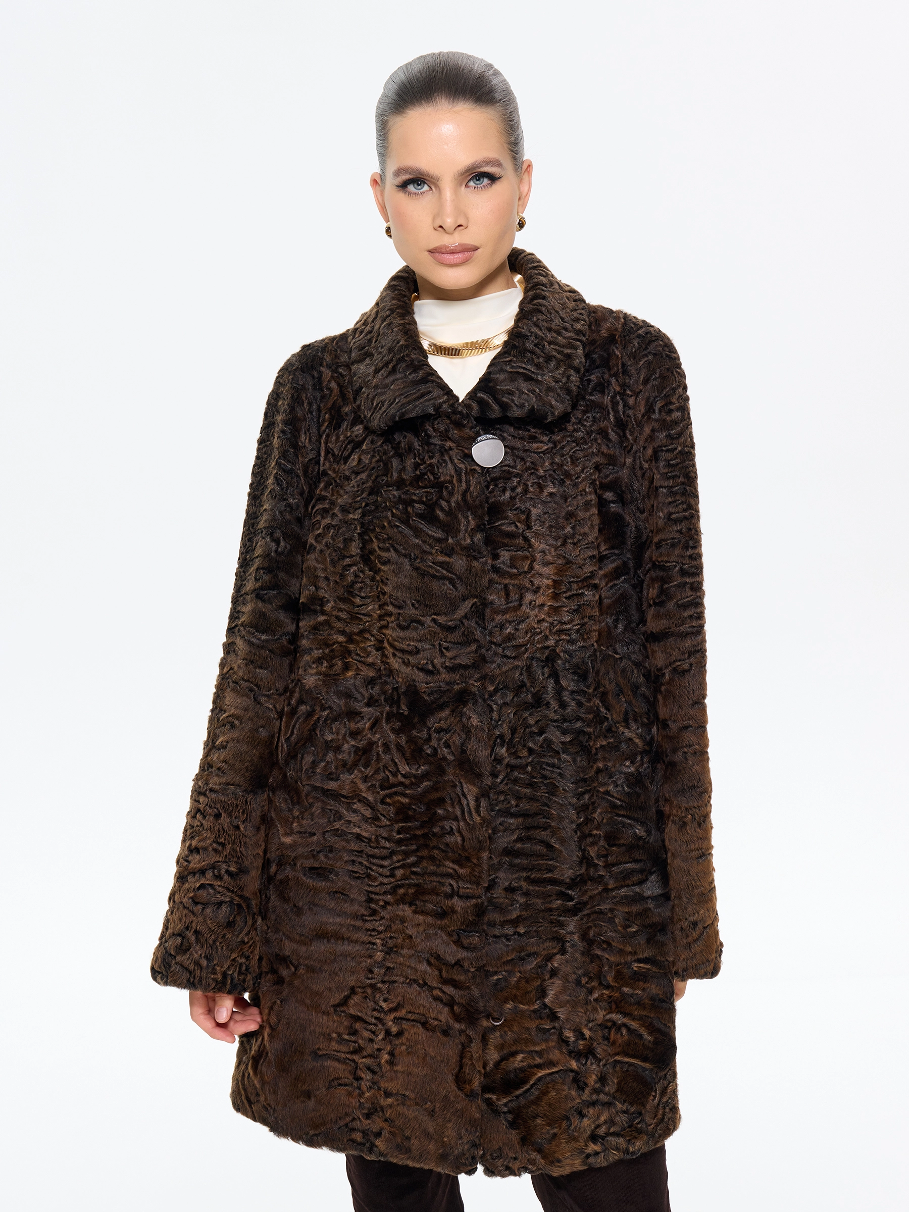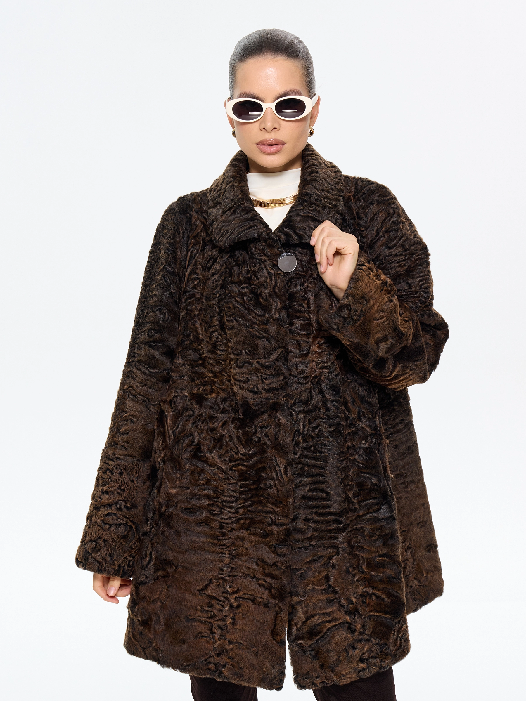 Товар короткая женская шуба из меха каракульчи лиза, коричневая, размер 60, артикул 65570 выполнен из мех каракульчи с застежкой клипсы. Рассчитан на сезон: весна-осень. Длина изделия 80 см, силуэт расклешенный.