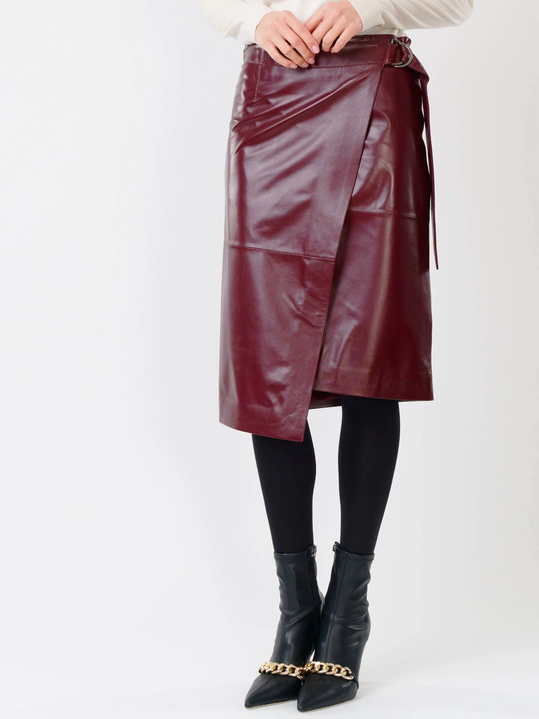 Кожаная юбка миди с запахом 07, бордовая, размер 42, артикул 85351