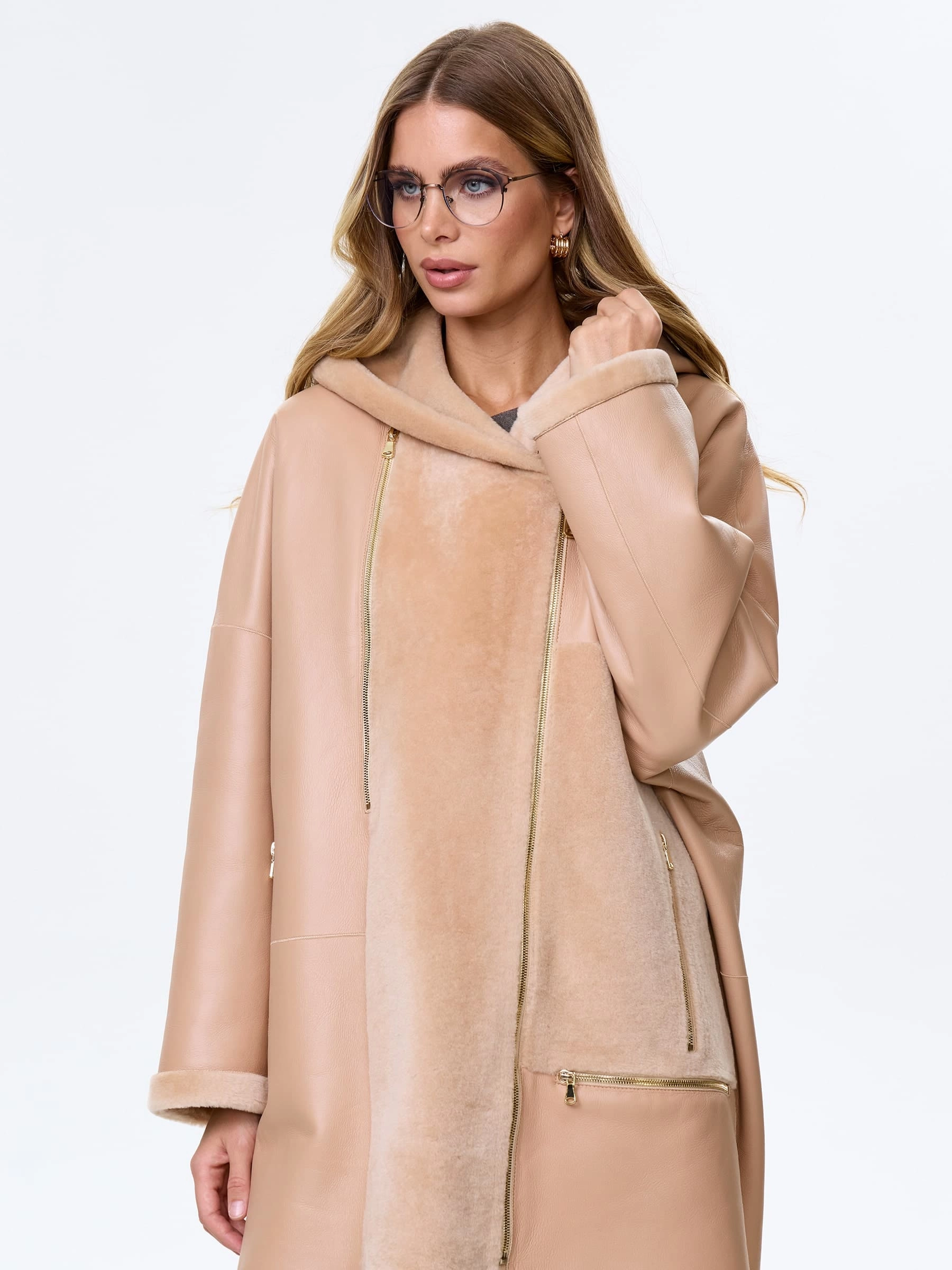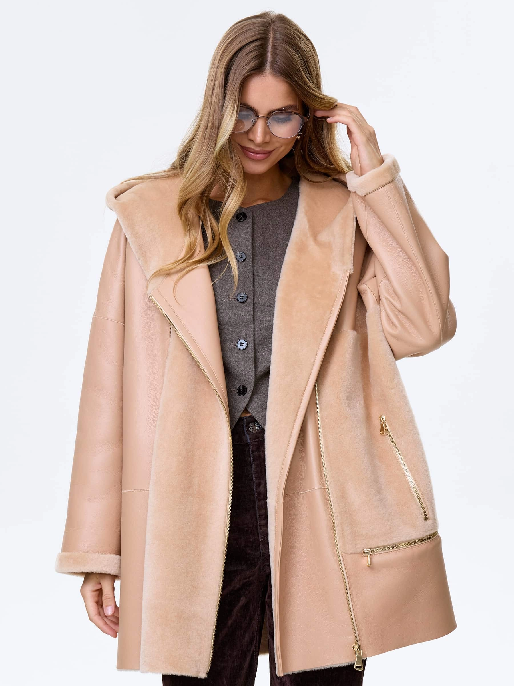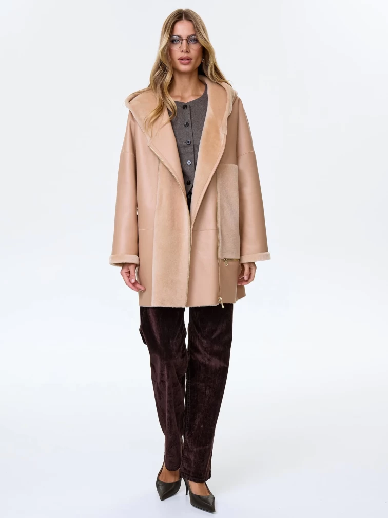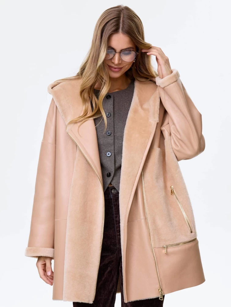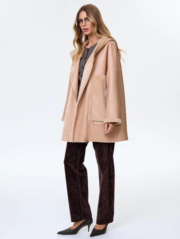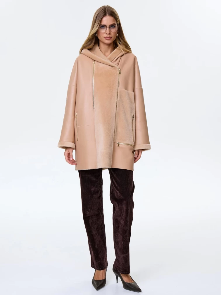 Товар молодежная комбинированная женская дубленка с капюшоном премиум класса 2056, бежевая, размер 48, артикул 64130 выполнен из овчина "мерино" с застежкой молния. Рассчитан на сезон: осень-зима. Длина изделия 81 см, силуэт свободный.