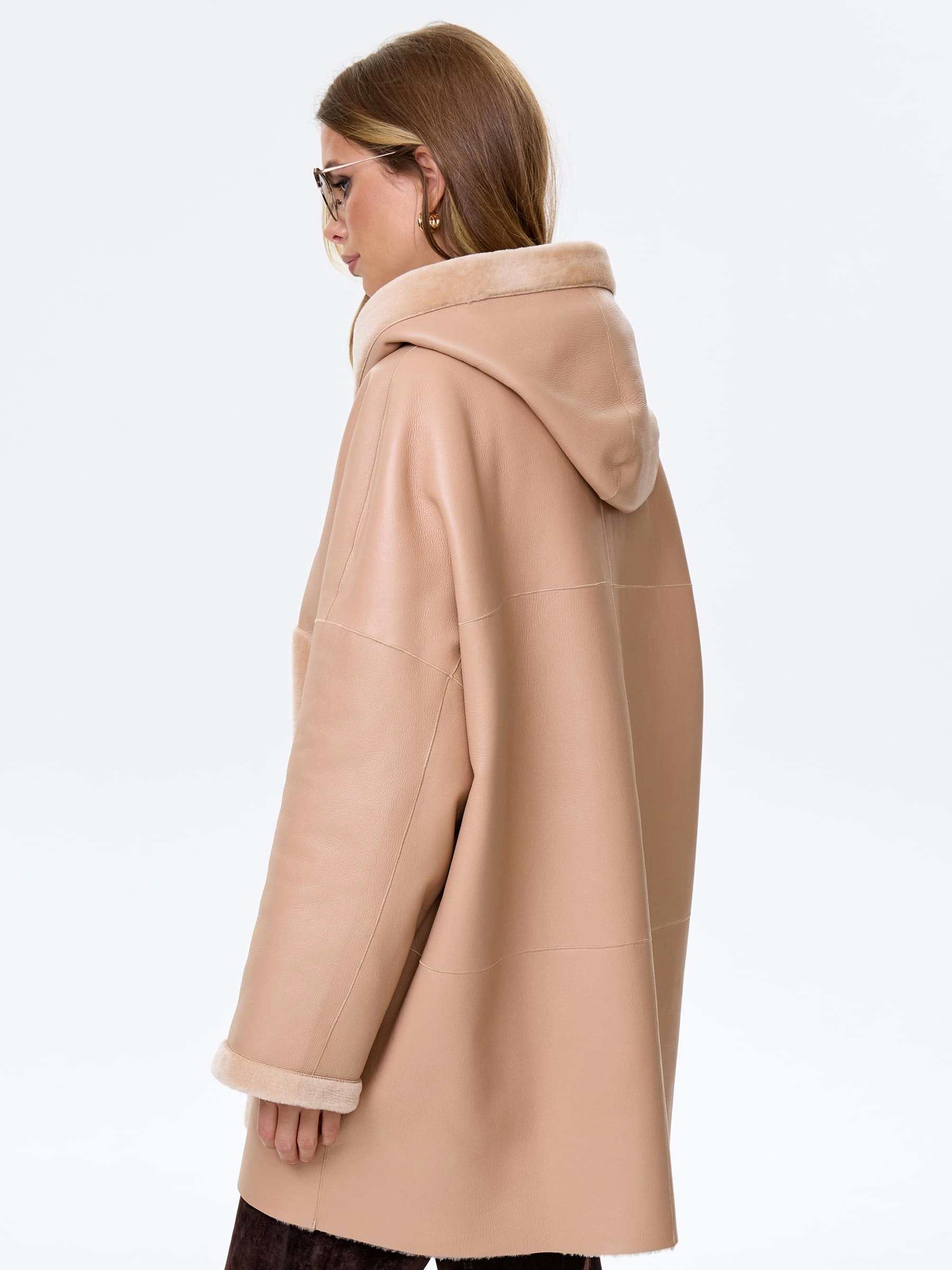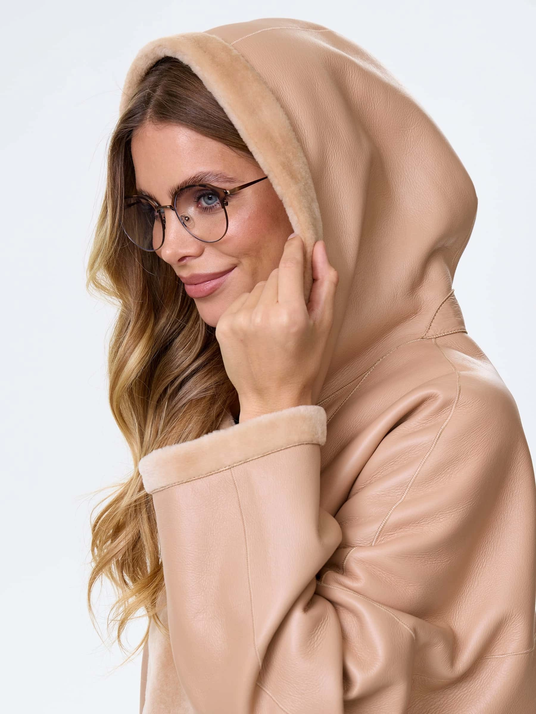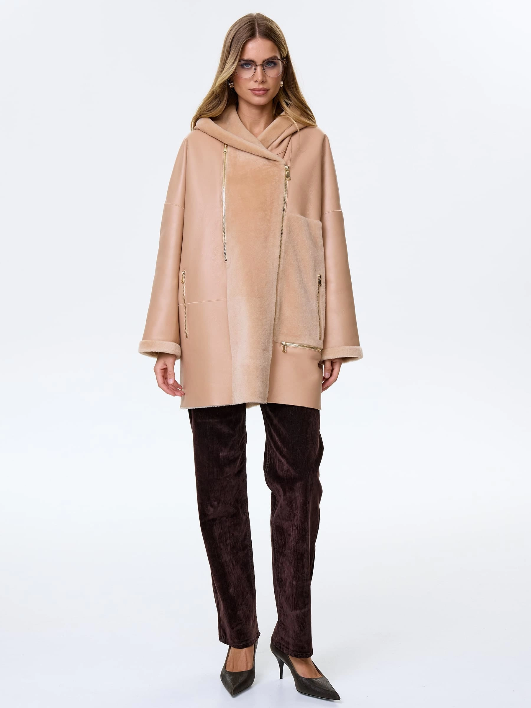 Молодежная комбинированная женская дубленка с капюшоном премиум класса 2056, бежевая, размер 48, артикул 64130