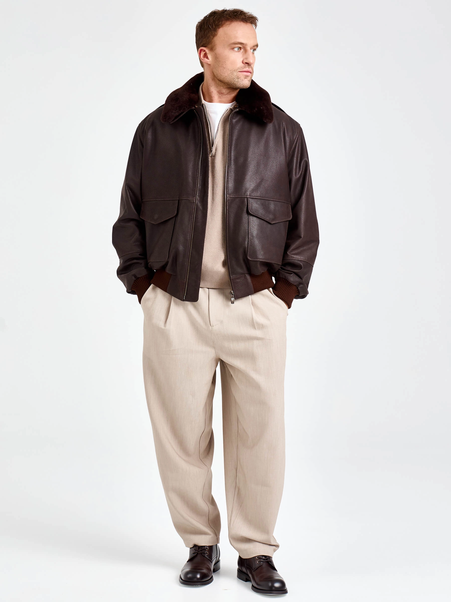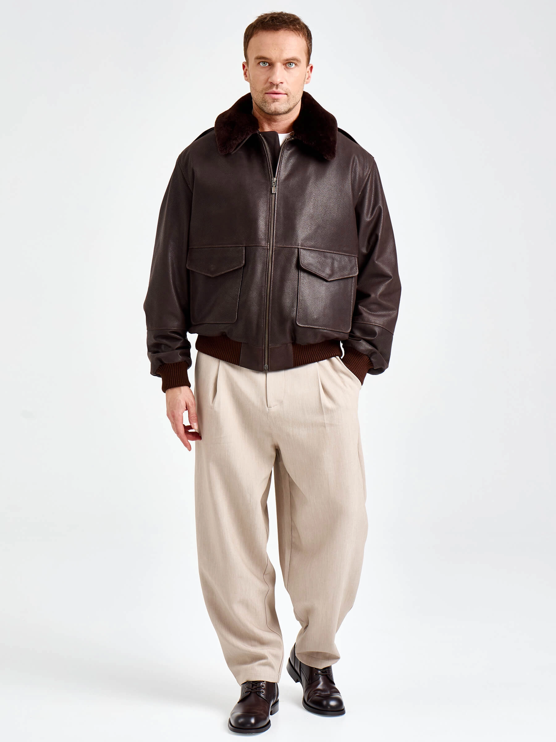 Товар мужская кожаная куртка пилот премиум класса 548, коричневая, размер 50, артикул 29860 выполнен из натуральной кожи с застежкой молния. Рассчитан на сезон: осень-зима. Длина изделия 70 см, силуэт свободный.