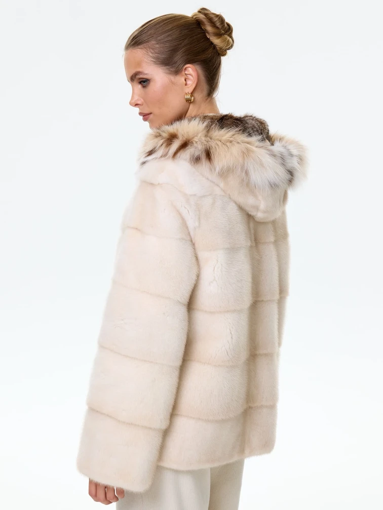 Женская шуба с шелковистым мехом норки в жемчужном цвете с объемным капюшоном отделанный рысевидной кошкой. Застежка клипсы. Благодаря бережной выделке, изделие прямого кроя с боковыми карманами получилось легким, но не менее теплым.
