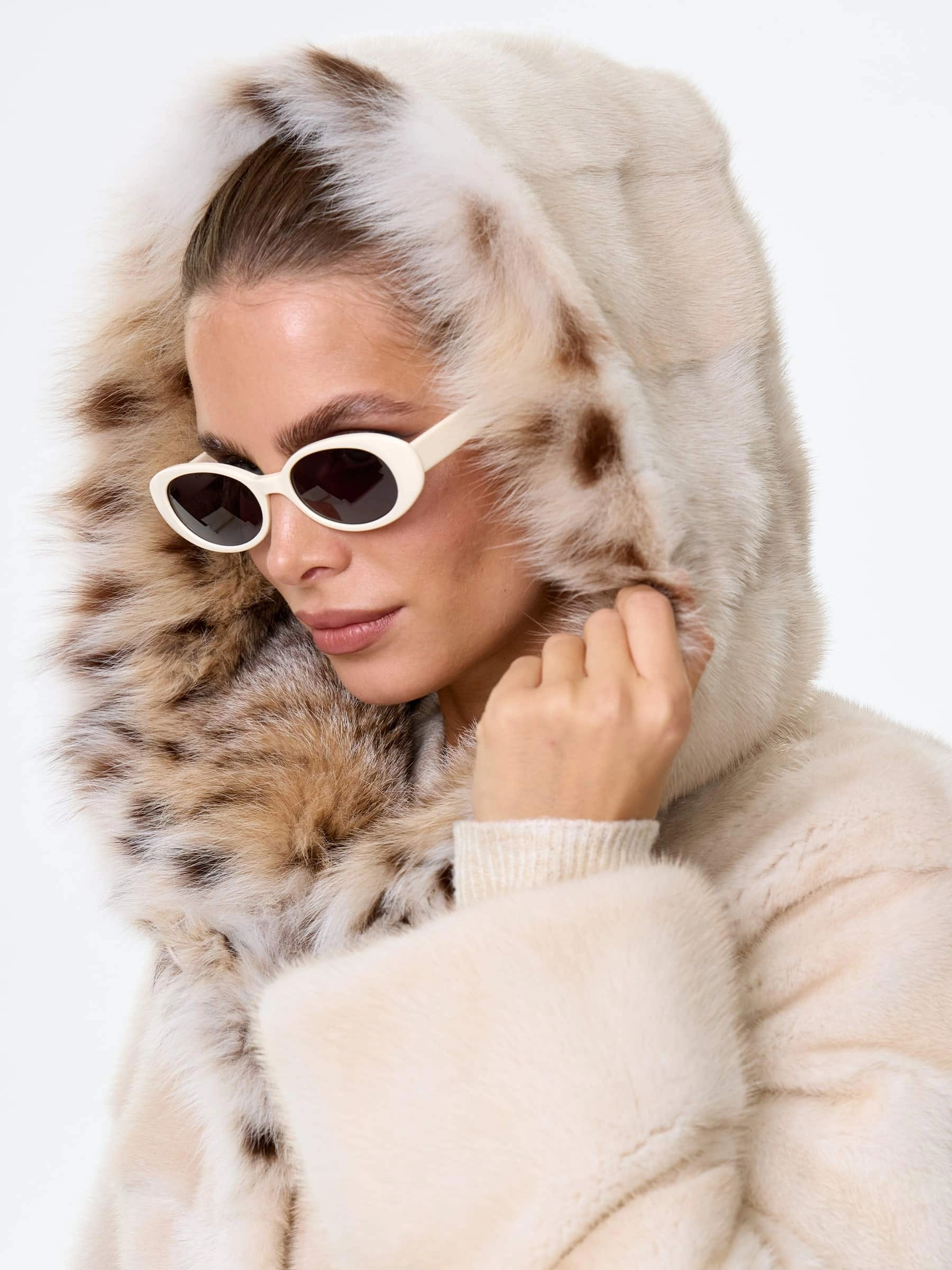 Норковая шуба женская с капюшоном и отделкой рысевидной кошкой Юля(к), жемчужная, размер 48, артикул 34130
