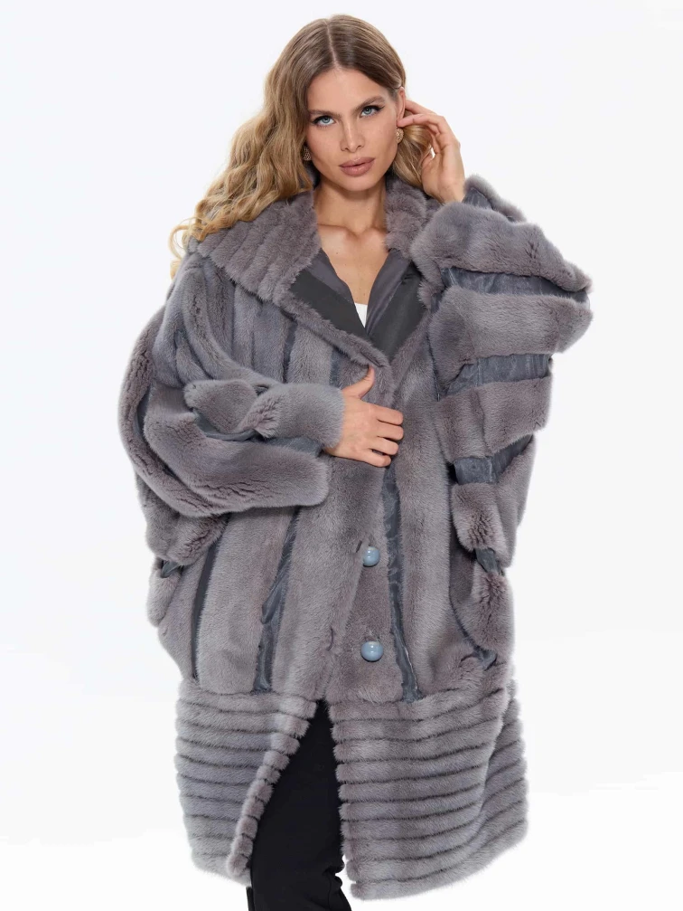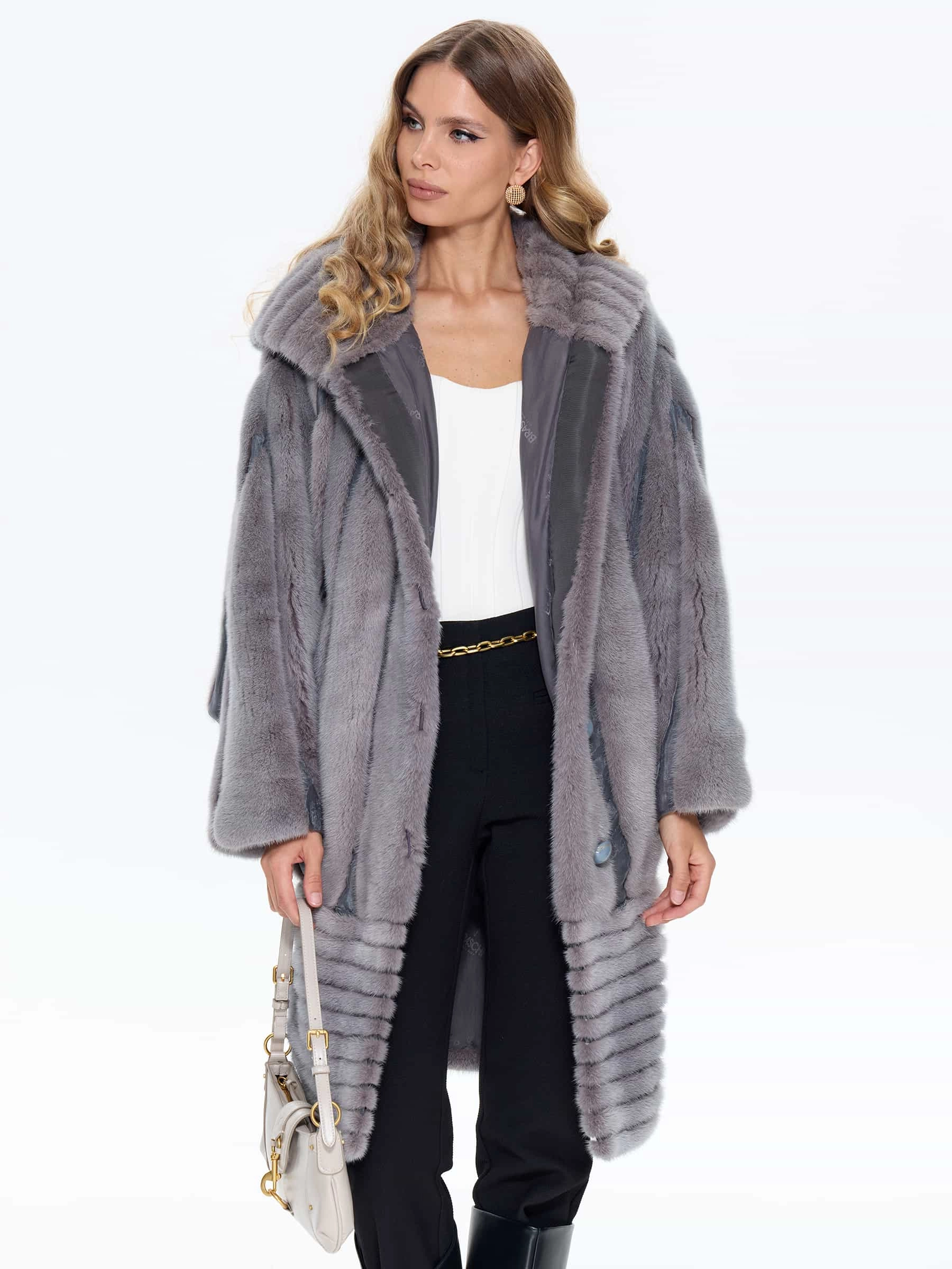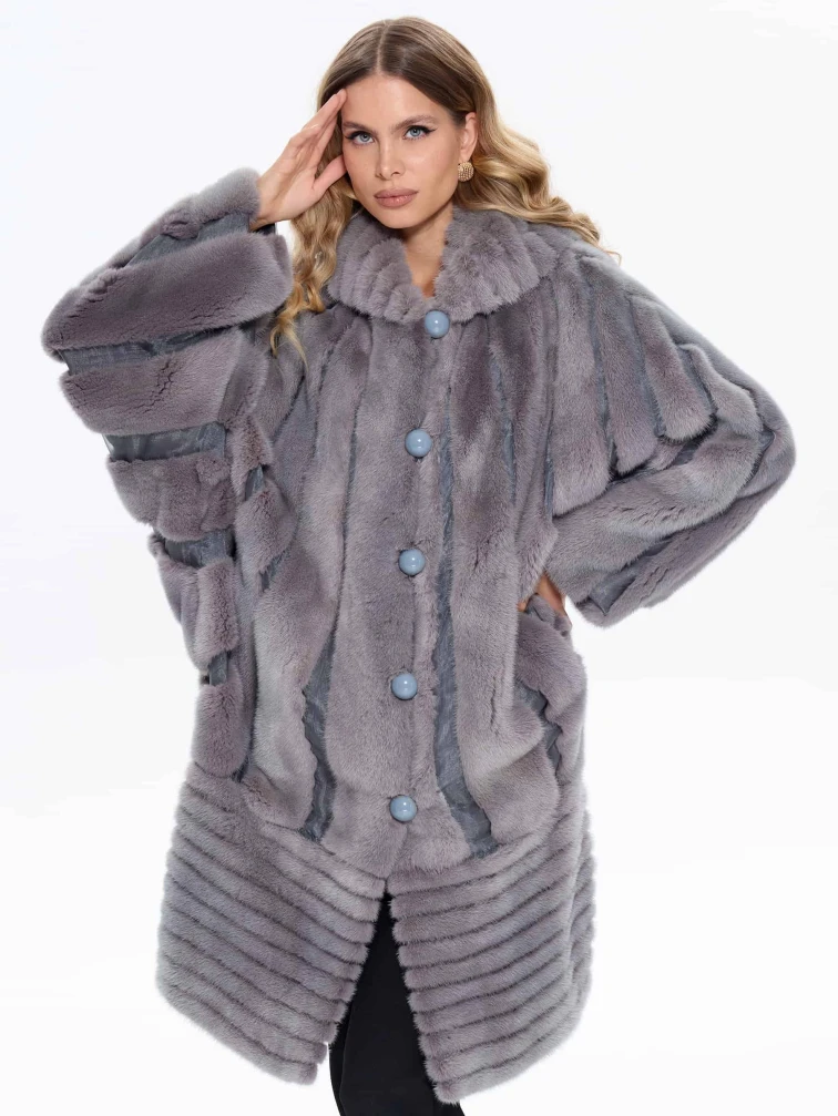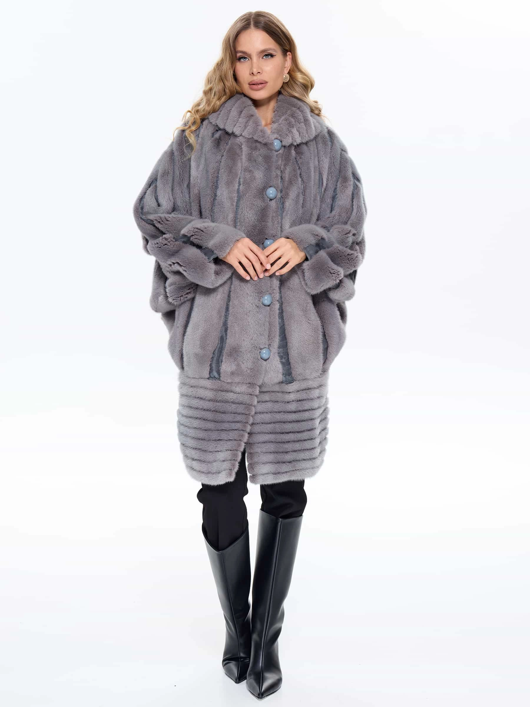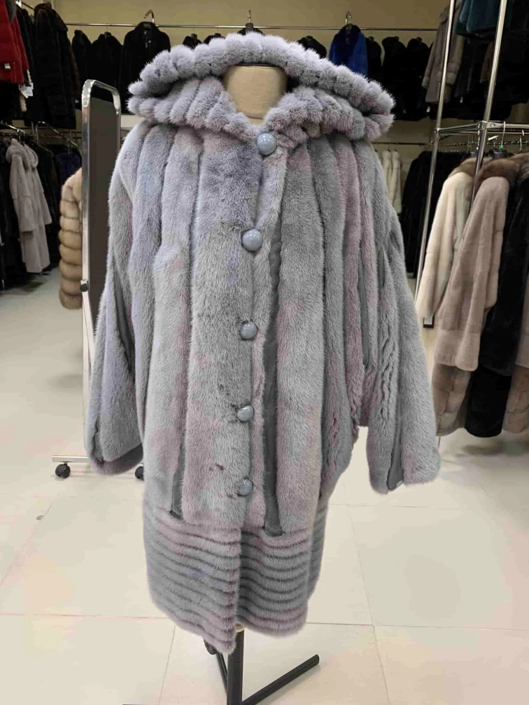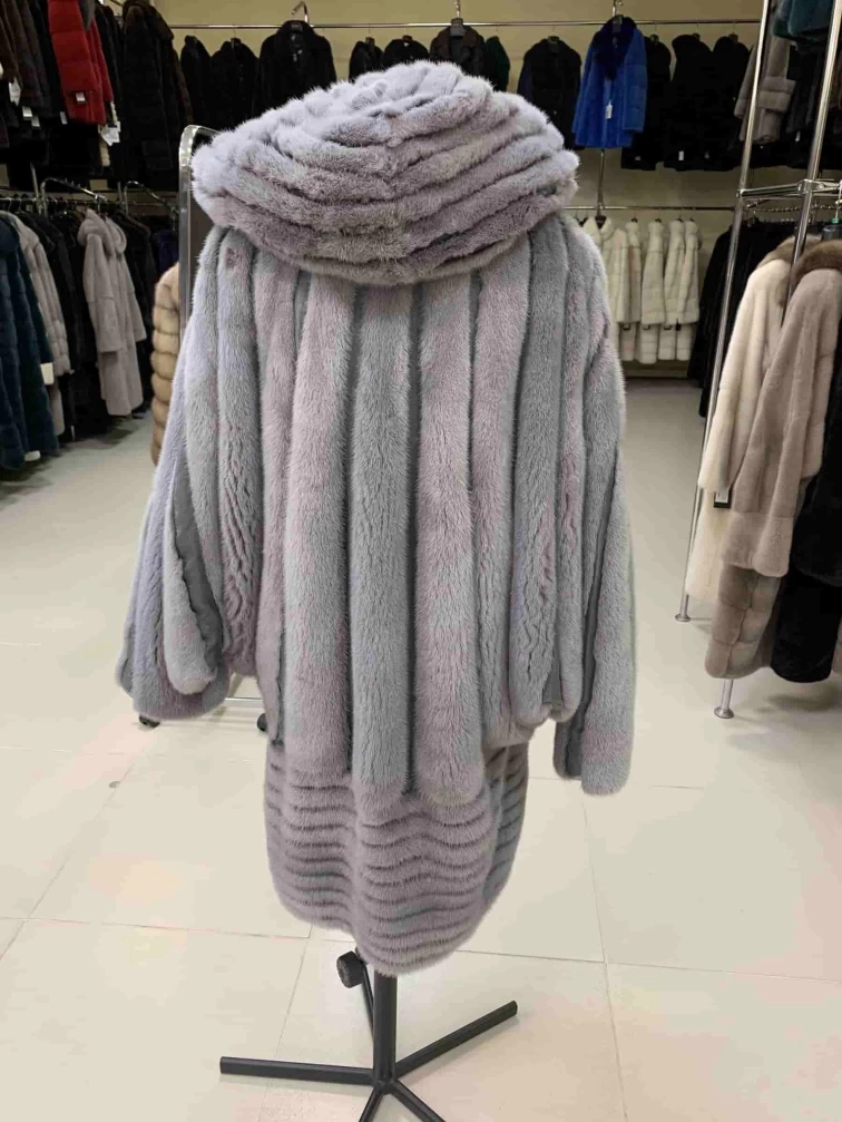 Женская шуба в морозном сером цвете с голубым подтоном выполнена из густого шелковистого меха норки, ее свободный крой не ограничивает движений, мягко скрывает особенности фигуры и позволяет носить объемные свитера. Модель обладает эксклюзивными деталями: рукав «мышка» разработан совместно с лабораторией Milan Fashion Tech, объемный капюшон и внешняя часть выполнены в диагональной раскладке меха. Универсальная длина миди подходит как для городской носки, так и для особых случаев. Изделие дополнено практичной подкладкой из износостойкой вискозы, глубокими боковыми карманами и застежкой на пуговицах, а качественный мех отлично сохраняет тепло в холодную зиму.