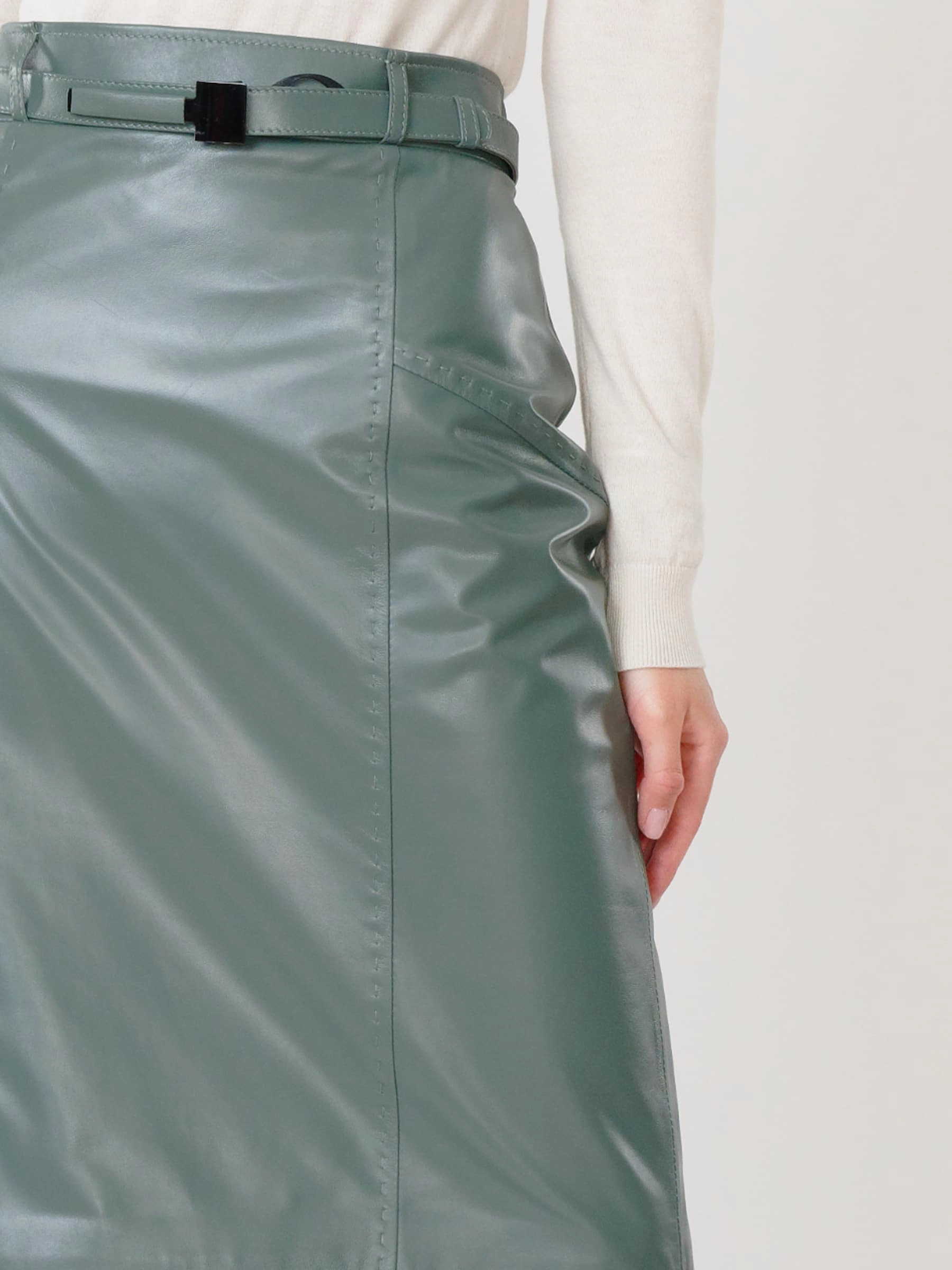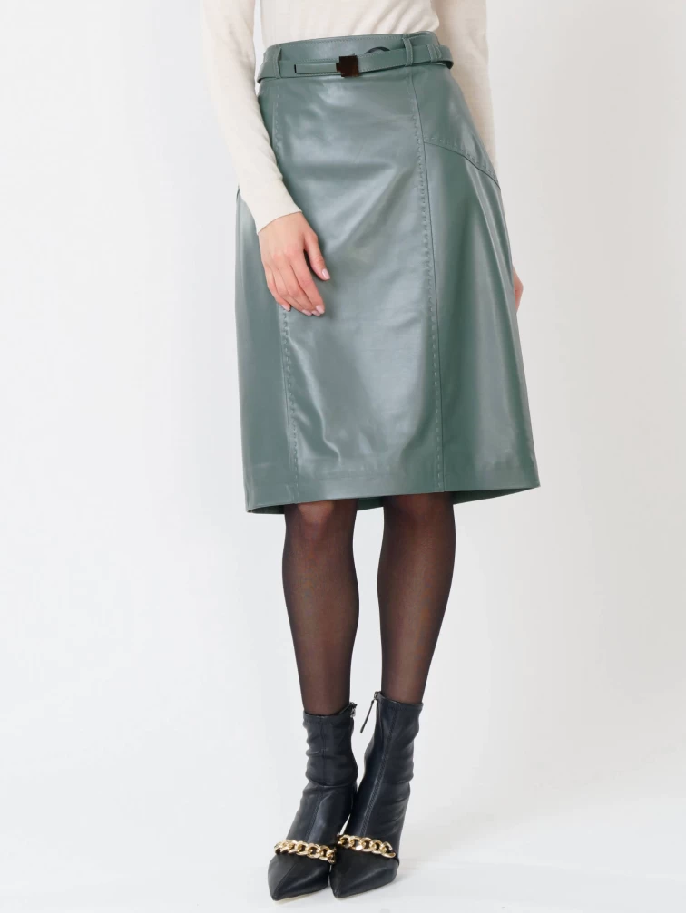 Юбка-карандаш из натуральной оливковой кожи сочетает строгий прямой силуэт с уникальным природным оттенком, который играет переливами от приглушённого хаки до насыщенного бутылочного цвета. Зауженный крой идеально подчёркивает фигуру, а функциональная шлица обеспечивает лёгкость шага. Натуральная кожа с вощёным блеском премиального качества придаёт образу особую статусность — сочетайте с бежевыми блузами для офиса, с горчичными топами для города или с золотистыми аксессуарами для вечера. Универсальная длина чуть выше колена и идеальная посадка делают эту юбку с застёжкой-молнией must-have для тех, кто ценит безупречный крой и глубину натуральных оттенков.