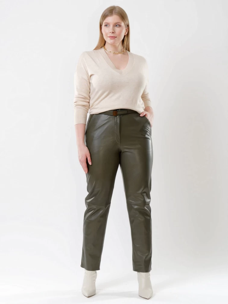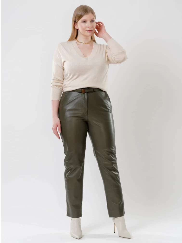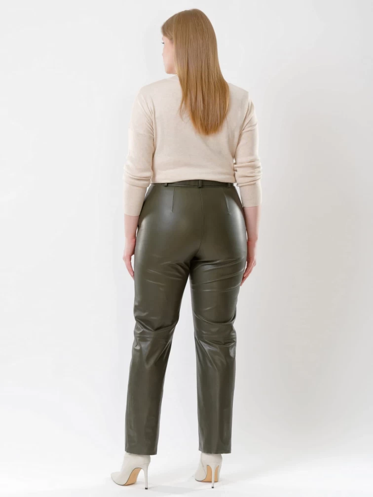 Оливковые прямые женские кожаные брюки 04, размер 46, артикул 85532