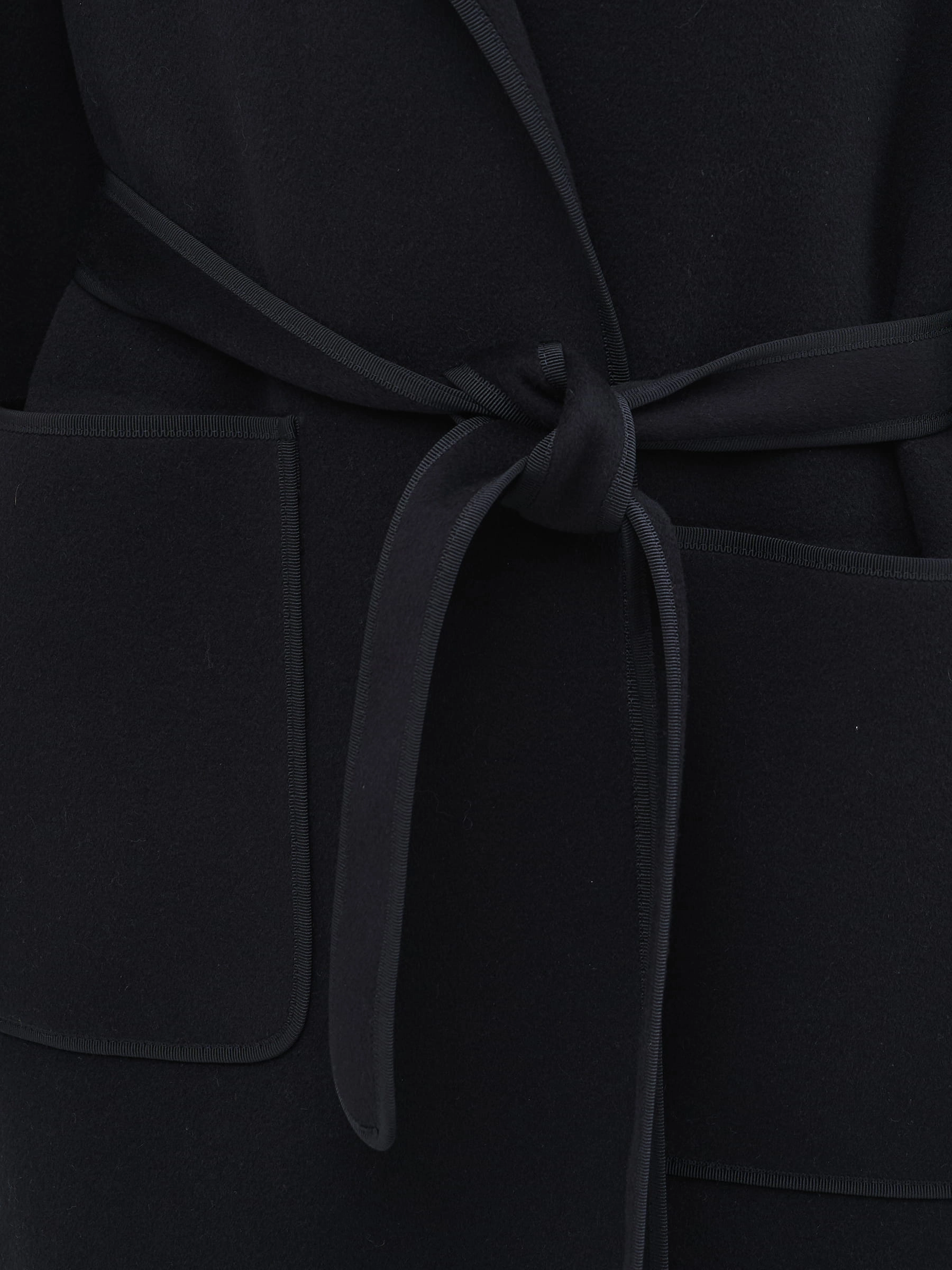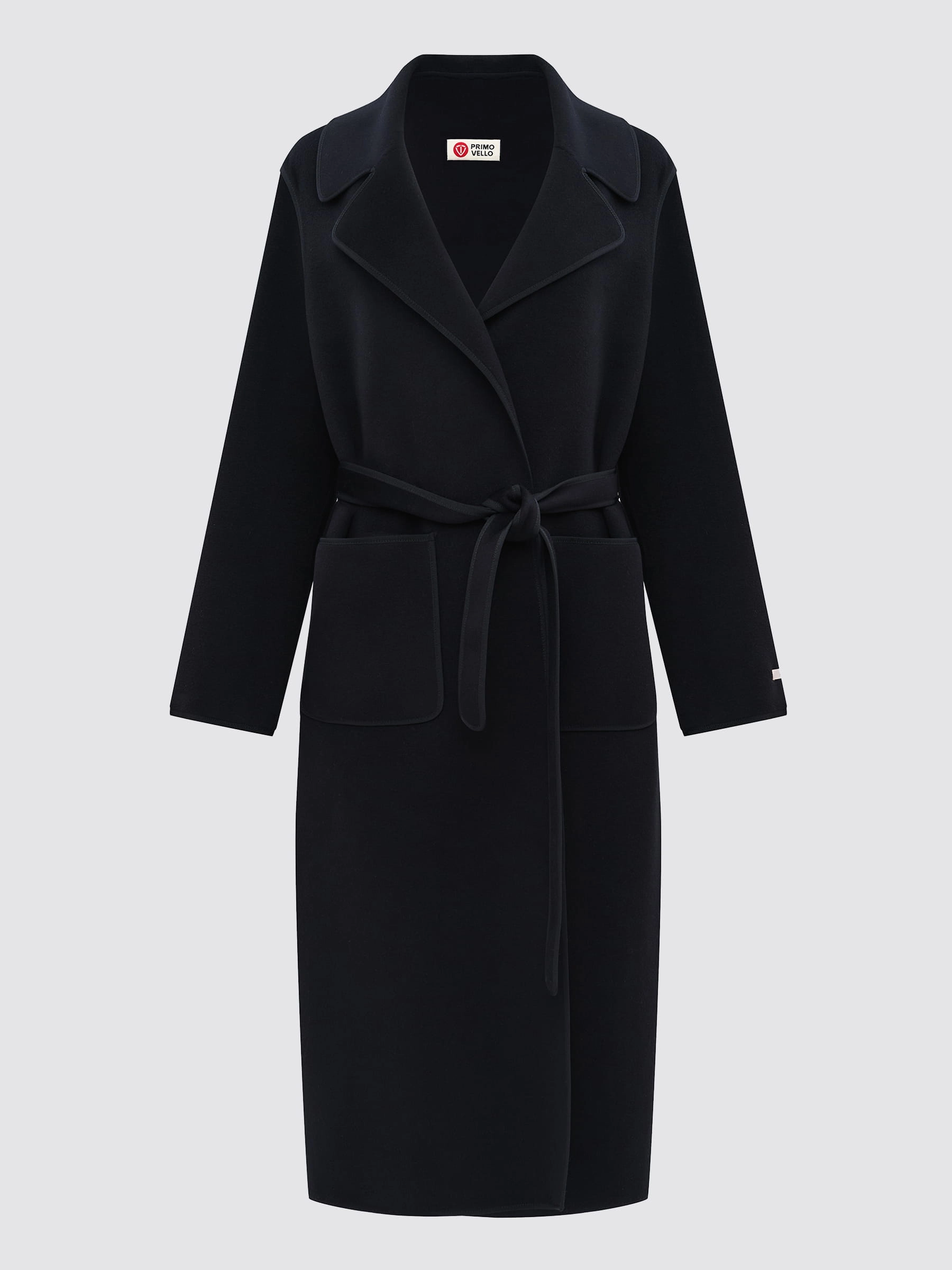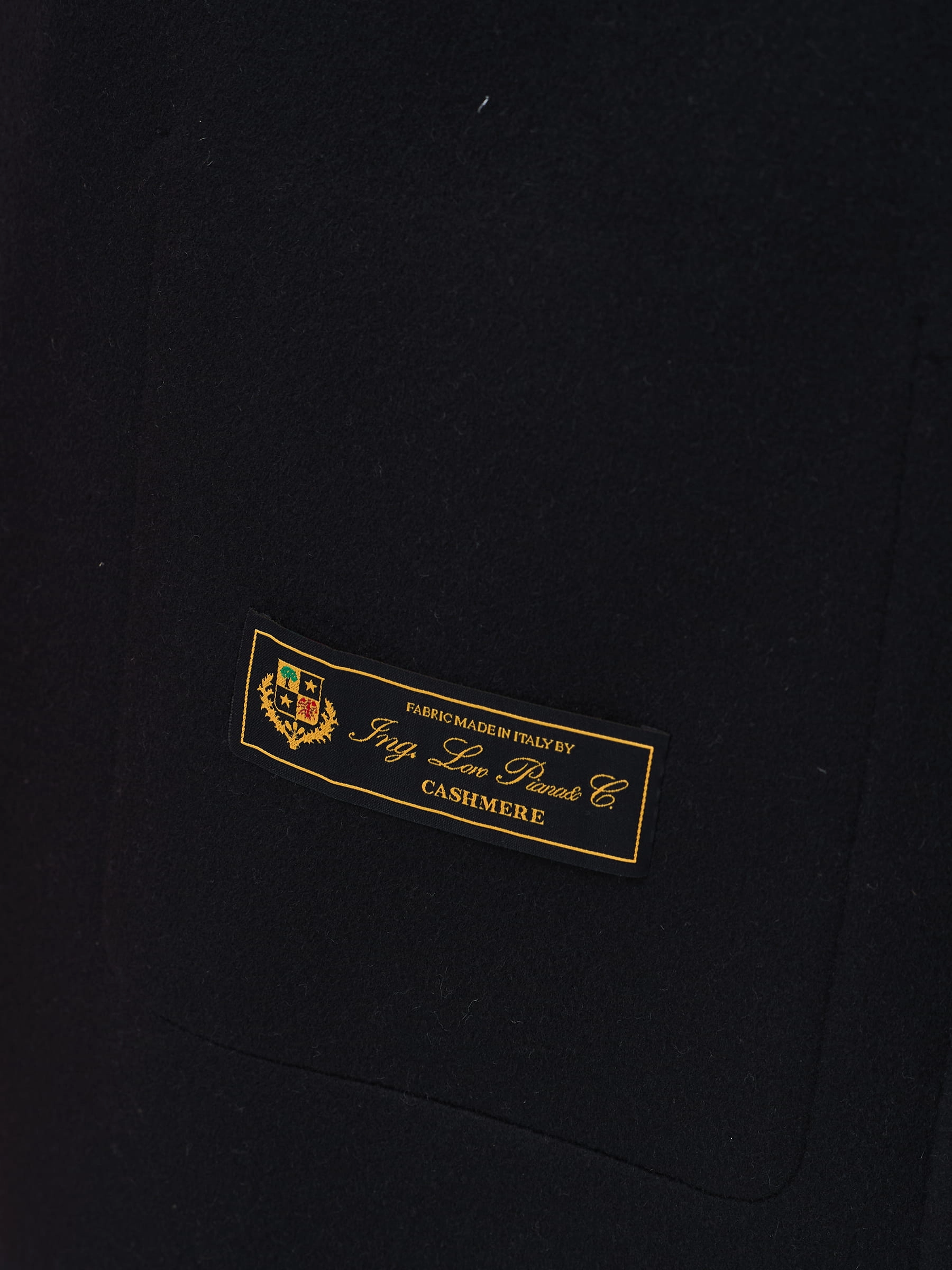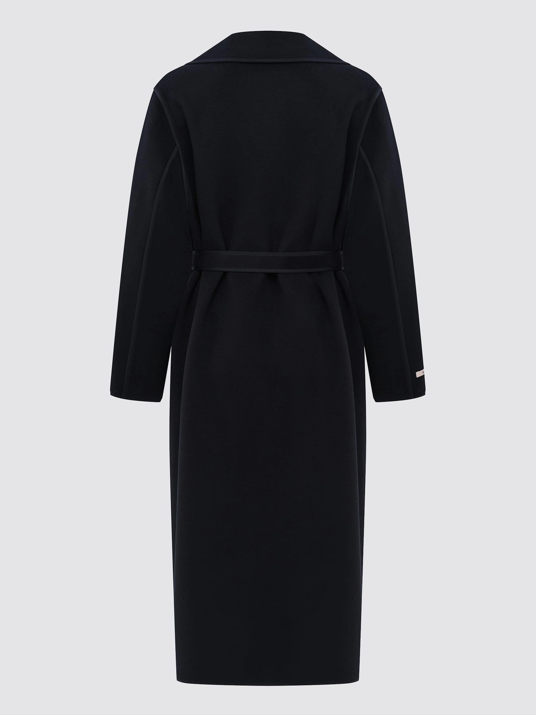 Длинное женское пальто черного цвета из благородной смеси 60% шерсти и 40% кашемира свободного силуэта длиной 125 см: элегантный английский воротник с широкими лацканами, спущенная линия плеча, два накладных кармана, изысканный узкий кант в тон по лацканам, карманам и рукавам, застежка-запах (длинный пояс вместо традиционной фурнитуры), ручная работа и полное отсутствие подкладки — воплощение английской сдержанности, тепла и невесомого комфорта!