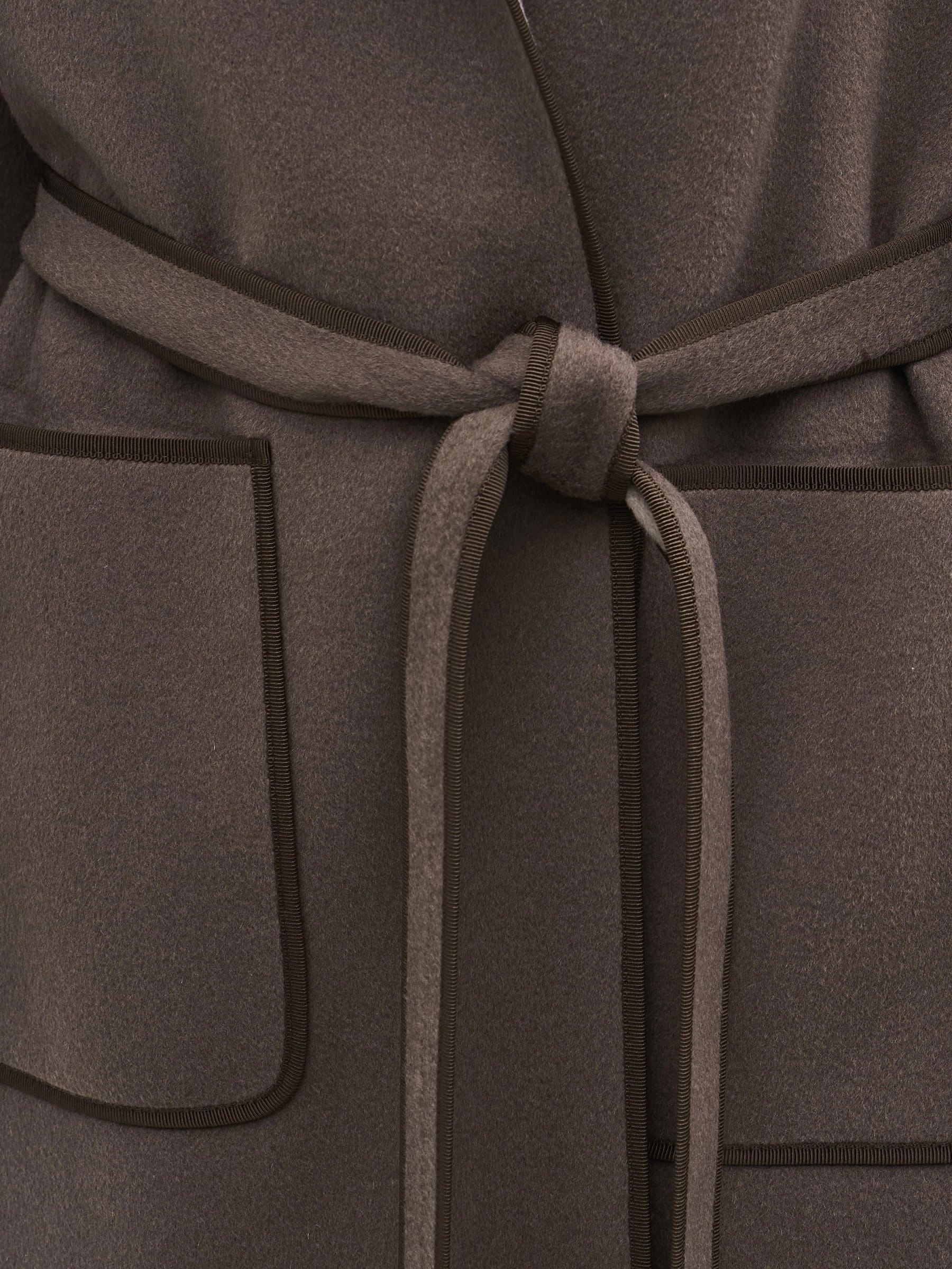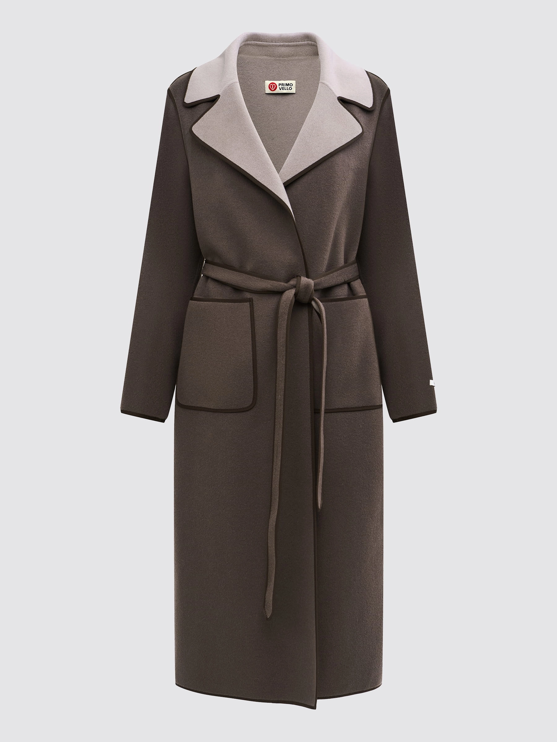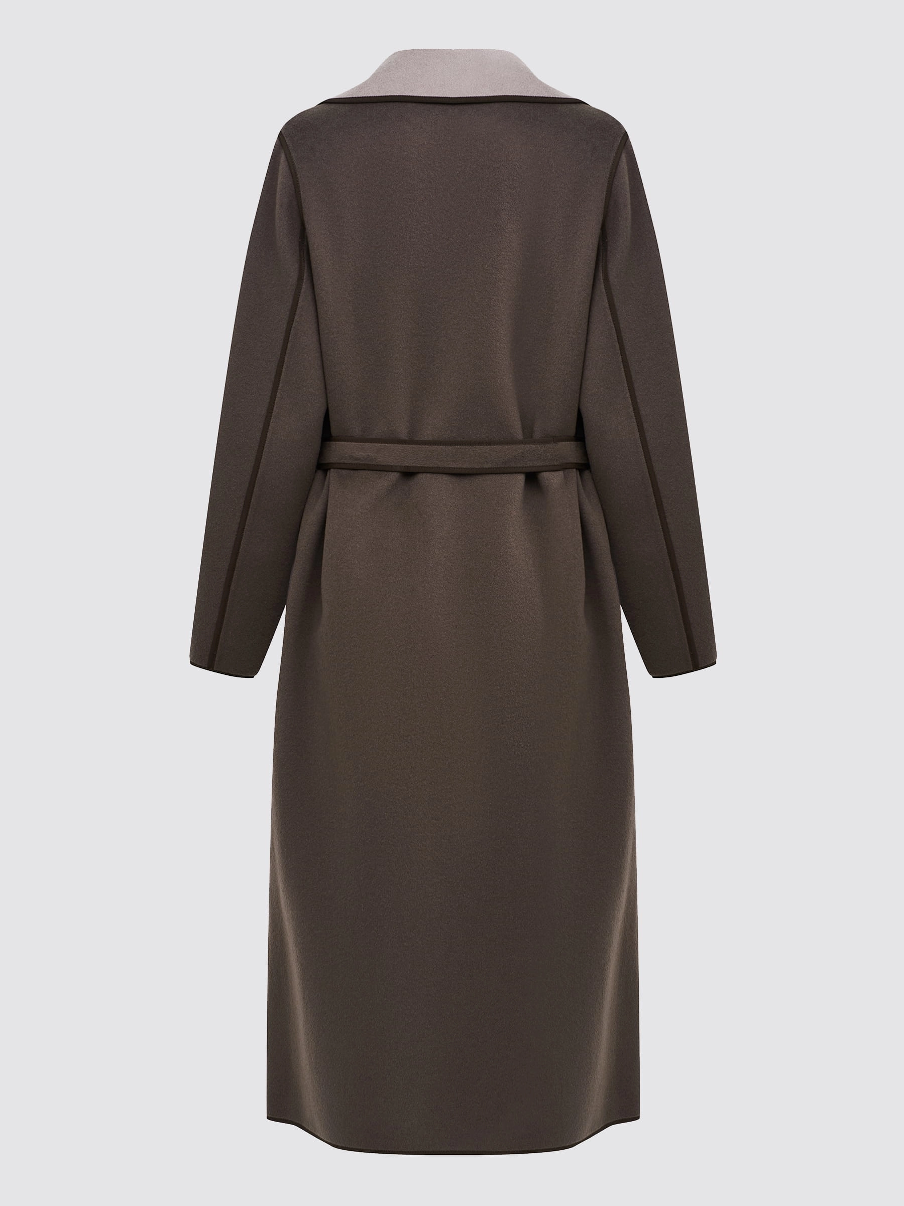 Откройте для себя магию английского стиля в его самом утонченном проявлении! Это длинное женское пальто из кашемира премиум-класса в изысканном темно-коричневом оттенке покоряет своей благородной сдержанностью и продуманной эстетикой. Модель прямого силуэта длиной 125 см с элегантным английским воротником и широкими лацканами создает безупречно строгий, но при этом удивительно женственный образ. Два накладных кармана добавляют практичности, а спущенная линия плеча дарит свободу движений и расслабленный силуэт. Особая гордость модели — изысканная отделка тонким кантом в тон по лацканам, карманам и рукавам: этот деликатный дизайнерский прием мягко выделяет архитектуру пальто, добавляя графичности и подчеркивая исключительное качество исполнения. Вместо традиционной застежки здесь длинный пояс, который позволяет легко менять настроение образа: носите пальто свободно, или подчеркните талию, создавая изящный женственный силуэт. Пальто выполнено из нежного, легкого кашемира премиум-класса, который дарит тепло, мягк