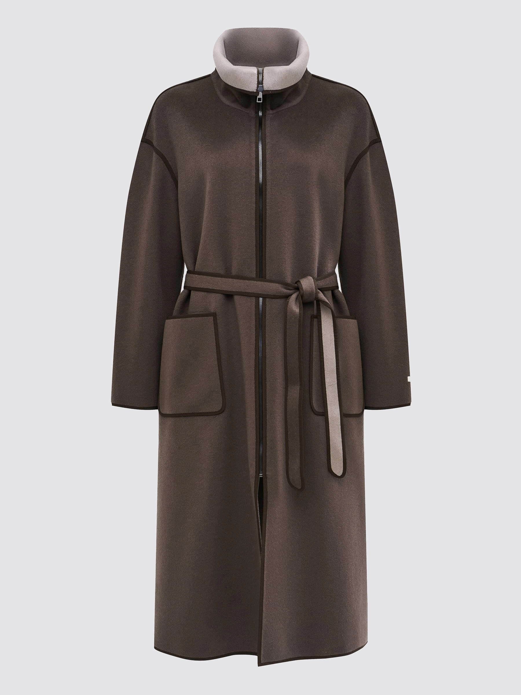 Современная классика встречает архитектурный минимализм! Это длинное женское пальто из кашемира премиум-класса — истинное воплощение лаконичной элегантности. Модель прямого силуэта длиной 120 см с высоким воротником-стойкой создает строгий, но при этом удивительно женственный образ. Спущенная линия плеча дарит свободу движений и расслабленный силуэт, а два накладных кармана добавляют функциональности. Особая гордость модели — изысканная отделка тонким кантом в тон по воротнику, карманам и рукавам: этот деликатный дизайнерский прием мягко выделяет архитектуру пальто, добавляя графичности и подчеркивая исключительное качество исполнения. Продуманная система застежек — центральная молния и боковые разрезы на молниях — позволяет не только легко надевать пальто, но и менять посадку по фигуре: расстегните боковые молнии, чтобы добавить свободы движениям и создать более расслабленный силуэт, или застегните для строгого прямого кроя. Пальто выполнено из нежного, легкого кашемира премиум-класса, который дарит тепло, м