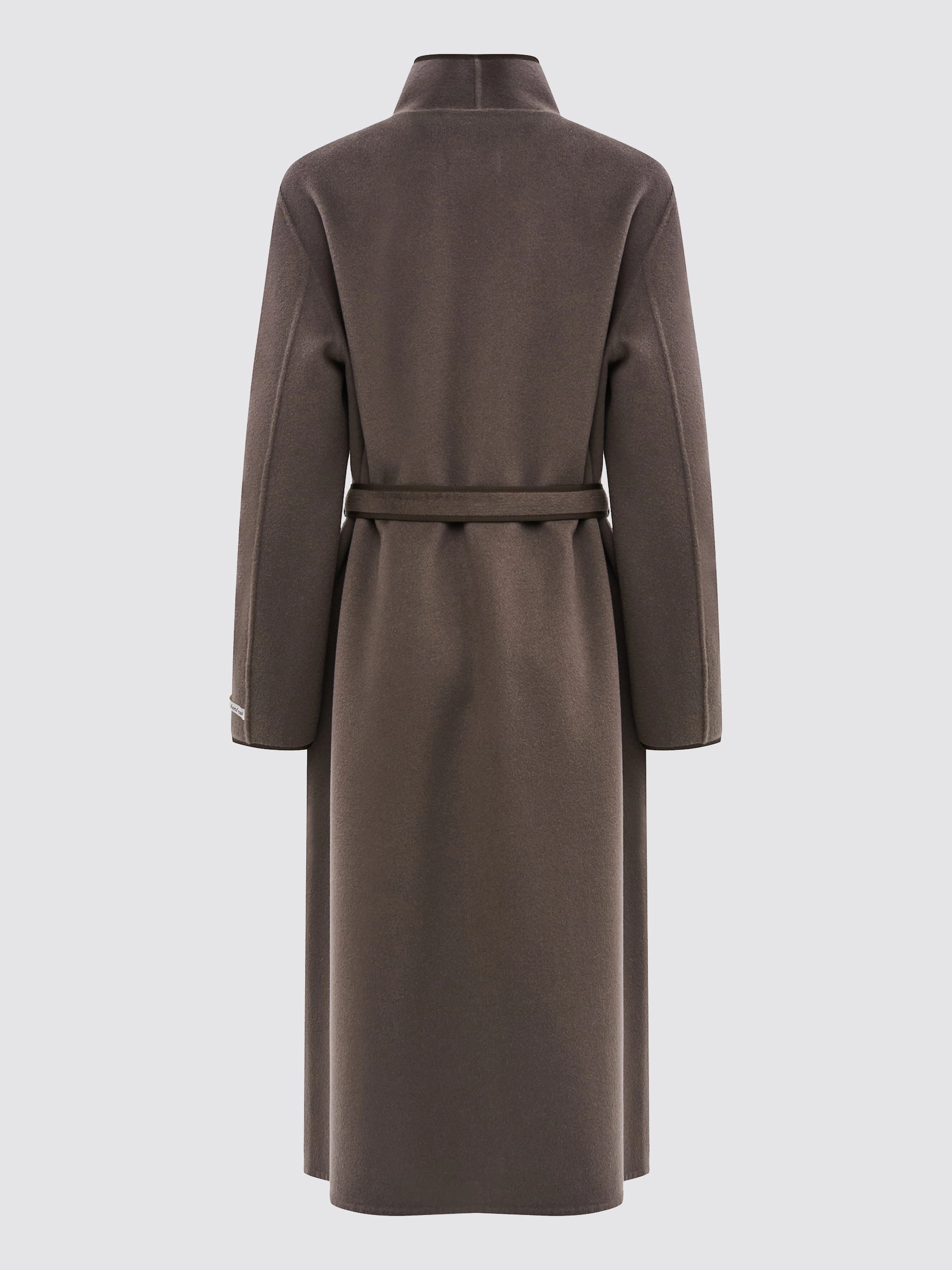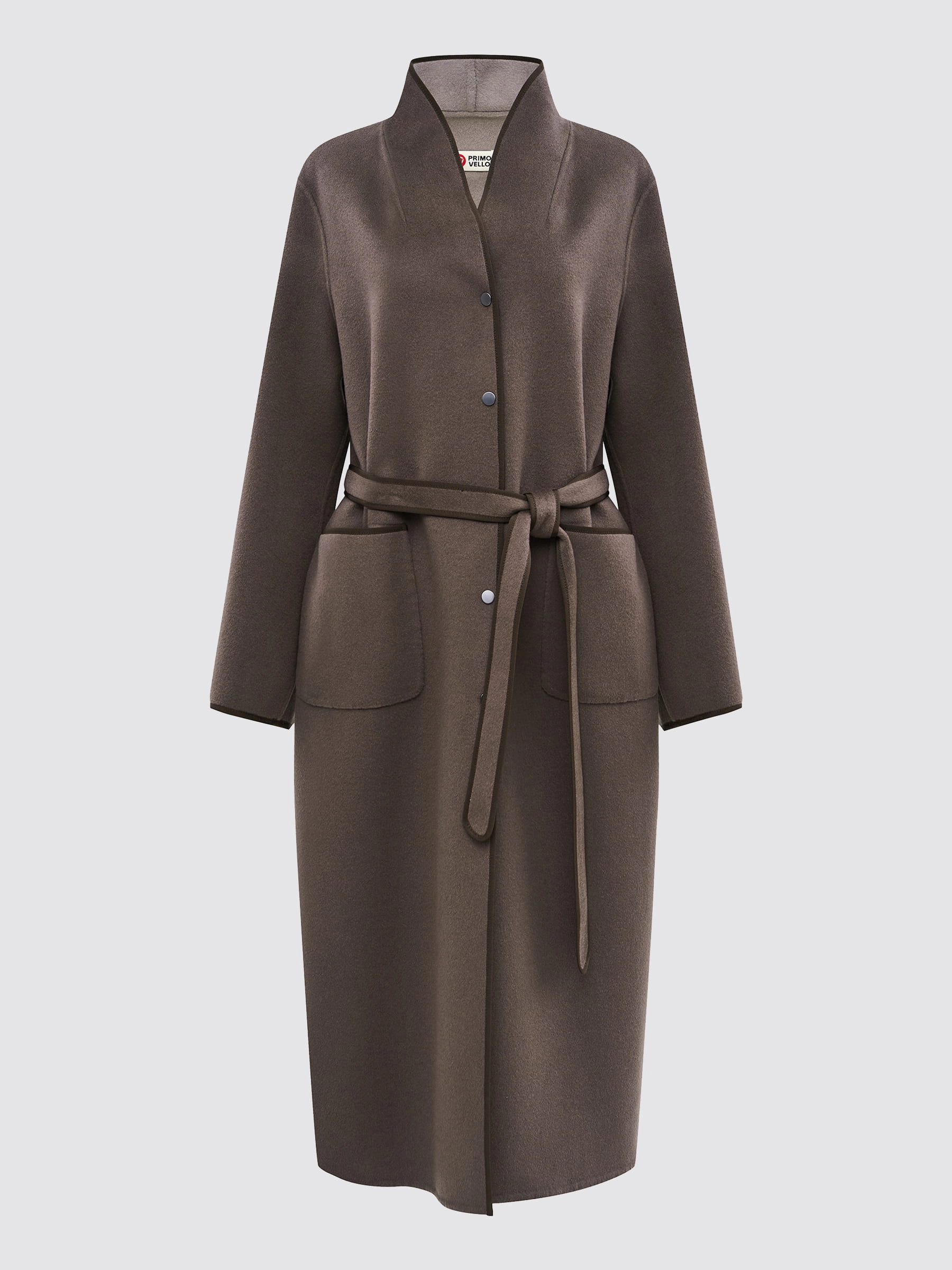 Длинное женское пальто из кашемира премиум-класса прямого силуэта длиной 125 см в благородном темно-коричневом оттенке: мягкий шалевый воротник, спущенная линия плеча и два накладных кармана подчеркивают элегантную простоту, застежка на кнопках добавляет лаконичности, длинный пояс позволяет создавать женственный силуэт, нежный легкий кашемир и ручная работа превращают эту модель в истинное сокровище гардероба, а полное отсутствие подкладки дарит невесомость и ощущение комфорта, словно второе дыхание!