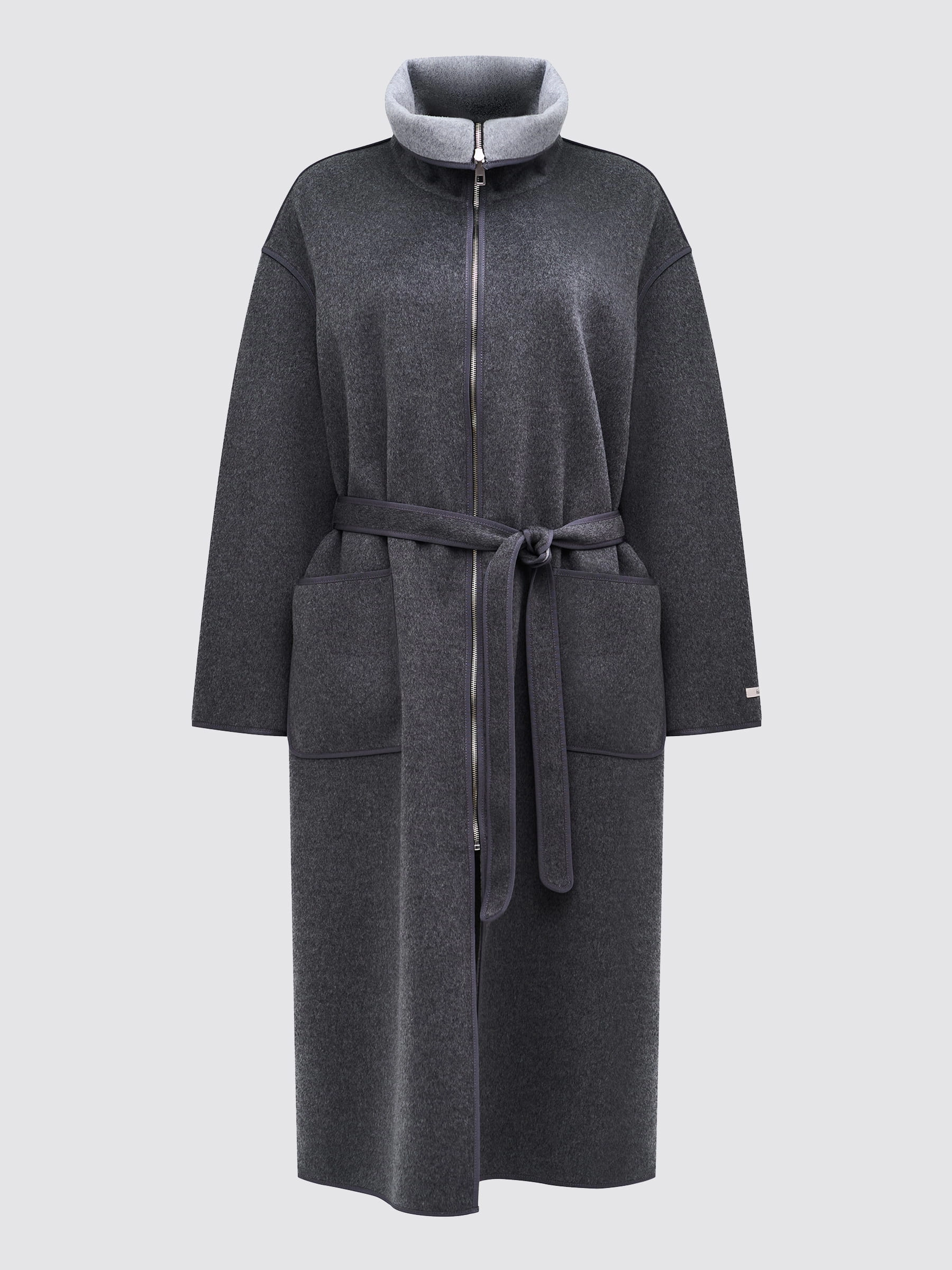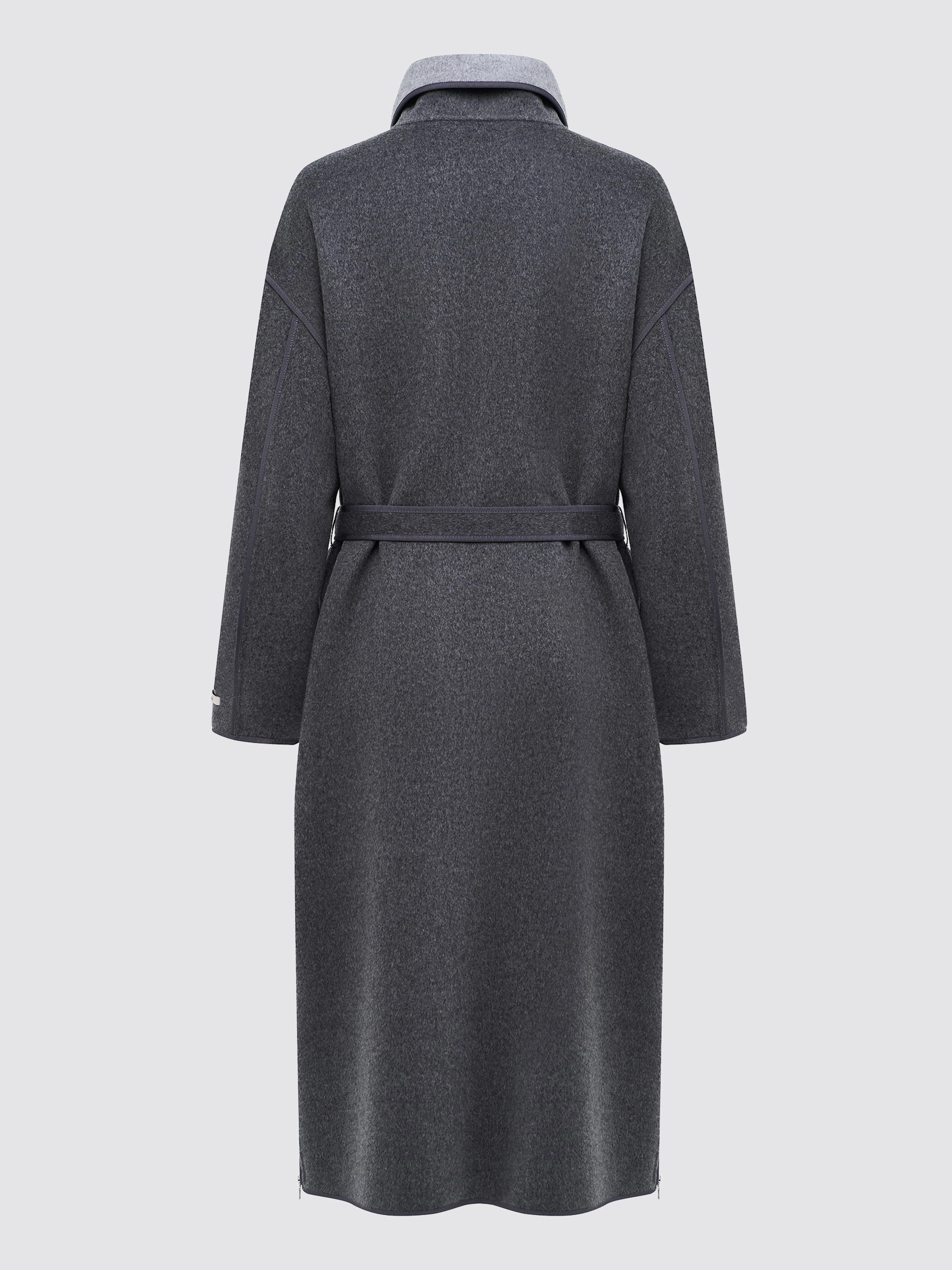Благородство темно-серого в безупречном исполнении! Представляем вам кашемировое женское пальто — истинное воплощение современной классики. Модель прямого силуэта длиной 120 см выполнена из нежного, легкого кашемира премиум-класса, который дарит тепло, мягкость и ощущение уюта с первой минуты. Глубокий темно-серый цвет — идеальная база для любого гардероба: он одинаково элегантен в деловом образе и в повседневном луке, легко сочетается как с пастельными, так и с яркими акцентами. Высокий воротник-стойка открывает возможности для трансформации: застегните его для строгого лаконичного силуэта или слегка откиньте, превратив в элегантный воротник-апаш, который мягко обрамляет шею и добавляет женственности. Спущенная линия плеча создает расслабленный, современный крой, а два накладных кармана обеспечивают функциональность, не нарушая чистоты линий. Особую графичность модели придает изысканная отделка тонким кантом в тон по воротнику, карманам и рукавам. Продуманная система застежек позволяет адаптировать посадку п