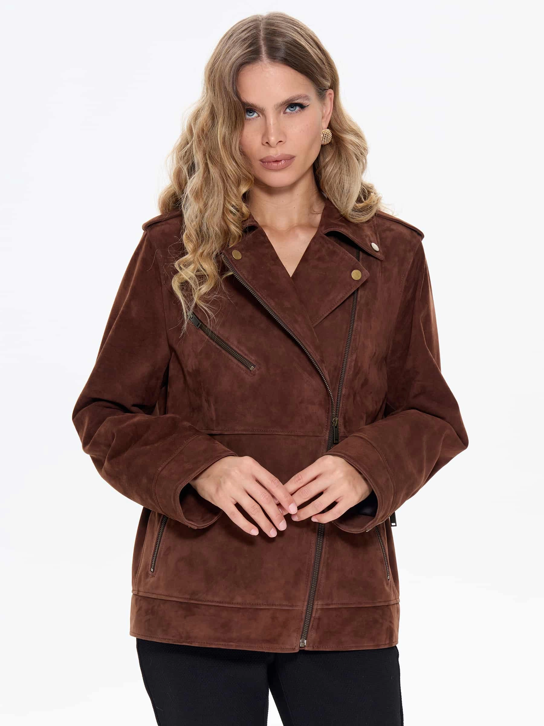 Удлиненную косуху выполнили из замши премиум класса. Прямой крой с втачными рукавами дополнили погонами. Прорезные карманы и манжеты застегиваются крупными молниями. Великолепная посадка по фигуре и свободе движений.
