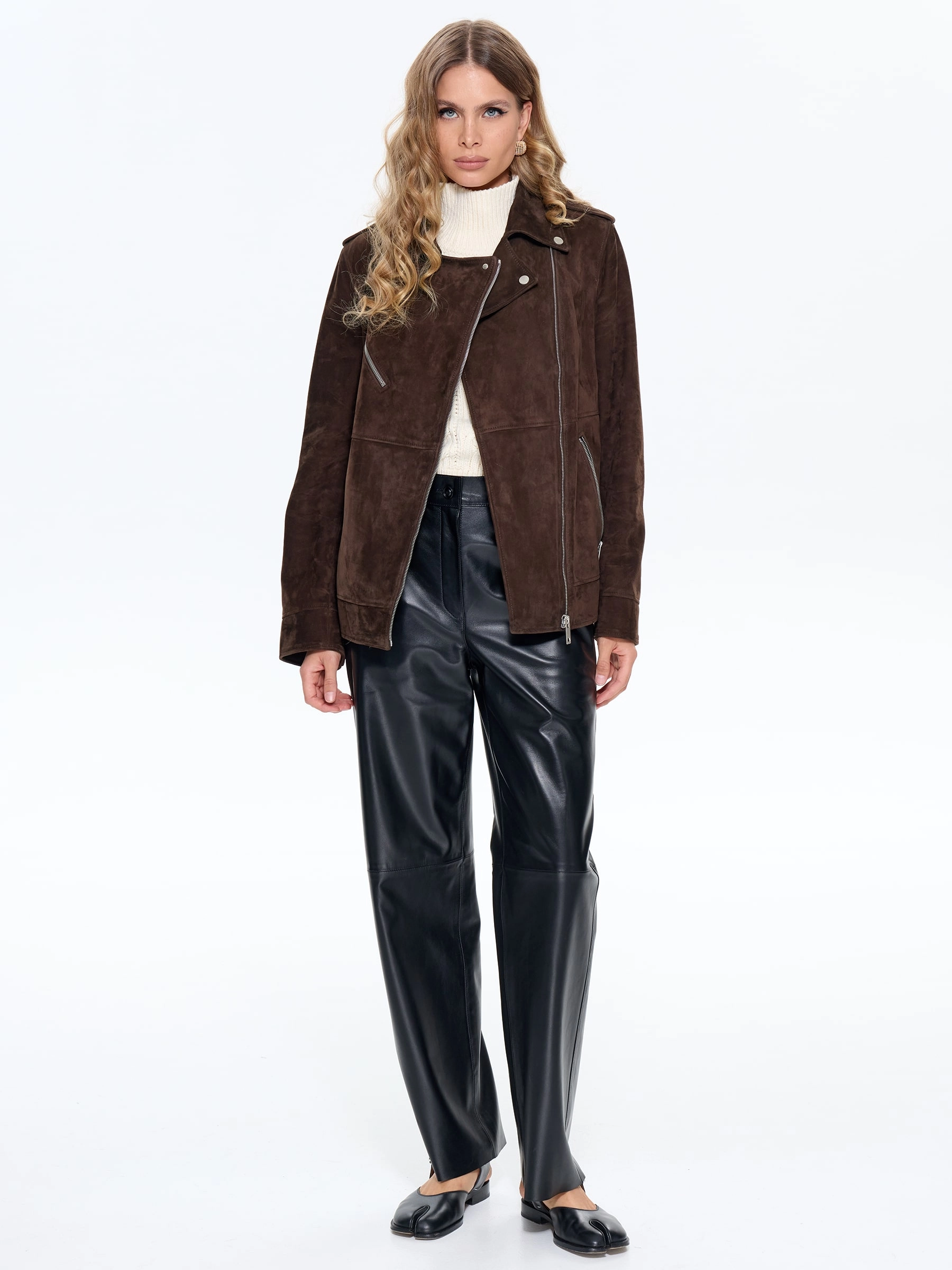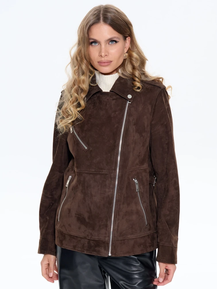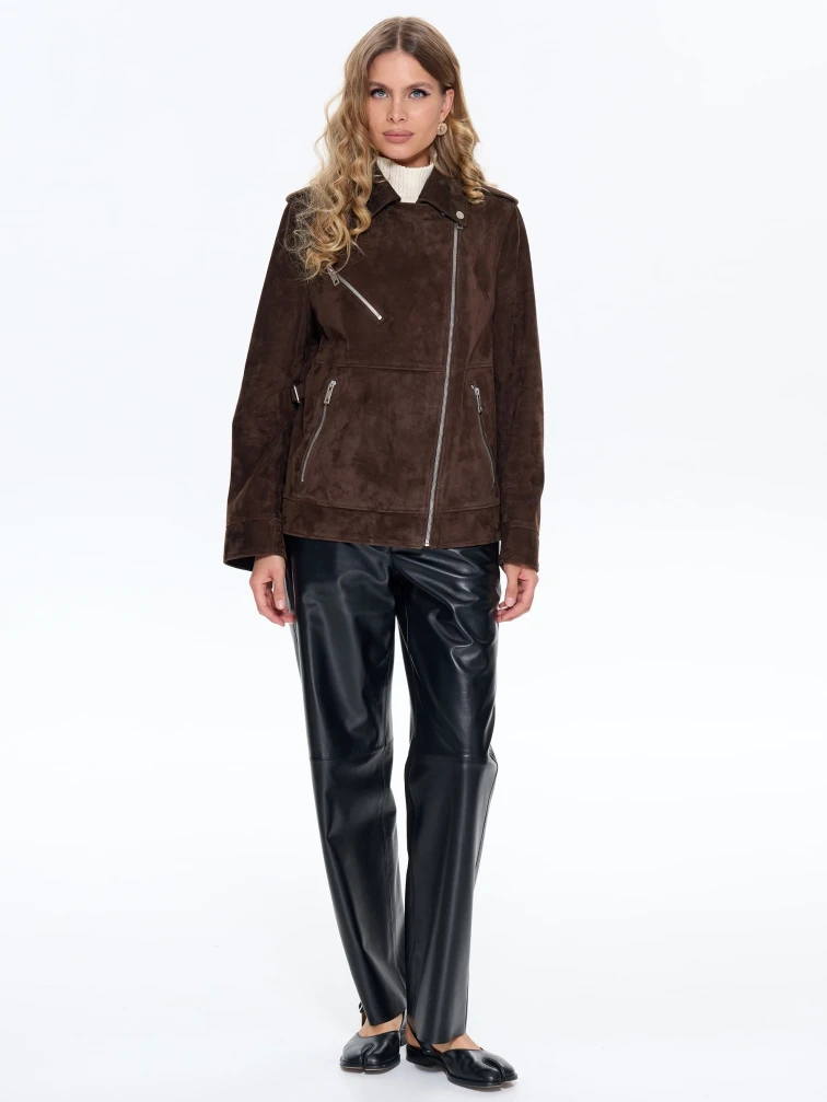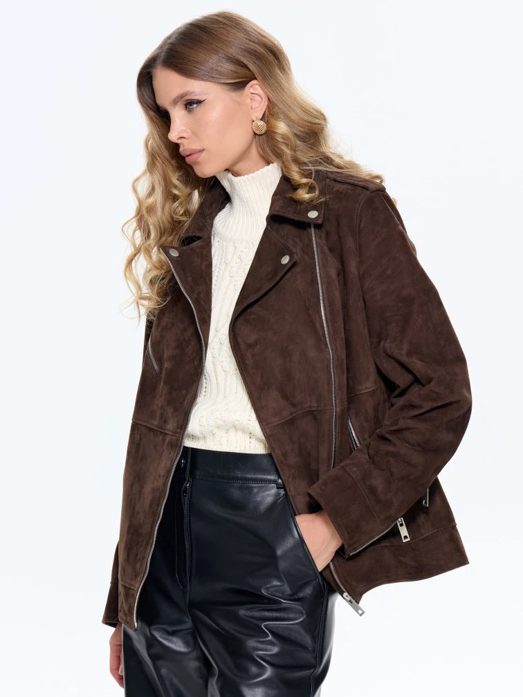 Замшевая женская куртка косуха премиум класса 3079з, коричневая, размер 42, артикул 24700