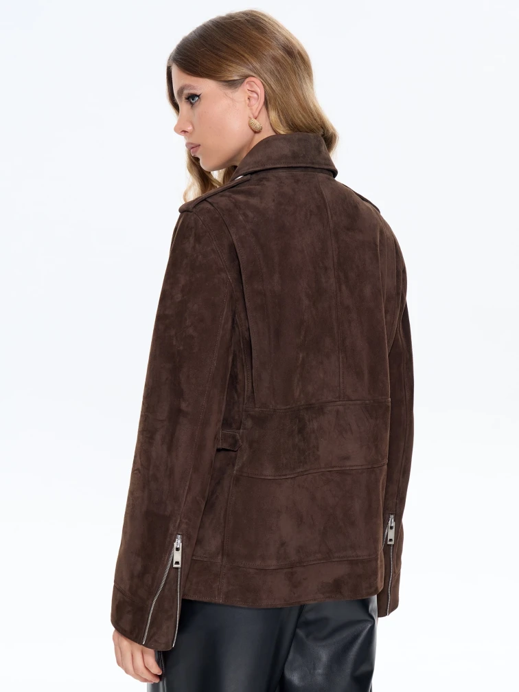 Удлиненную косуху выполнили из замши премиум класса. Прямой крой с втачными рукавами дополнили погонами. Прорезные карманы и манжеты застегиваются крупными молниями. Великолепная посадка по фигуре и свободе движений.