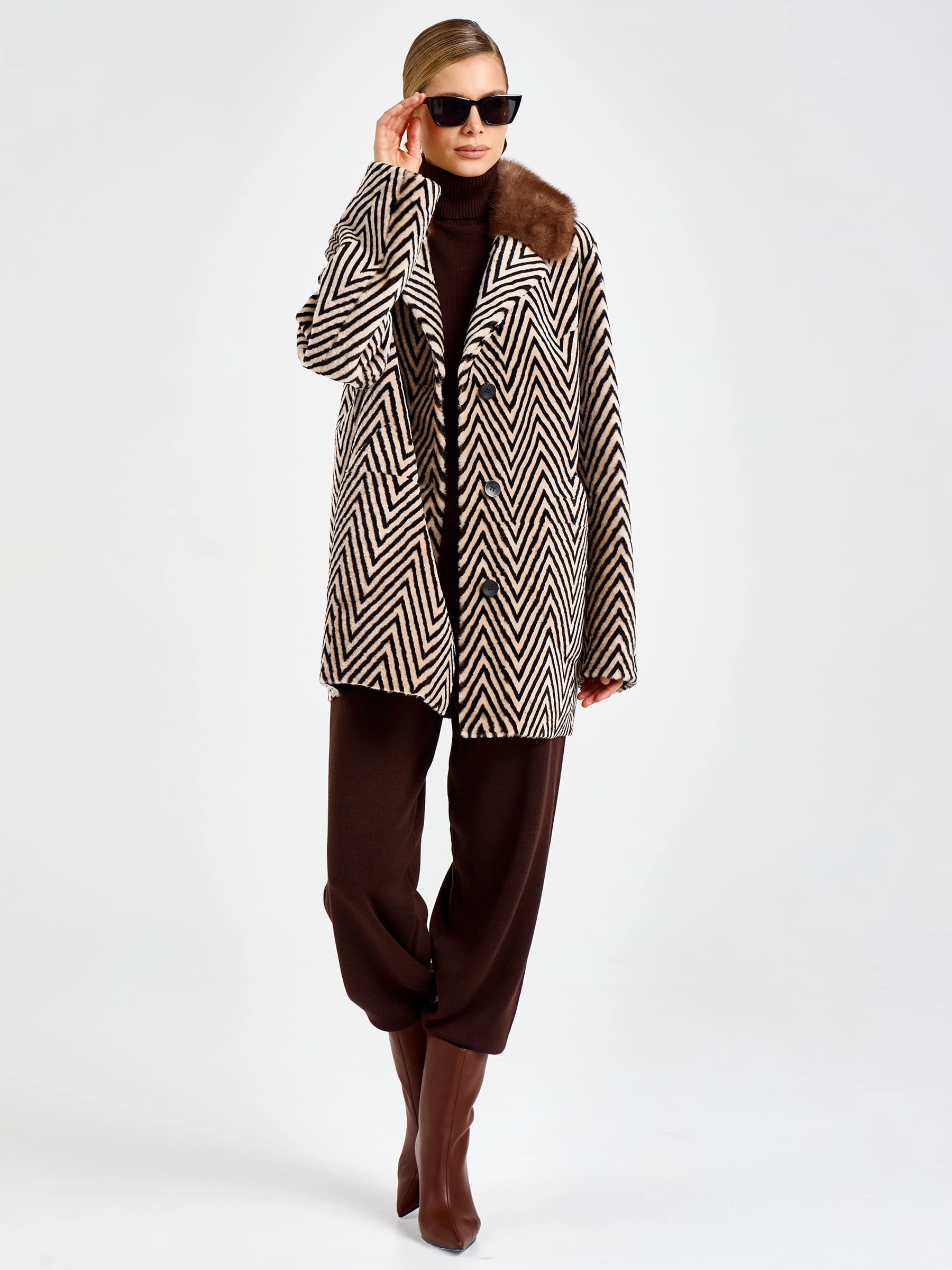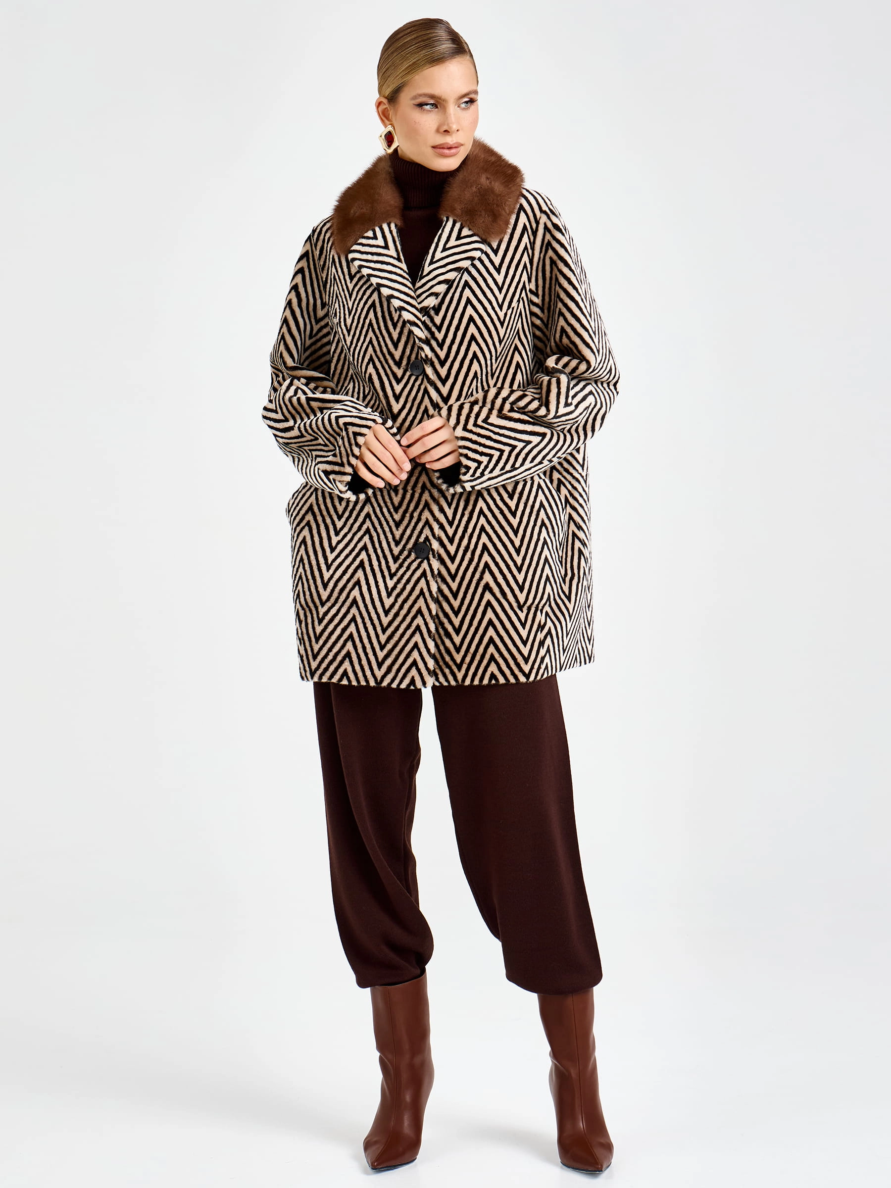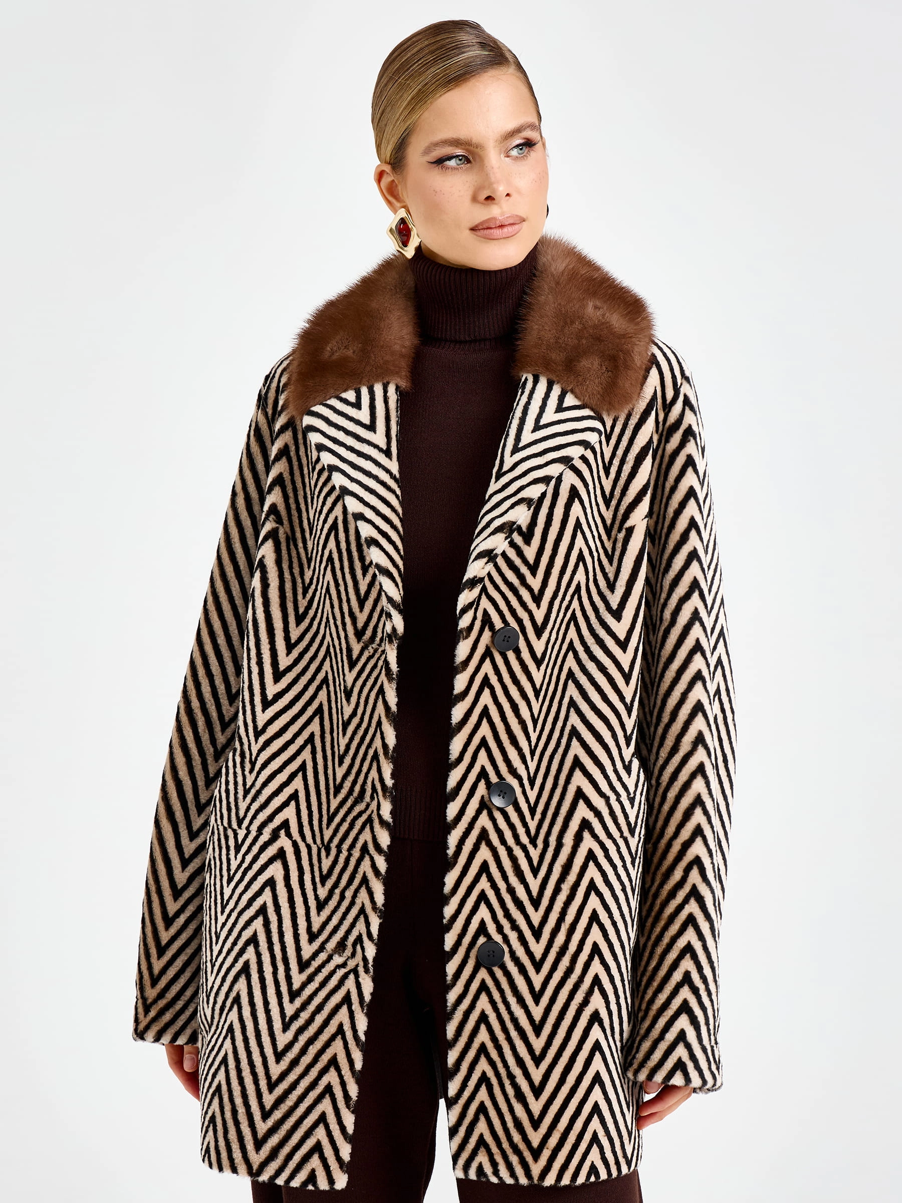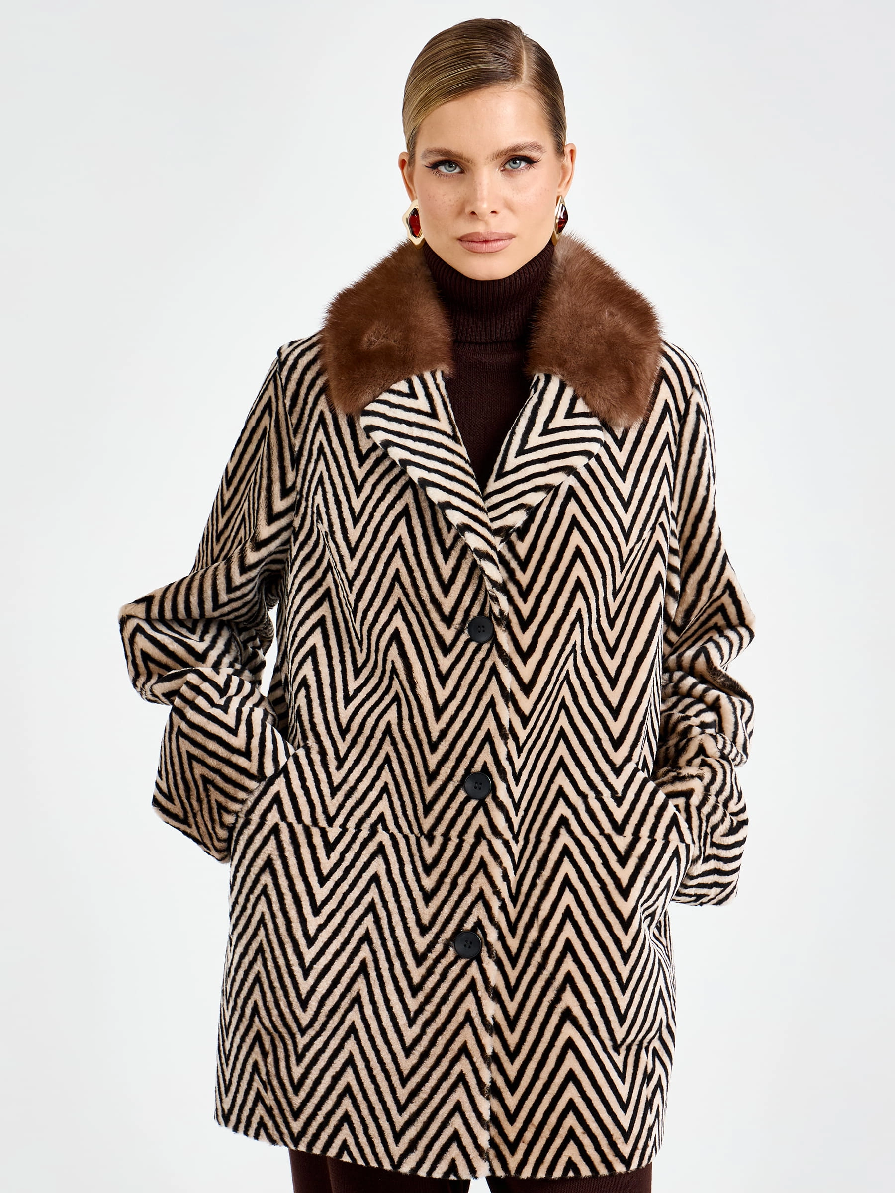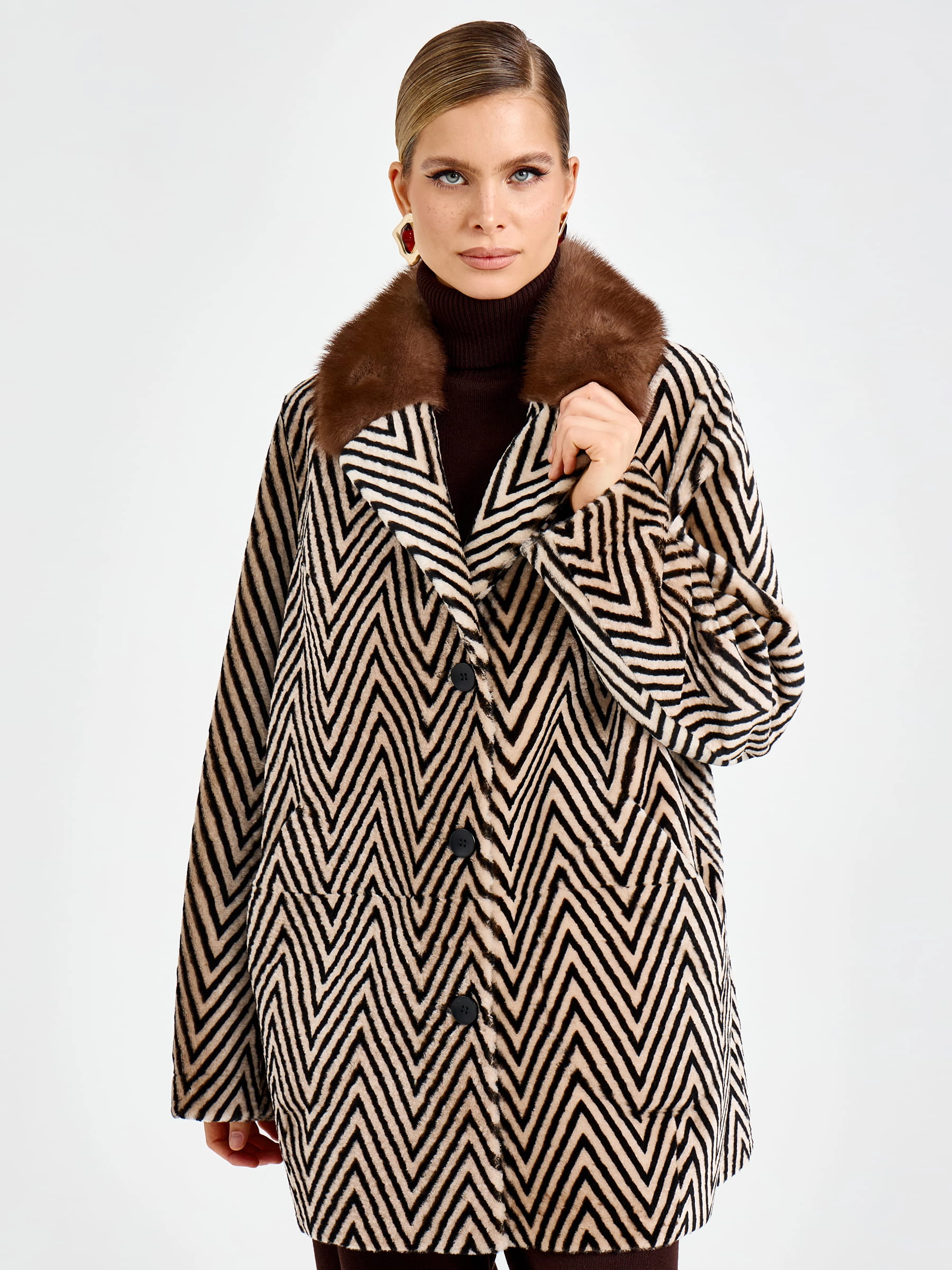 Роскошная женская дубленка прямого силуэта длиной 80 см из натуральной овчины «астраган» премиального качества: английский воротник с широкими лацканами дополнен шелковистым мехом норки, создавая элегантный контраст, а два накладных кармана подчеркивают лаконичный дизайн. Застежка на пуговицы и невероятная легкость модели обеспечивают безупречный комфорт в любой ситуации. Совет стилиста: носите с кожаными брюками и сапогами-ботфортами для вечернего образа или с джинсами-скинни и кашемировым свитером для повседневной элегантности — эта дубленка станет воплощением вашего утонченного вкуса и подарит неповторимое тепло в холодное время года.