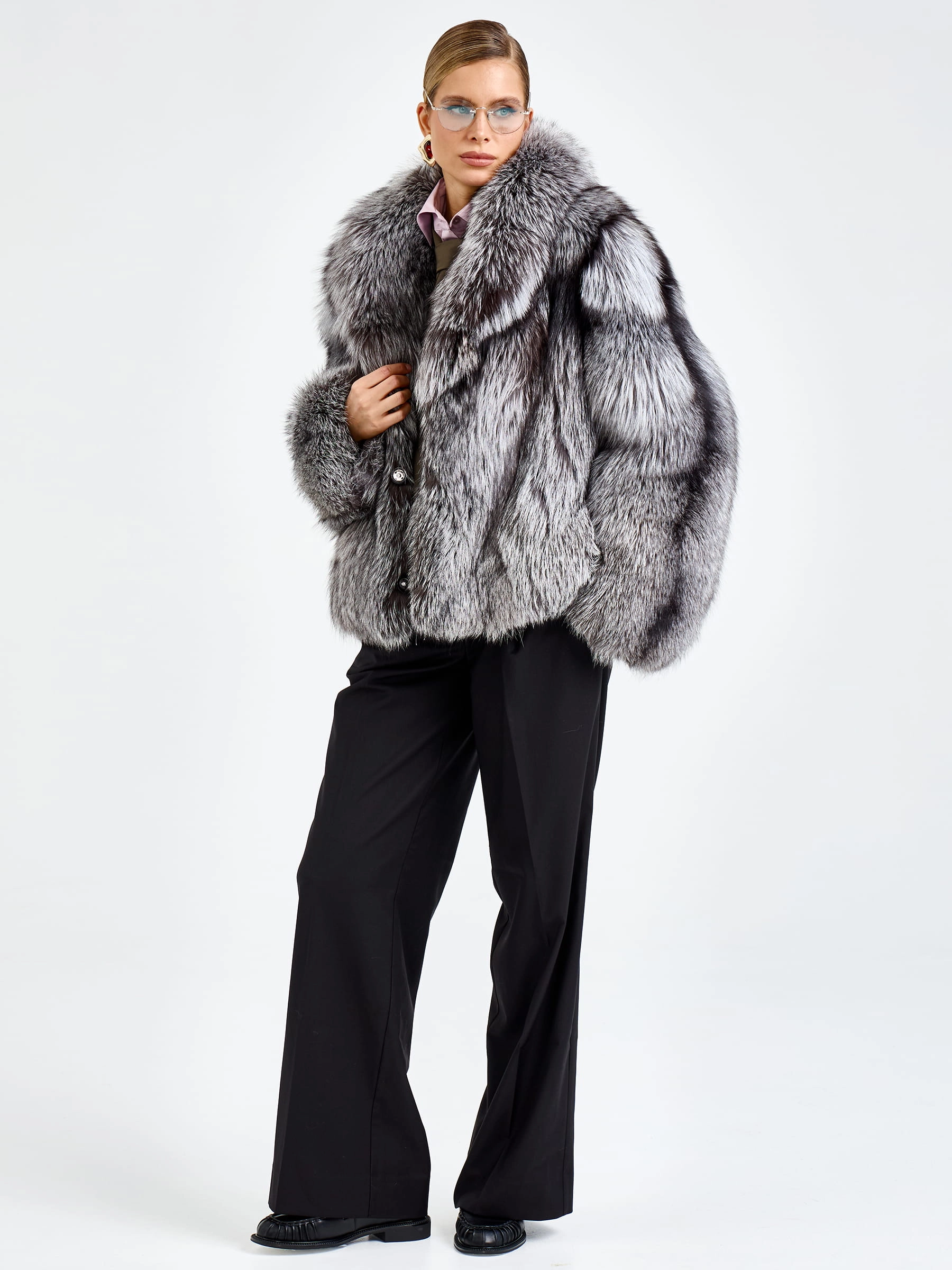 Женская короткая шуба из меха лисы Л1010-1045, серебристо-чёрная, размер 46, артикул 65500