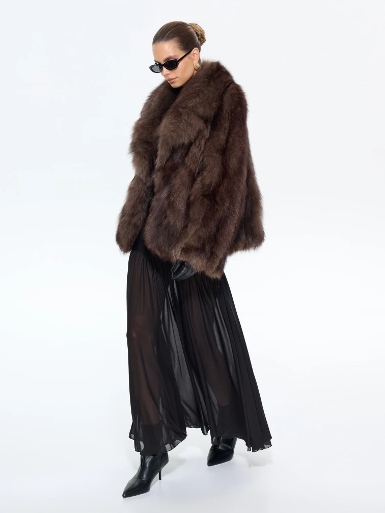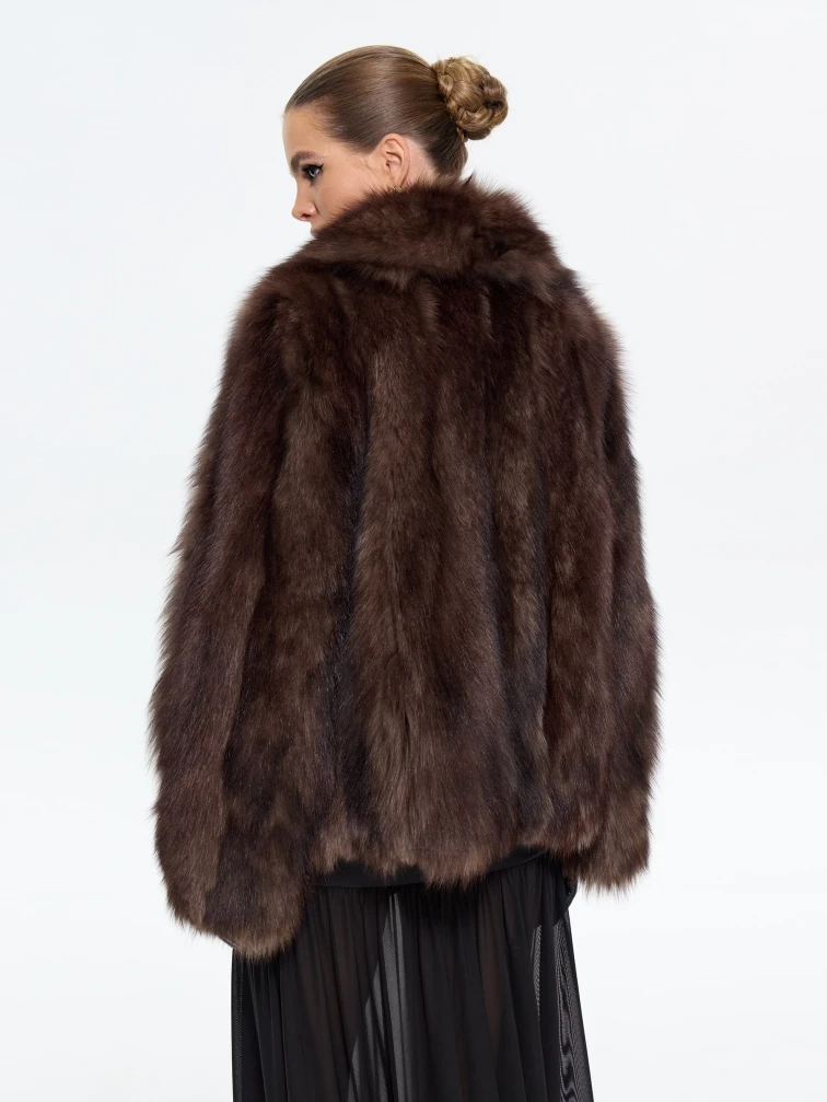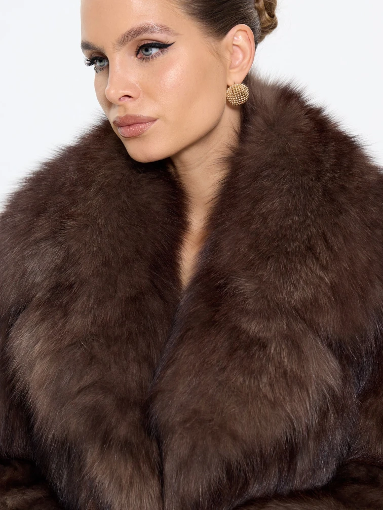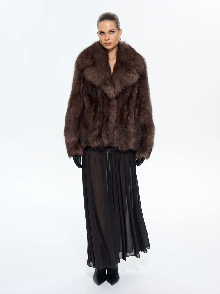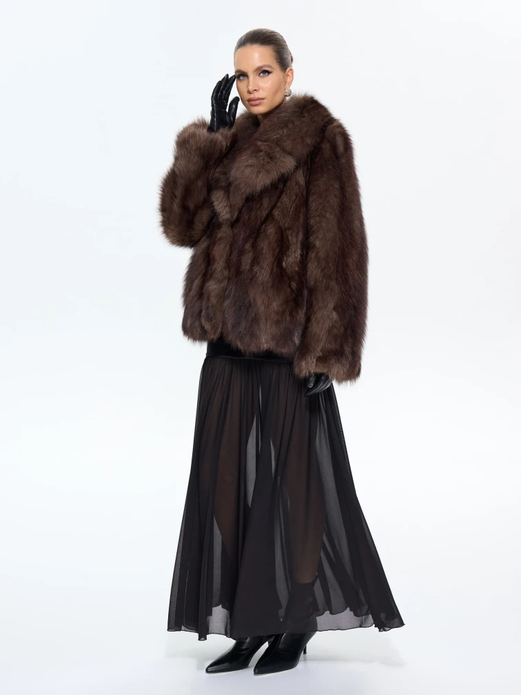 Шуба автоледи из меха лисы с элегантным английским воротником — это идеальное сочетание роскоши и практичности для современной женщины за рулем. Ее прямой силуэт и длина 70 см не стесняют движений, а темно-коричневый цвет подчеркивает богатство меха. Стилисты рекомендуют носить эту модель с объемным свитером, кожаными леггинсами и грубыми ботинками, создавая образ дерзкой и уверенной горожанки, которая ценит комфорт, не жертвуя элегантностью.