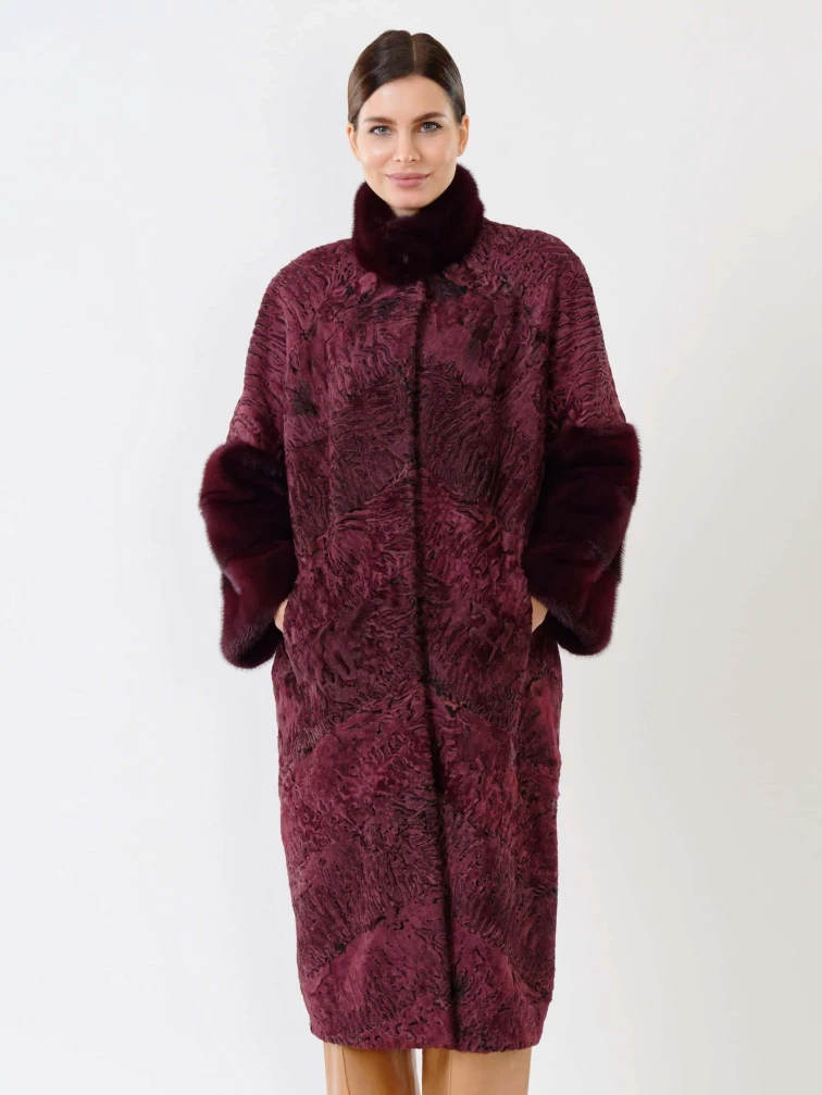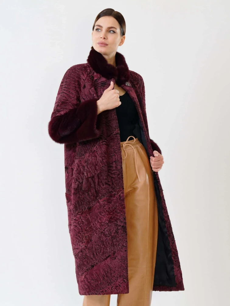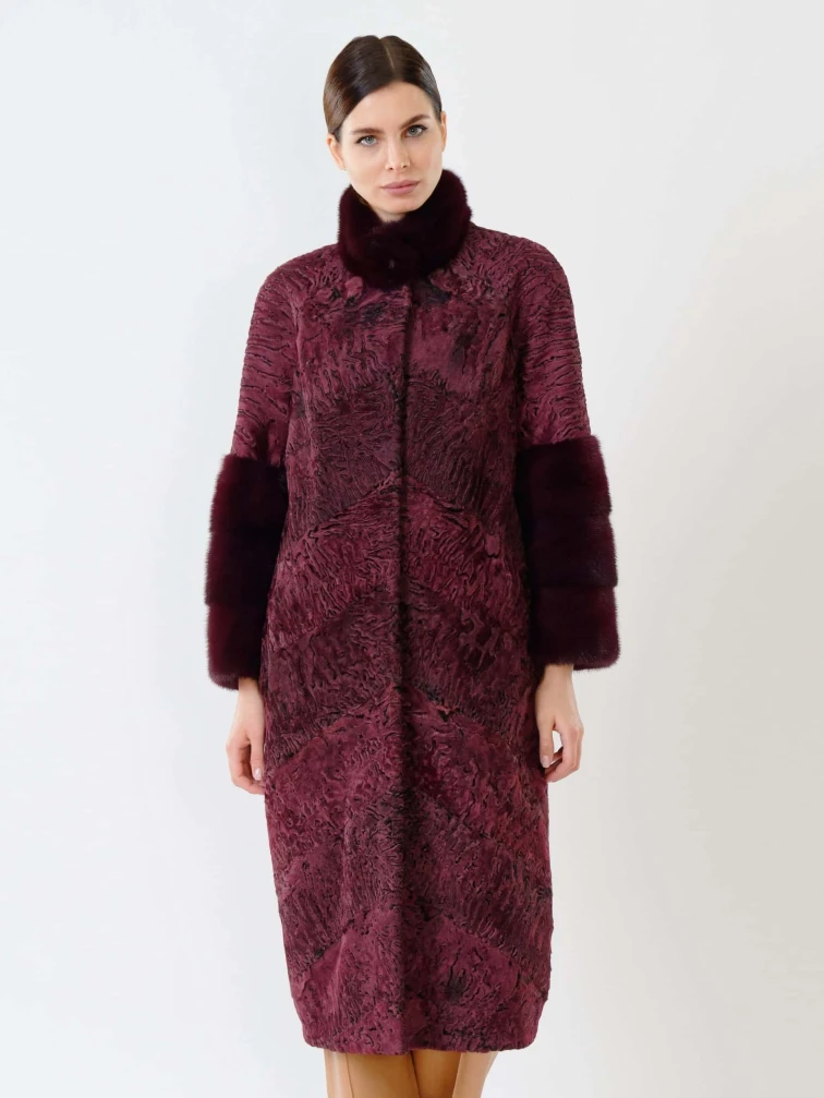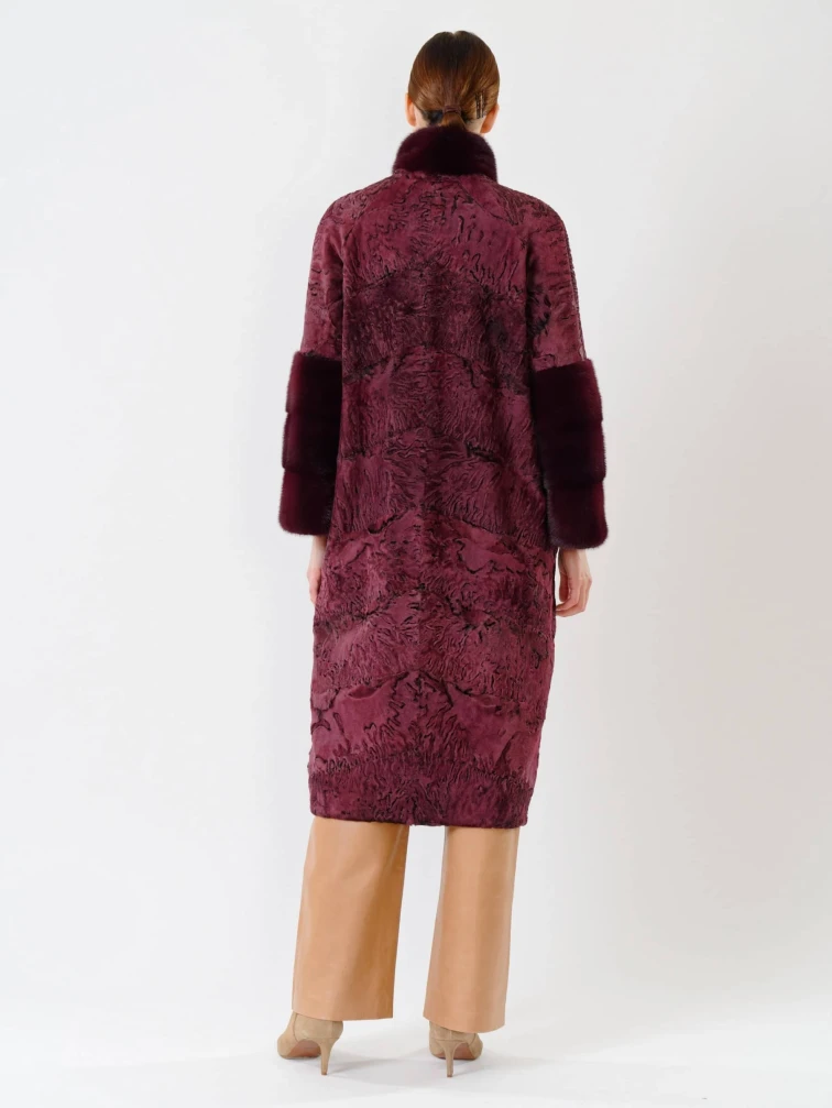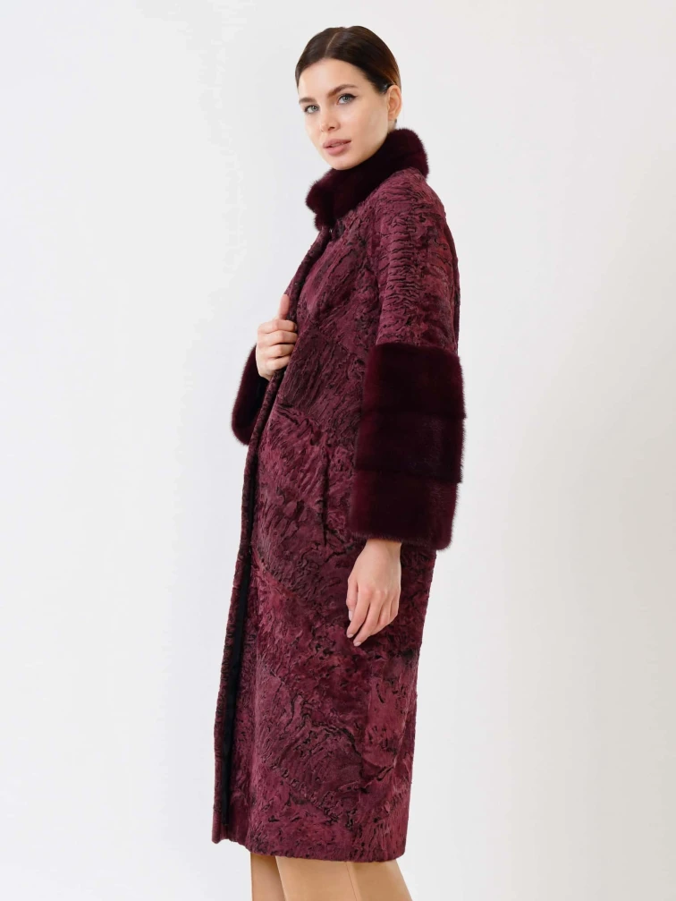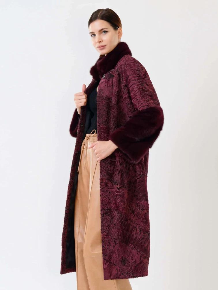 Товар женская шуба из меха каракуля с мехом норки 17101д(сн), бордовая, размер 44, артикул 22620 выполнен из каракуль с застежкой клипсы. Рассчитан на сезон: осень-зима. Длина изделия свыше 90 см, силуэт прямой.