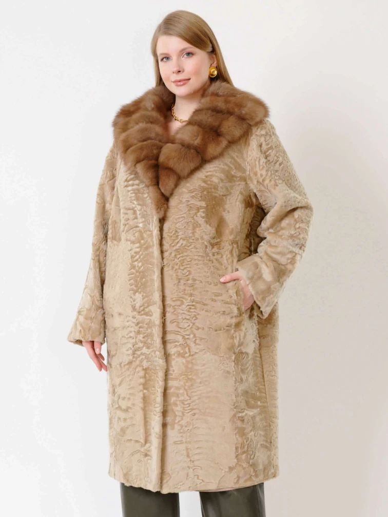 Пальто из афганской каракульчи в цвете сур. Точно подобранный рисунок. Высокое качество меха. Воротник из меха куницы. Ювелирный подбор шкурок по оттенку и структуре волоса. Аккуратная работа портных. Чёткая посадка по фигуре.